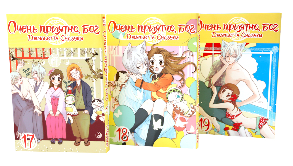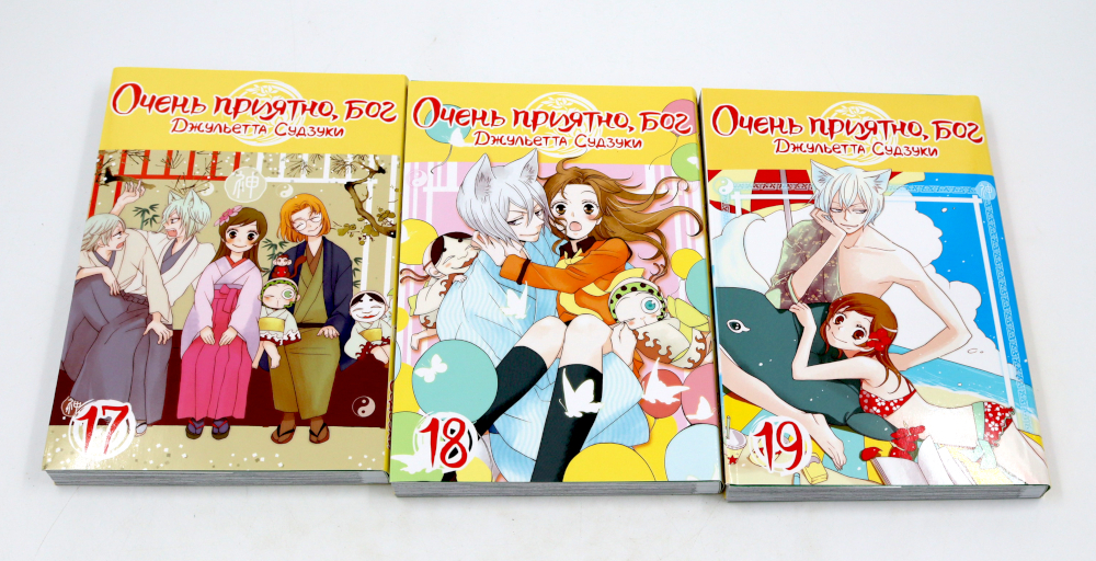 Комплект состоит из трех томов (17-19) манги «Очень приятно, бог». В 17 томе Нанами совершает еще одно путешествие во времени и снова находит падшего бога Куромаро. Тот показывает ей, как причудливо сплелись судьбы в прошлом и будущем, и Нанами наконец понимает, в кого именно был влюблен Томоэ на самом деле, и узнает причину своего странного сходства с Юкидзи... В 18 томе Нанами наконец возвращается в свое время, и выясняется, что ее чувства к Томоэ давно уже взаимны. И все бы хорошо, но школу и обязанности богини никто не отменял. Томоэ ради Нанами хочет лучше освоиться в мире людей и берется за учебу, и сама она тоже, решив не отставать, начинает с пылом готовиться к экзаменам. Выходит, даже рядом с любимым будни часто - тяжелый труд, а не один только праздник!.. А в школе тем временем планируется экскурсия на Окинаву, о которой Нанами давно мечтала... В 19 томе Томоэ едва успевает спасти Нанами после того, как ее божественную силу забирает Кирихито. В это же время Мидзуки и Курама пробираются в грот Унари, чтобы выручить Ами. Им нужно торопиться - еще чуть-чуть, и Ами потеряет воспоминания и навсегда останется дюгонем! Удастся ли друзьям усмирить гнев сирены и шторм, разразившийся над Окинавой?..| Издательство | ЭксЭл Медиа |