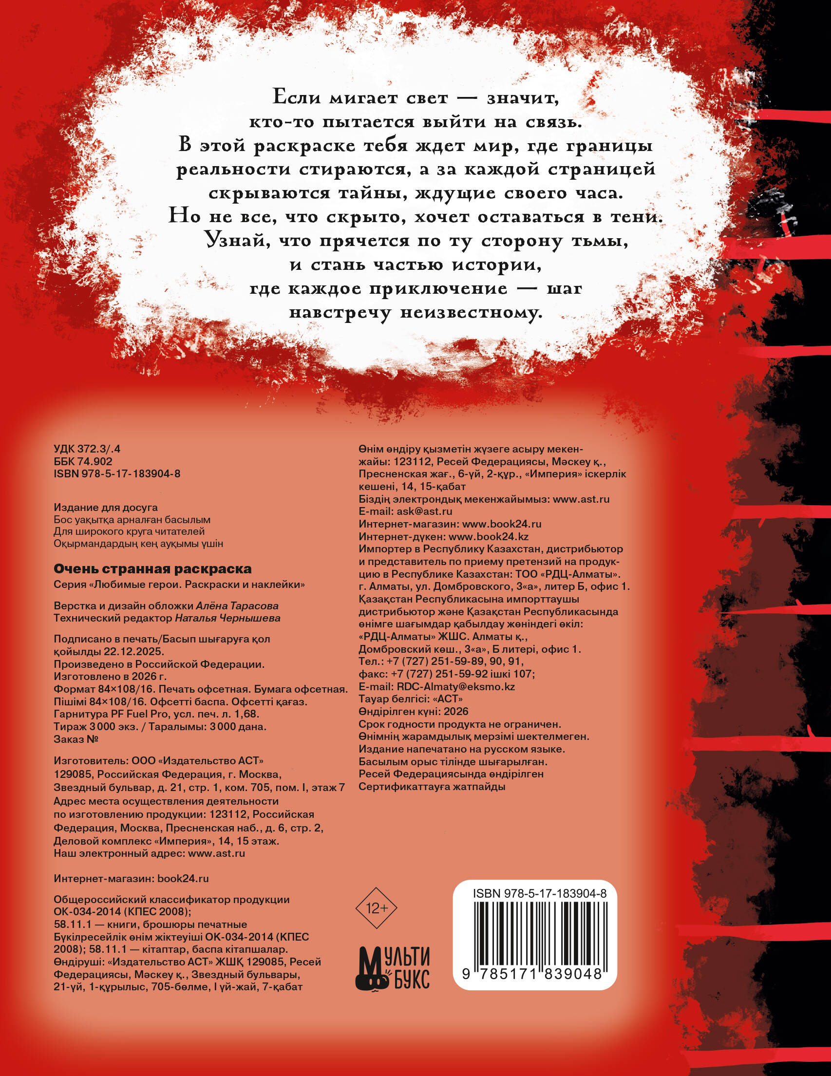 Если мигает свет - значит, кто-то пытается выйти на связь. В этой раскраске тебя ждет мир, где границы реальности стираются, а за каждой страницей скрываются тайны, ждущие своего часа. Но не все, что скрыто, хочет оставаться в тени. Узнай, что прячется по ту сторону тьмы, и стань частью истории, где каждое приключение - шаг навстречу неизвестному.| Издательство | Издательство "АСТ" |