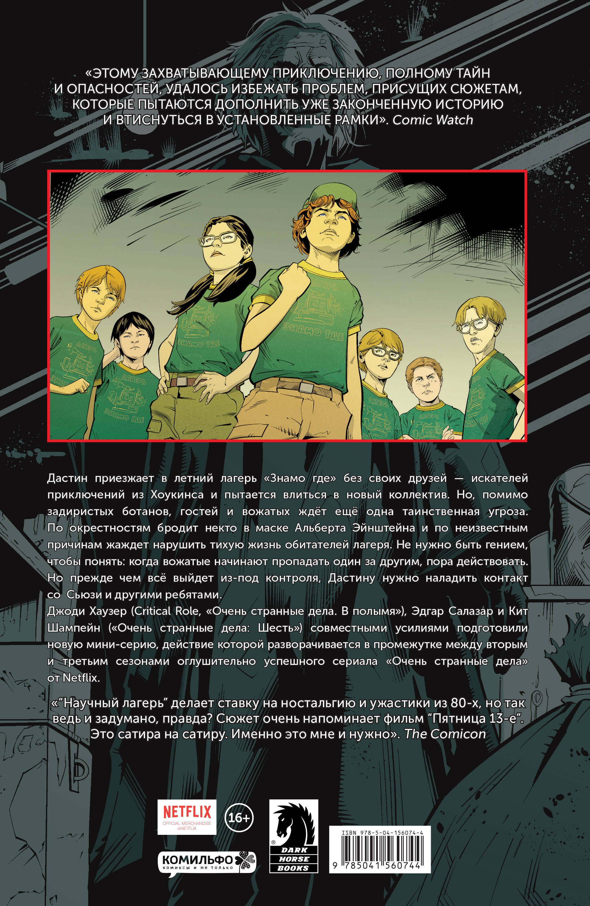 Дастин приезжает в летний лагерь «Знамо где» без своих друзей - искателей приключений из Хоукинса и пытается влиться в новый коллектив. Но, помимо задиристых ботанов, гостей и вожатых ждёт ещё одна таинственная угроза. По окрестностям бродит некто в маске Альберта Эйнштейна и по неизвестным причинам жаждет нарушить тихую жизнь обитателей лагеря. Не нужно быть гением, чтобы понять: когда вожатые начинают пропадать один за другим, пора действовать. Но прежде чем всё выйдет из-под контроля, Дастину нужно наладить контакт со Сьюзи и другими ребятами. Джоди Хаузер (Critical Role, «Очень странные дела. В полымя»), Эдгар Салазар и Кит Шампейн («Очень странные дела: Шесть») совместными усилиями подготовили новую мини-серию, действие которой разворачивается в промежутке между вторым и третьим сезонами оглушительно успешного сериала «Очень странные дела» от Netflix.| Издательство | ООО "Издательство "Эксмо" |
