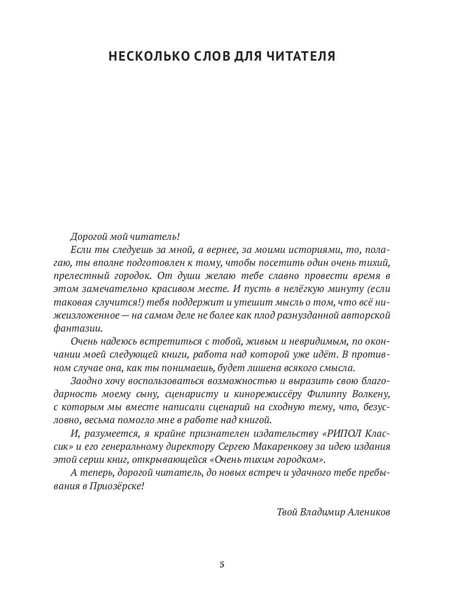 Новый роман мастера «Очень тихий городок» представляет собой густой замес из трёх жанров - триллера, детектива и хоррора. Читателя ждёт захватывающая история из жизни золотой молодёжи, живущей в лесном городке Приозёрске на берегу живописного озера Красавица. Алеников вновь доказывает, что он не только блестящий режиссёр, но и талантливый писатель, обладающий даром приковывать читательское внимание.| Издательство | Рипол Классик |