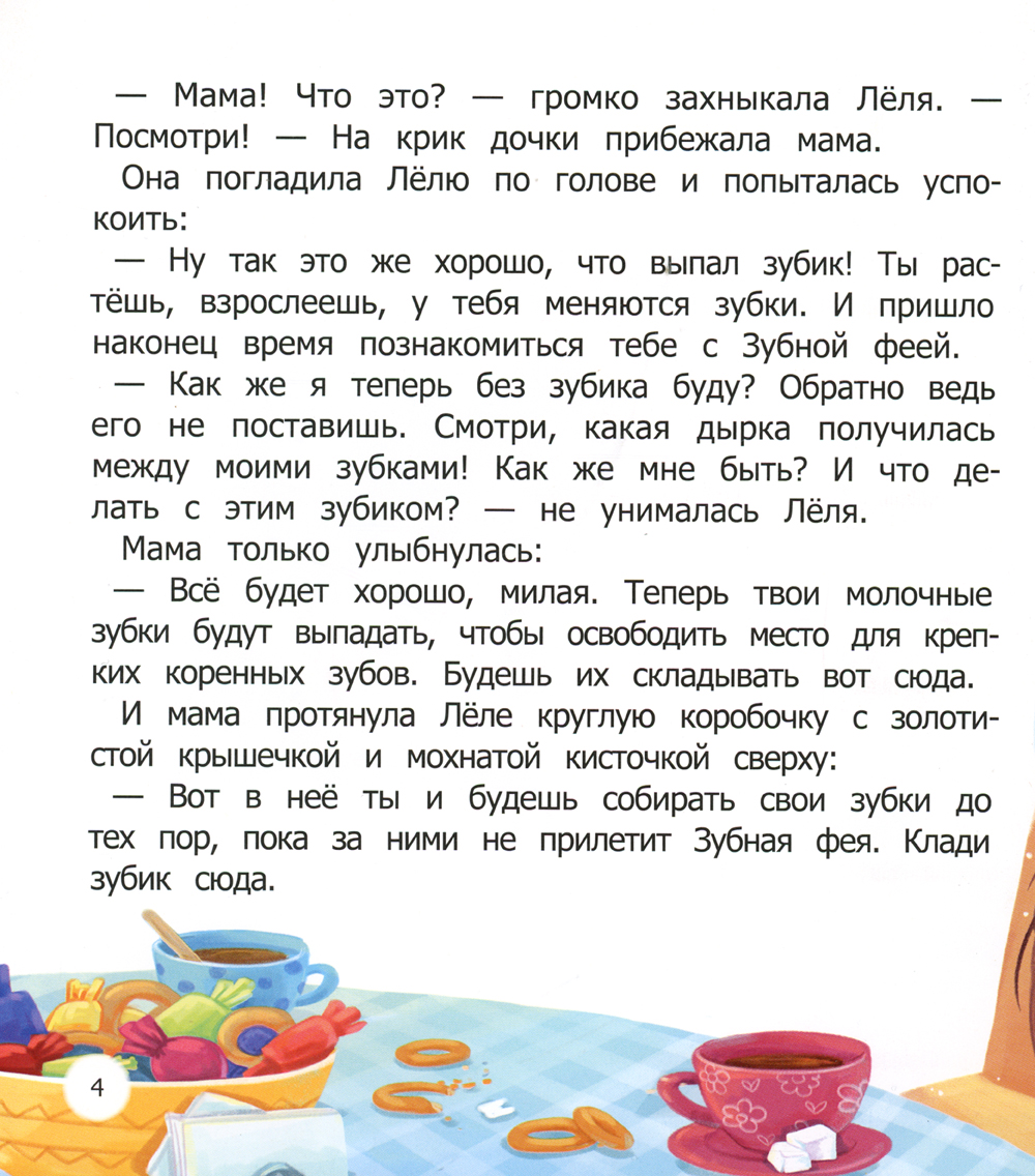 Вот и настал тот самый момент - у Лёли выпал первый зуб! Что же теперь делать? Конечно, ждать Зубную фею! Но наша фея не простая, а очень умная. Поэтому она начинает рассказывать Лёле о том, почему выпадают молочные зубы, как правильно проводить гигиену полости рта, в каких случаях можно самостоятельно удалить молочный зуб, а в каких - стоит обратиться к врачу. Весёлая история с полезными советами не только для детей, но и для их родителей.| Издательство | Феникс |