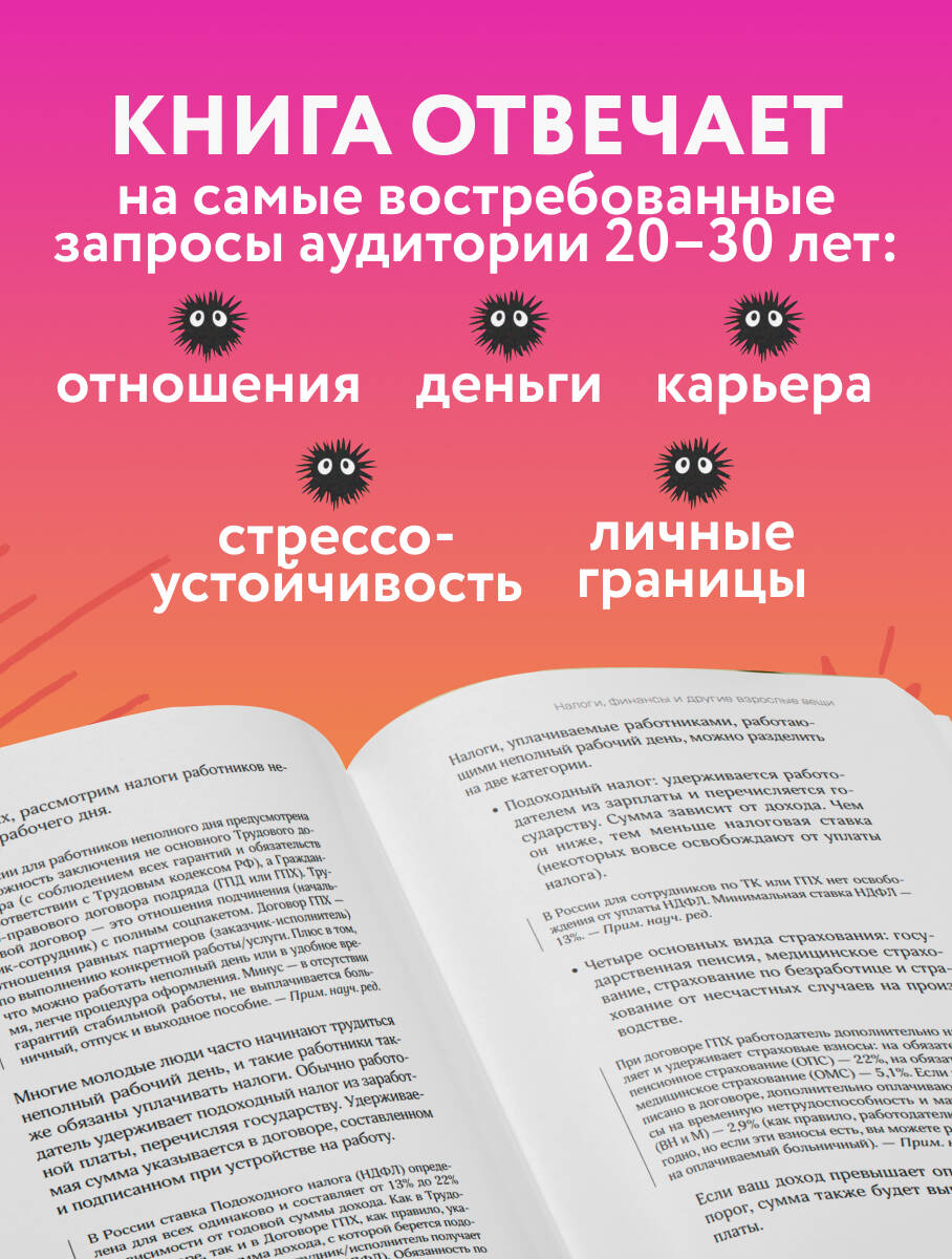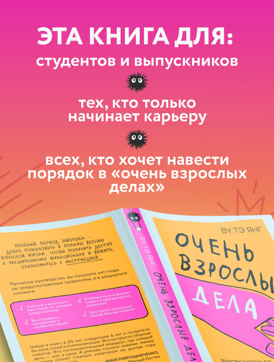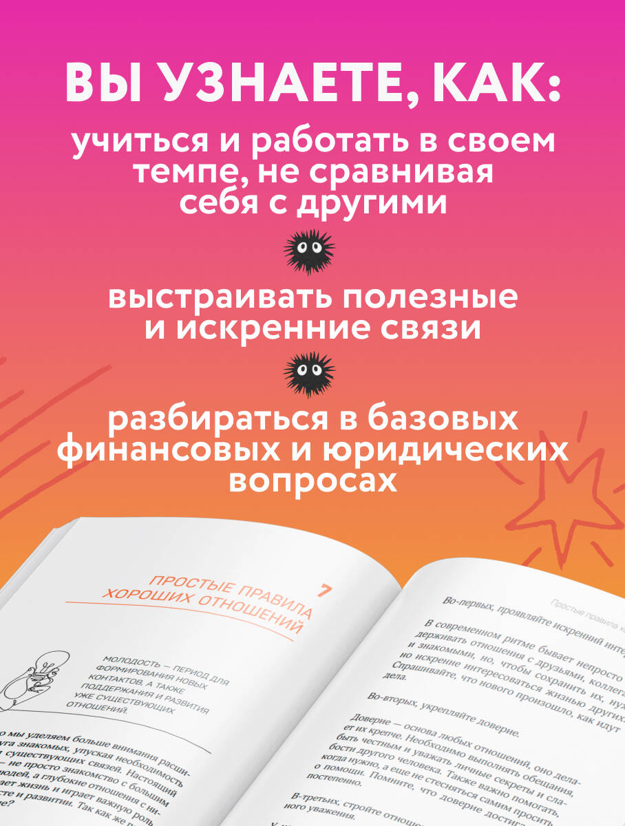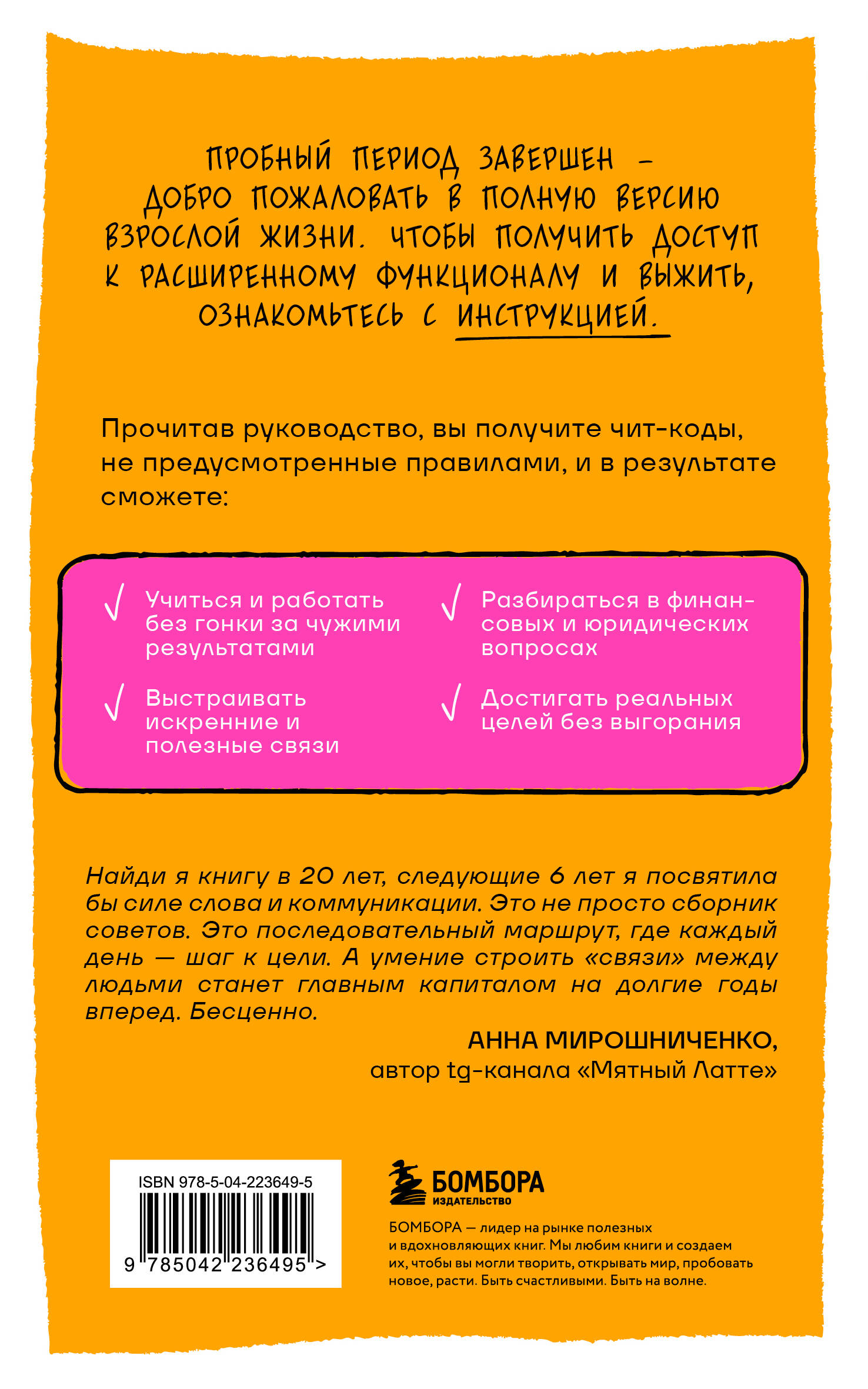 Пробный период завершен - добро пожаловать в полную версию взрослой жизни. Чтобы получить доступ к расширенному функционалу и выжить, ознакомьтесь с инструкцией. Прочитав руководство, вы получите чит-коды, не предусмотренные правилами, и в результате сможете: - учиться и работать без гонки за чужими результатами; - выстраивать искренние и полезные связи; - разбираться в финансовых и юридических вопросах; - достигать реальных целей без выгорания.| Издательство | ООО "Издательство "Эксмо" |