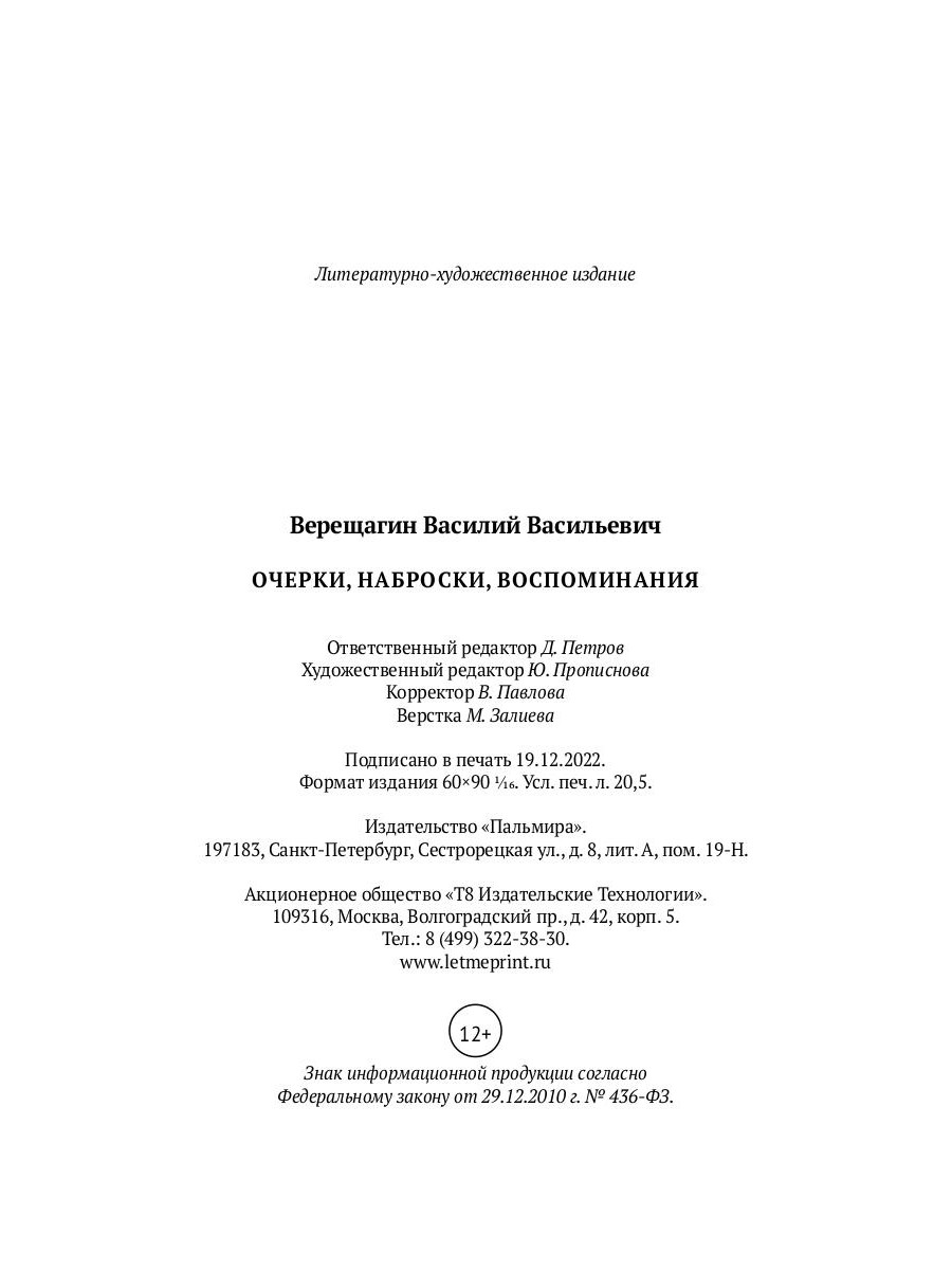 Василий Васильевич Верещагин (1842-1904) - художник-баталист, автор знаменитой работы "Апофеоз войны". Много путешествовал, бывал на Кавказе, в Европе, в Китае, Индии и Сибири. Был участником русско-турецкой войны 1877-1878 годов и русско-японской войны, где погиб на фронте вместе с адмиралом С. О. Макаровым. Василий Верещагин знаменит не только как художник, но и как талантливый литератор. Из-под его пера вышло 12 книг и множество статей как в отечественной, так и в зарубежной прессе. В настоящее издание вошли путевые заметки и бытовые зарисовки, впервые изданные в 1883 году в книге "Очерки, наброски, воспоминания", а также записные книжки.| Издательство | Т8 RUGRAM |