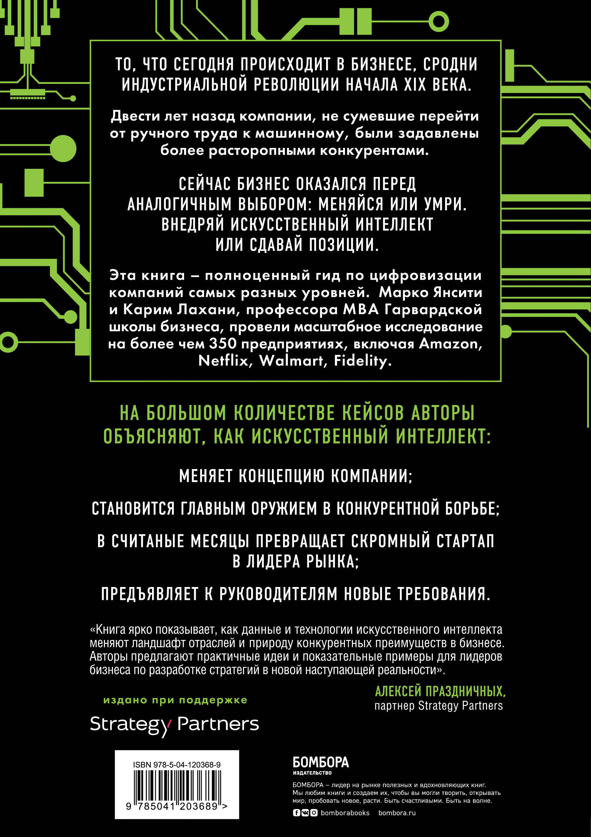 То, что сегодня происходит в бизнесе, сродни индустриальной революции начала 19-го века. Двести лет назад компании, не сумевшие перейти от ручного труда к машинному, были задавлены более расторопными конкурентами. Сейчас бизнес оказался перед аналогичным выбором: меняйся или умри. Внедряй искусственный интеллект или сдавай позиции. Эта книга - полноценный гид по цифровизации компаний самых разных уровней. Марко Янсити и Карим Лахани, профессоры MBA Гарвардской школы бизнеса, провели масштабное исследование на более чем 350 предприятиях, включая Amazon, Netflix, Walmart, Fidelity. На большом количестве кейсов авторы объясняют, как искусственный интеллект меняет концепцию компании, становится главным оружием в конкурентной борьбе, в считанные месяцы превращает скромный стартап в лидеры рынка, предъявляет к руководителям новые требования. ОТ ИЗДАТЕЛЯ "Меняйся или умри" - новый девиз эпохи искусственного интеллекта. Уже сейчас нужно активно оцифровывать бизнес-процессы, чтобы не пропустить четвертую промышленную революцию и не проиграть рынок конкурентам. Придерживаться традиционных форм ведения бизнеса значит совершить корпоративное самоубийство. Авторы дают программу оцифровки бизнеса и отвечают на самые популярные запросы: как определить индекс готовности фирмы к внедрению искусственного интеллекта, организовать сбор данных для анализа и прогнозирования, построить инфраструктуру и выбрать программное обеспечение, определить тип операционной модели и снять ограничения для развития и многие другие. Книга помогает построить собственную фабрику искусственного интеллекта и преобразовать компанию в мощного конкурента, которого невозможно победить. Технология авторов подтверждена масштабными исследованиями на более чем 350 предприятиях в различных отраслях. Книга признана: • "Top Ten Technology Books Of 2020" - по версии Forbes • "Best Leadership Book of 2020" - по версии Leadership Now • "20 Best Books on Business and Leadership" - по версии Bloomberg • одной из 16 новых деловых книг, которые вам нужно прочитать в 2020 году - по версии Inc. ОБ АВТОРАХ Марко Янсити и Карим Лахани профессора Гарвардской школы бизнеса. Работа Марко Янсити по бизнес-экосистемам и их влиянию на стратегию получила широкое признание и большой процент цитирования. Отвечает за одну из старейших и наиболее престижных программ в мире для руководителей по цифровизации бизнеса. Соучредитель Keystone Strategy, в рамках которой консультировал Amazon, Facebook, Microsoft, Intel и другие компании. Карим Лахани научный сотрудник Национального бюро экономических исследований, главный исследователь Лаборатории турниров NASA в Институте количественных социальных наук и соучредитель факультета цифровой инициативы Гарвардской школы бизнеса. Исследования Лахани широко освещались в Businessweek, журнале Economist, Inc., газете New York Times, журнале Нью-Йоркской академии наук, Science, Wall Street Journal, Washington Post. ЭТА КНИГА ДЛЯ • руководителей и собственников бизнеса; • специалистов, внедряющих инновации в компании; • журналистов и блогеров, освещающих тему высоких технологий; • тех, кто интересуется данной сферой. ОТЗЫВЫ "Янсити и Лахани написали важную книгу, в которой объясняется, что необходимо для превращения компании в ориентированную на ИИ. Любой, кто интересуется влиянием ИИ на бизнес, должен прочитать эту книгу". Сатья Наделла, генеральный директор Microsoft "С развитием нашей ц
