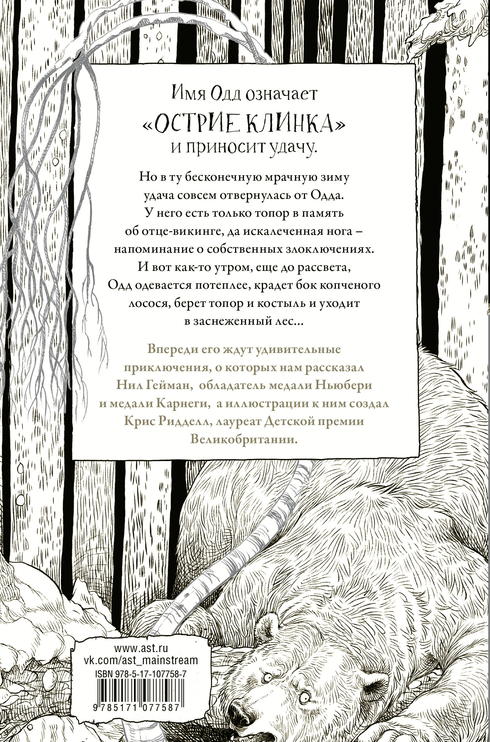 Имя Одд означает "острие клинка" и приносит удачу. Но в ту бесконечную мрачную зиму удача совсем отвернулась от Одда. У него есть только топор в память об отце-викинге, да искалеченная нога - напоминание о собственных злоключениях. И вот как-то утром, еще до рассвета, Одд одевается потеплее, крадет бок копченого лосося, берет топор и костыль и уходит в заснеженный лес… Впереди его ждут удивительные приключения, о которых нам рассказал Нил Гейман, обладатель медали Ньюбери и медали Карнеги, а иллюстрации к ним создал Крис Ридделл, лауреат Детской премии Великобритании.| Издательство | ИЗДАТЕЛЬСТВО "АСТ" |