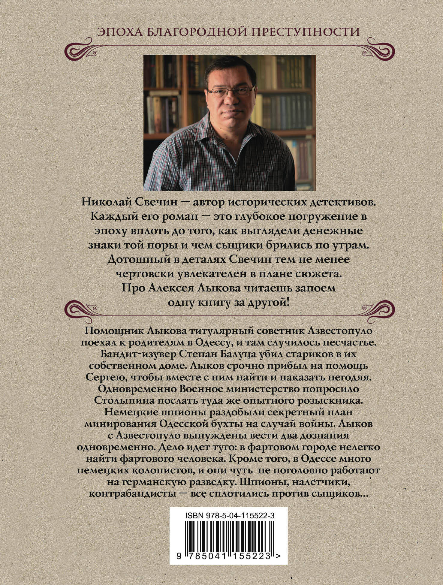 Помощник Лыкова титулярный советник Азвестопуло поехал к родителям в Одессу, и там случилось несчастье. Бандит-изувер Степан Балуца убил стариков в их собственном доме. Лыков срочно прибыл на помощь Сергею, чтобы вместе с ним найти и наказать негодяя. Одновременно Военное министерство попросило Столыпина послать туда же опытного разыскника. Немецкие шпионы раздобыли секретный план минирования Одесской бухты на случай войны. Лыков с Азвестопуло вынуждены вести два дознания одновременно. Дело идет туго: в фартовом городе нелегко найти фартового человека. Кроме того, в Одессе много немецких колонистов, и они чуть не поголовно работают на германскую разведку. Шпионы, налетчики, контрабандисты - все сплотились против сыщиков…| Издательство | ООО "Издательство "Эксмо" |