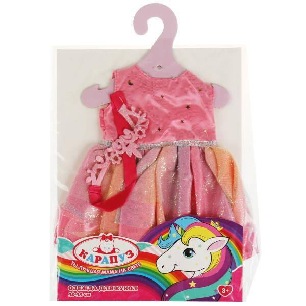 Одежда для кукол ТМ "Карапуз" станет отличным дополнением для игры с любимой куклой: - подходит для кукол ростом 30-35 см - на плечиках - легко надеть и снять - качественный материал Девочки обожают наряжать и менять образ своим куклам. Это нарядное платье с пышной блестящей юбкой и корона помогут разнообразить кукольный гардероб. Одежда сшита из безопасного материала, приятного на ощупь. Игра с куклами и аксессуарами для них ТМ "Карапуз" развивает: - фантазию и воображение - моторику - речь - внимание - социально-коммуникативные навыки Размер упаковки: 15 х 30 х 2 см. Материал: текстиль. Рекомендовано детям от 3-х лет.