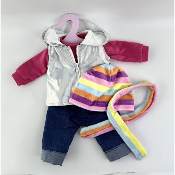 Одежда для кукол ТМ "Карапуз" станет отличным дополнением для игры с любимой куклой: - подходит для кукол ростом 40-46 см - на плечиках - легко надеть и снять - качественный материал Девочки обожают наряжать и менять образ своим куклам. Эта серебристая жилетка, розовая кофточка, джинсы и шарф с шапочкой в яркую полоску поможет разнообразить кукольный гардероб. Одежда сшита из безопасного материала, приятного на ощупь. Игра с куклами и аксессуарами для них ТМ "Карапуз" развивает: - фантазию и воображение - моторику - речь - внимание - социально-коммуникативные навыки Размер упаковки: 20 х 40 х 1 см. Материал: текстиль. Рекомендовано детям от 3-х лет.