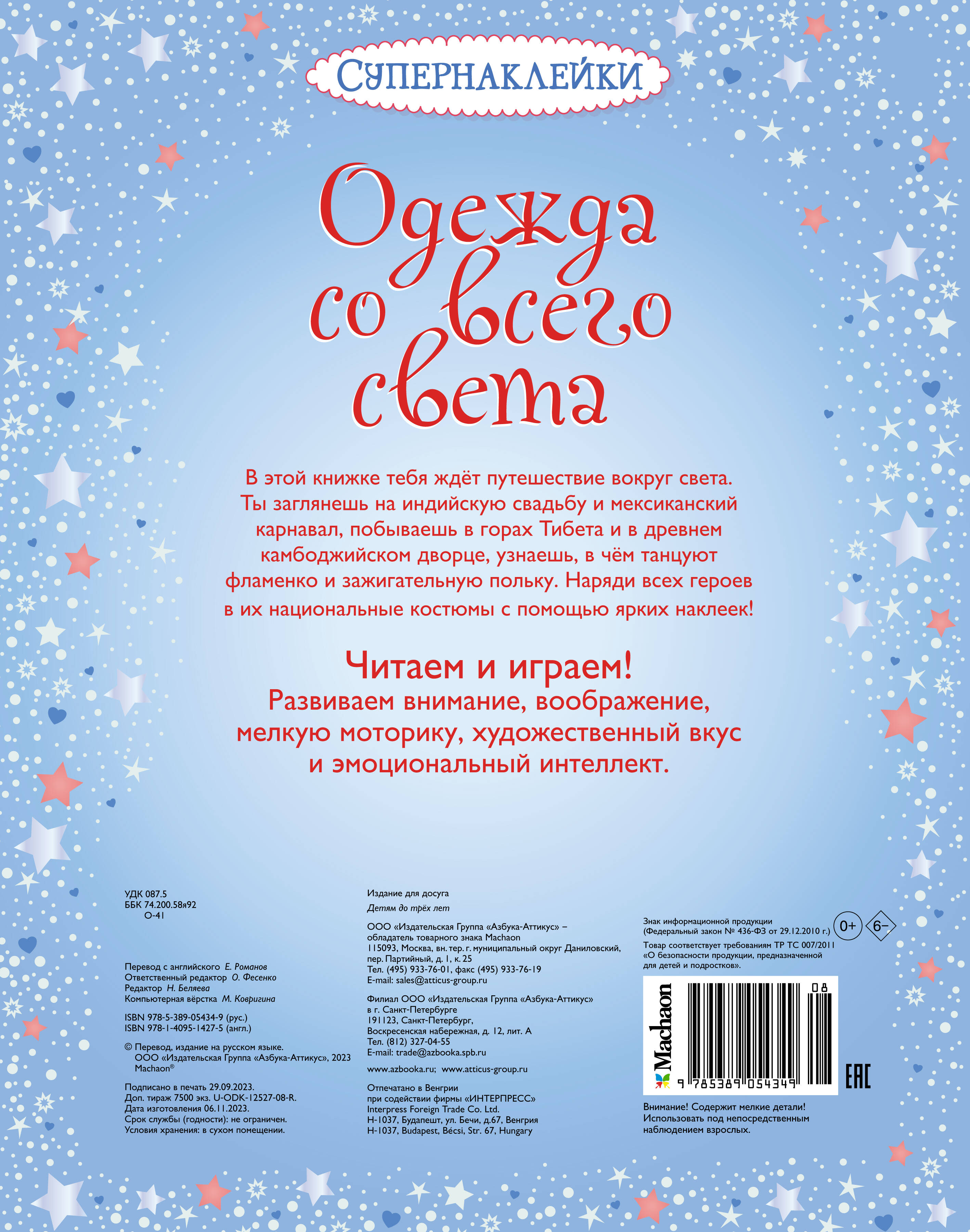 В этой книжке тебя ждёт путешествие вокруг света. Ты заглянешь на индийскую свадьбу и мексиканский карнавал, побываешь в горах Тибета и в древнем камбоджийском дворце, узнаешь, в чём танцуют фламенко и зажигательную польку. Наряди всех героев в их национальные костюмы с помощью ярких наклеек! Читаем и играем! Развиваем внимание, воображение, мелкую моторику и художественный вкус.| Издательство | Азбука-Аттикус Издат.группа ООО |