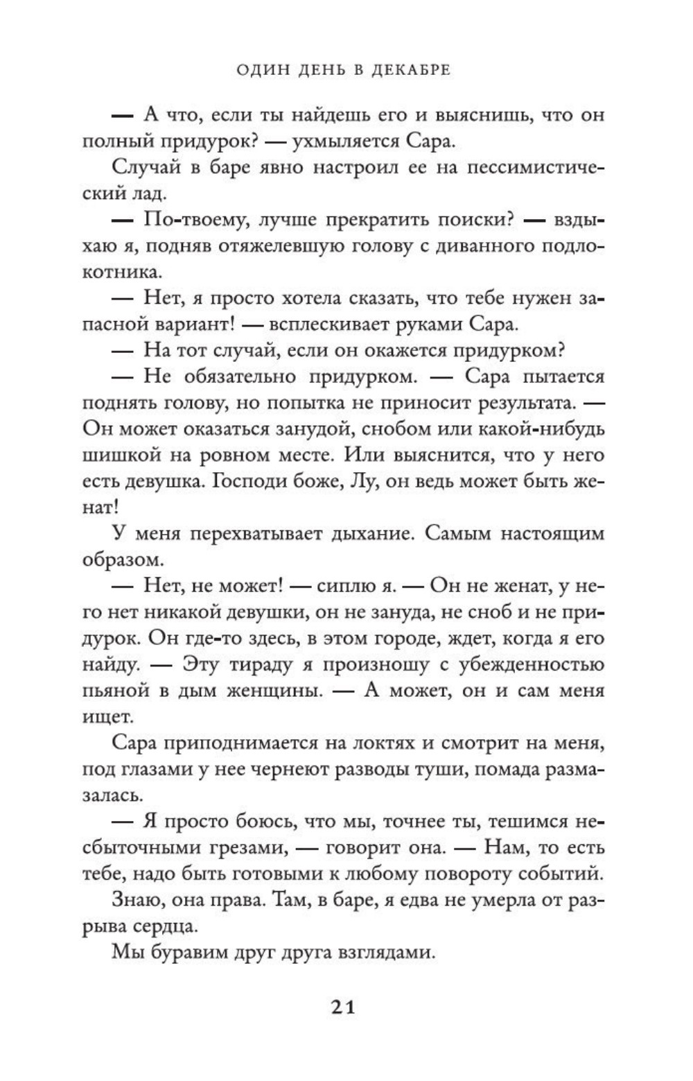 Лори уверена: любовь с первого взгляда существует только в фильмах. Но в один снежный декабрьский день через затуманенное окно автобуса она встречается взглядом с молодым человеком, и между ними пробегает искра. Лори понимает, что безнадежно влюбилась. В течение года она ищет этого молодого человека везде: на улицах Лондона, в метро, кафе, на автобусной остановке, - а находит на рождественской вечеринке, где ее лучшая подруга Сара знакомит Лори со своим новым бойфрендом. Им оказывается Джек, тот самый парень с автобусной остановки... «Один день в декабре» - это радостная, трогательная и невероятно волнующая история любви, показывающая, что судьба закручивает невероятные виражи на пути к счастью.