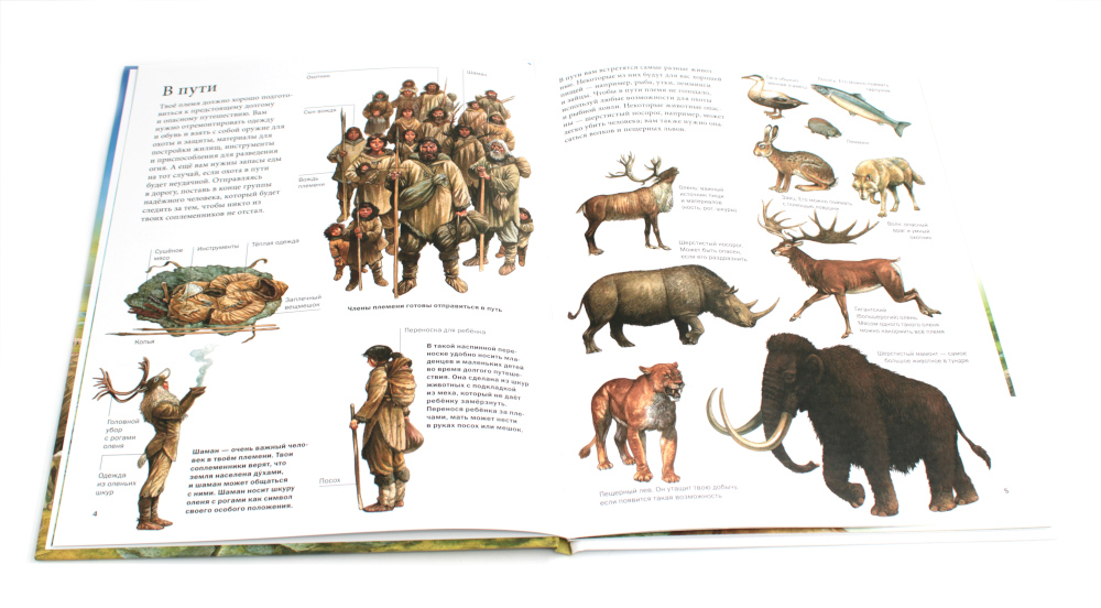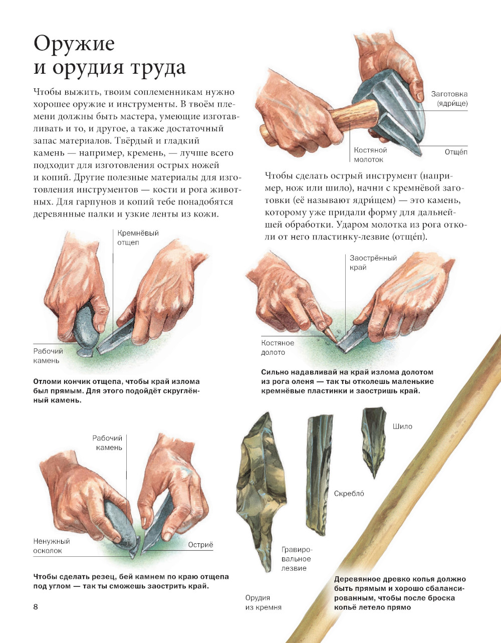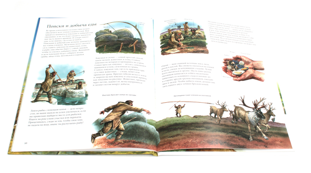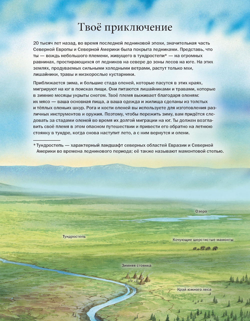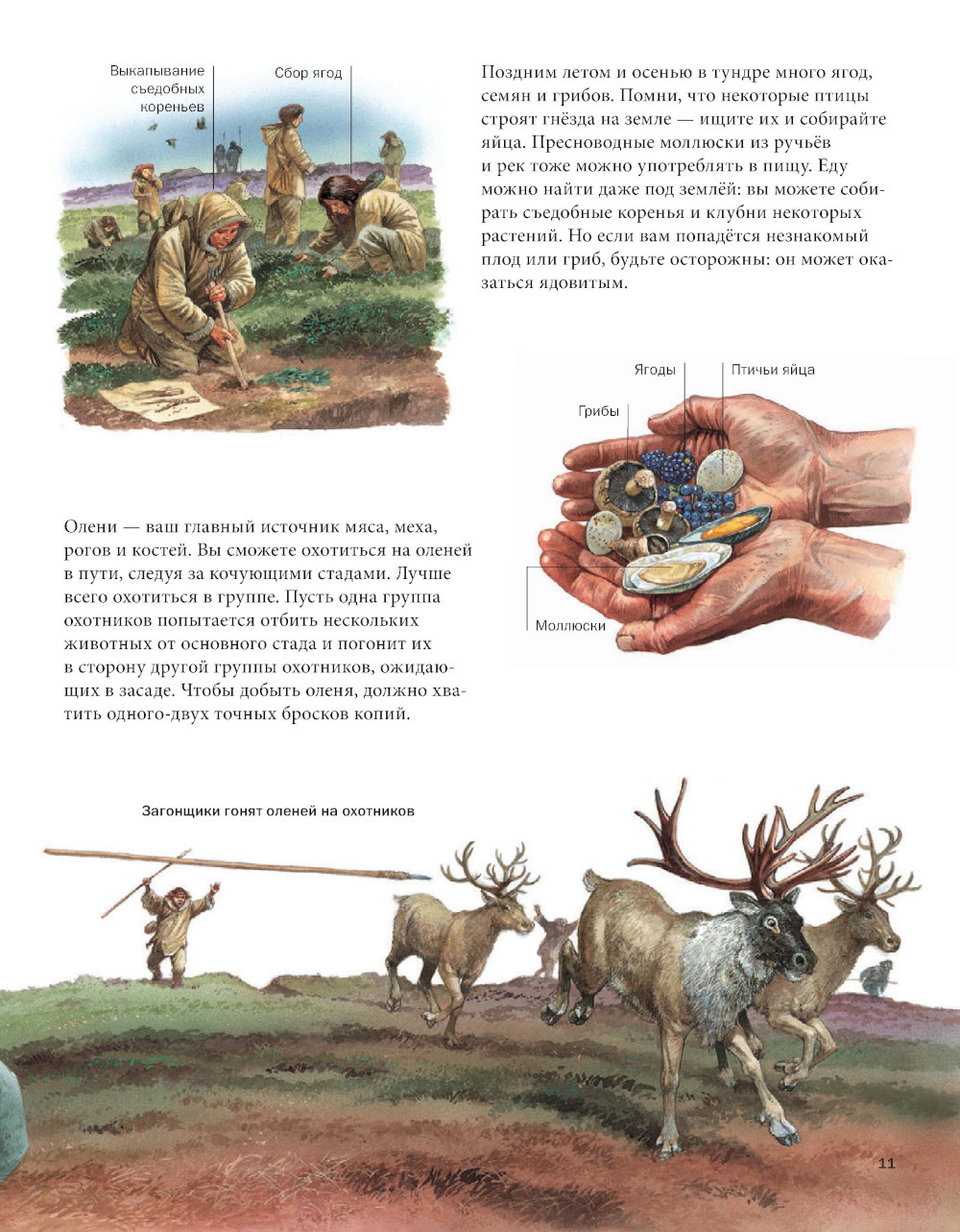 20 тысяч лет назад значительная часть нашей планеты была покрыта ледниками. Представь себя вождём небольшого племени, живущего на огромных холодных равнинах, простирающихся от ледников на севере до зоны лесов на юге. С приближением зимы стада северных оленей, пасущиеся в этих краях, мигрируют на юг в поисках пищи. Твоё племя выживает благодаря оленям: их мясо - ваша основная пища, ваша одежда и жилища сделаны из толстых и тёплых оленьих шкур, а рога и кости оленей вы используете для изготовления инструментов и оружия. Чтобы пережить зиму, вам придётся следовать за оленями во время их миграции на юг. Ты возглавишь своё племя в этом опасном путешествии, а с наступлением весны приведёшь его обратно на летнюю стоянку. Ты узнаешь: Как добывать пищу и выживать в холодной тундре. Как разжечь огонь с помощью подручных средств и приготовить еду прямо в земле. Как изготовить оружие и инструменты из кремня и кости. И многое, многое другое... Книга содержит более 70 цветных иллюстраций.| Издательство | Добрая книга |