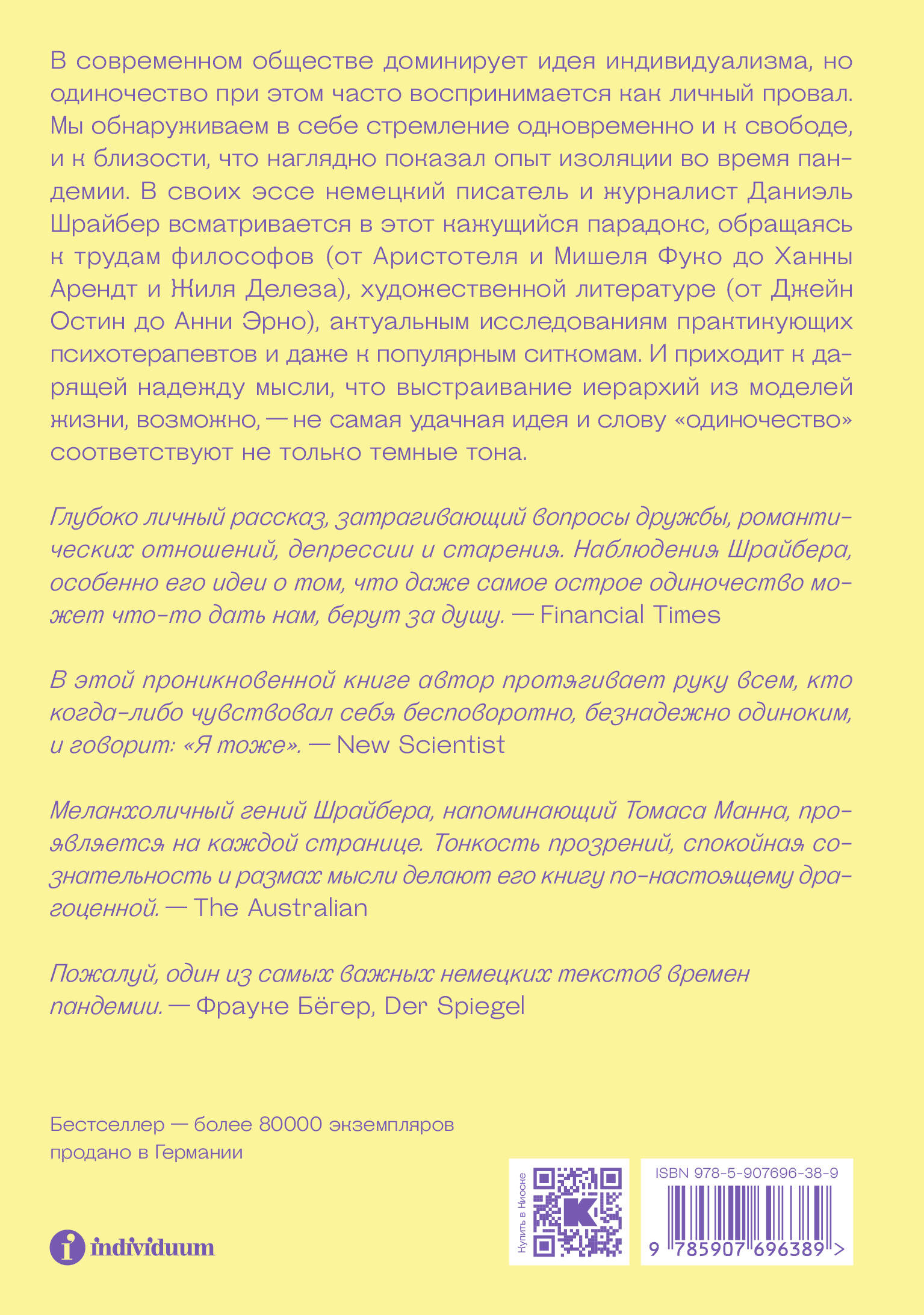 В современном обществе доминирует идея индивидуализма, но одиночество при этом часто воспринимается как личный провал. Мы обнаруживаем в себе стремление одновременно и к свободе, и к близости, что наглядно показал опыт изоляции во время пандемии. В своих эссе немецкий писатель и журналист Даниэль Шрайбер всматривается в этот кажущийся парадокс, обращаясь к трудам философов (от Аристотеля и Мишеля Фуко до Ханны Арендт и Жиля Делёза), художественной литературе (от Джейн Остин до Анни Эрно), актуальным исследованиям практикующих психотерапевтов и даже к популярным ситкомам. И приходит к дарящей надежду мысли, что выстраивание иерархий из моделей жизни, возможно, - не самая удачная идея и слову «одиночество» соответствуют не только темные тона.| Издательство | ИНДИВИДУУМ ПРИНТ ООО |