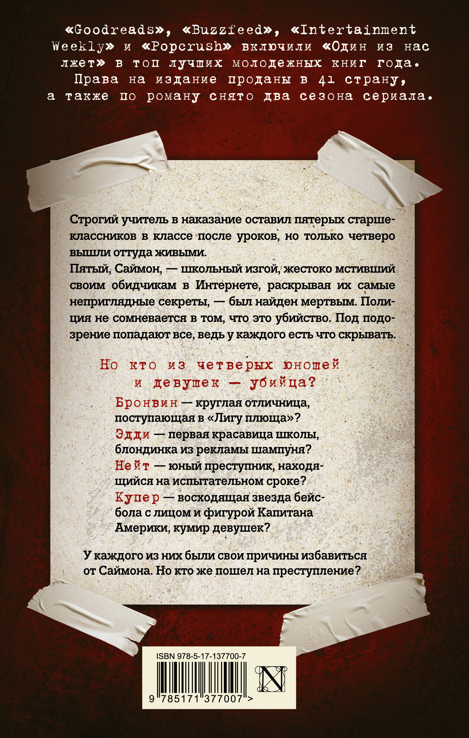 Новое издание нашумевшего бестселлера Карен Макманус «Один из нас лжет». Захватывающий и увлекательный детективный триллер, в котором вы до последнего будете сомневаться в исходе. В октябре 2021 года на сервисе Peacock вышла восьмисерийная экранизация романа.| Издательство | ИЗДАТЕЛЬСТВО "АСТ" |