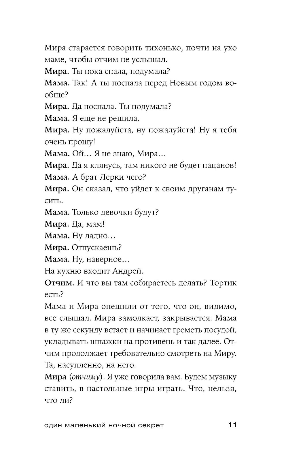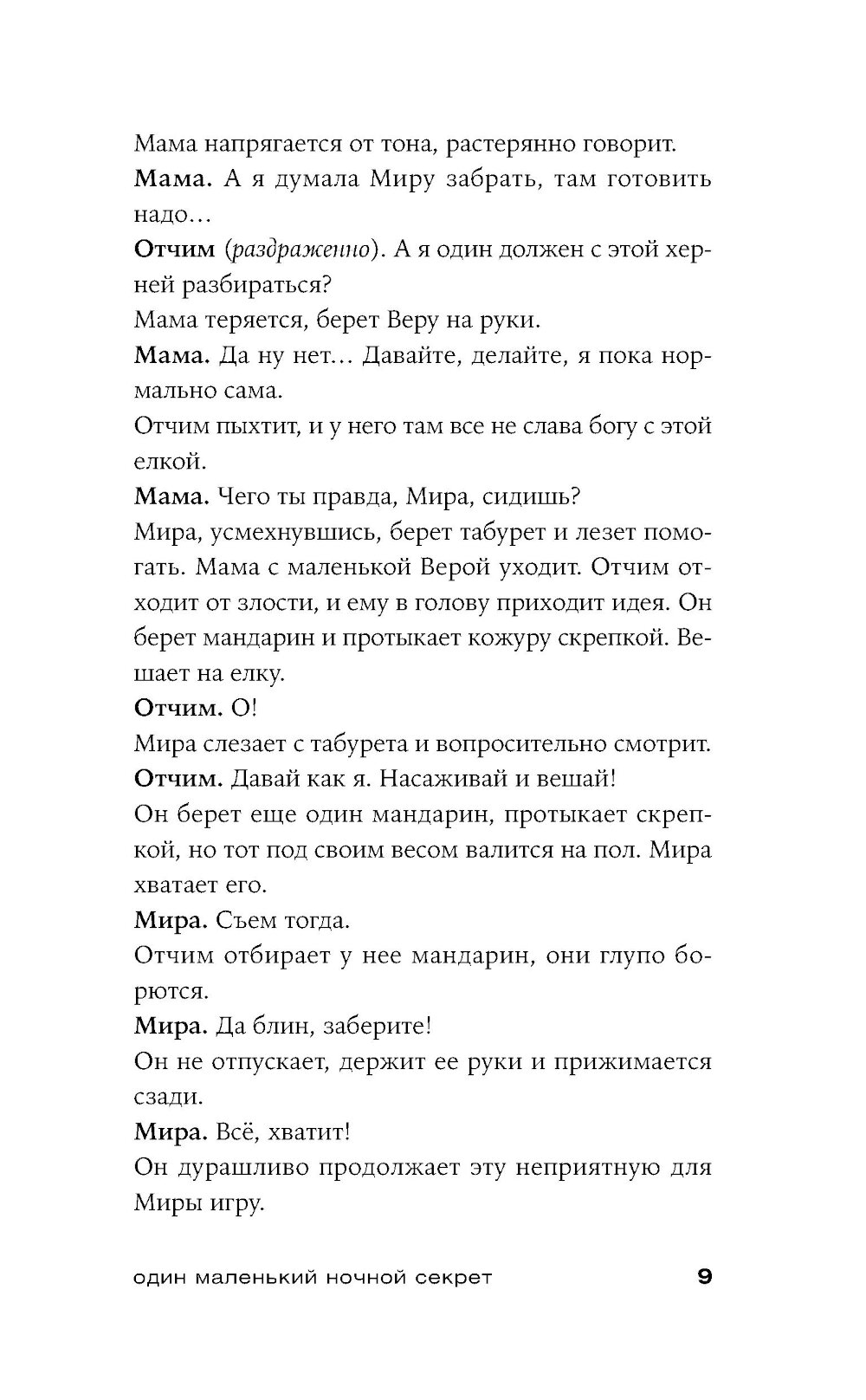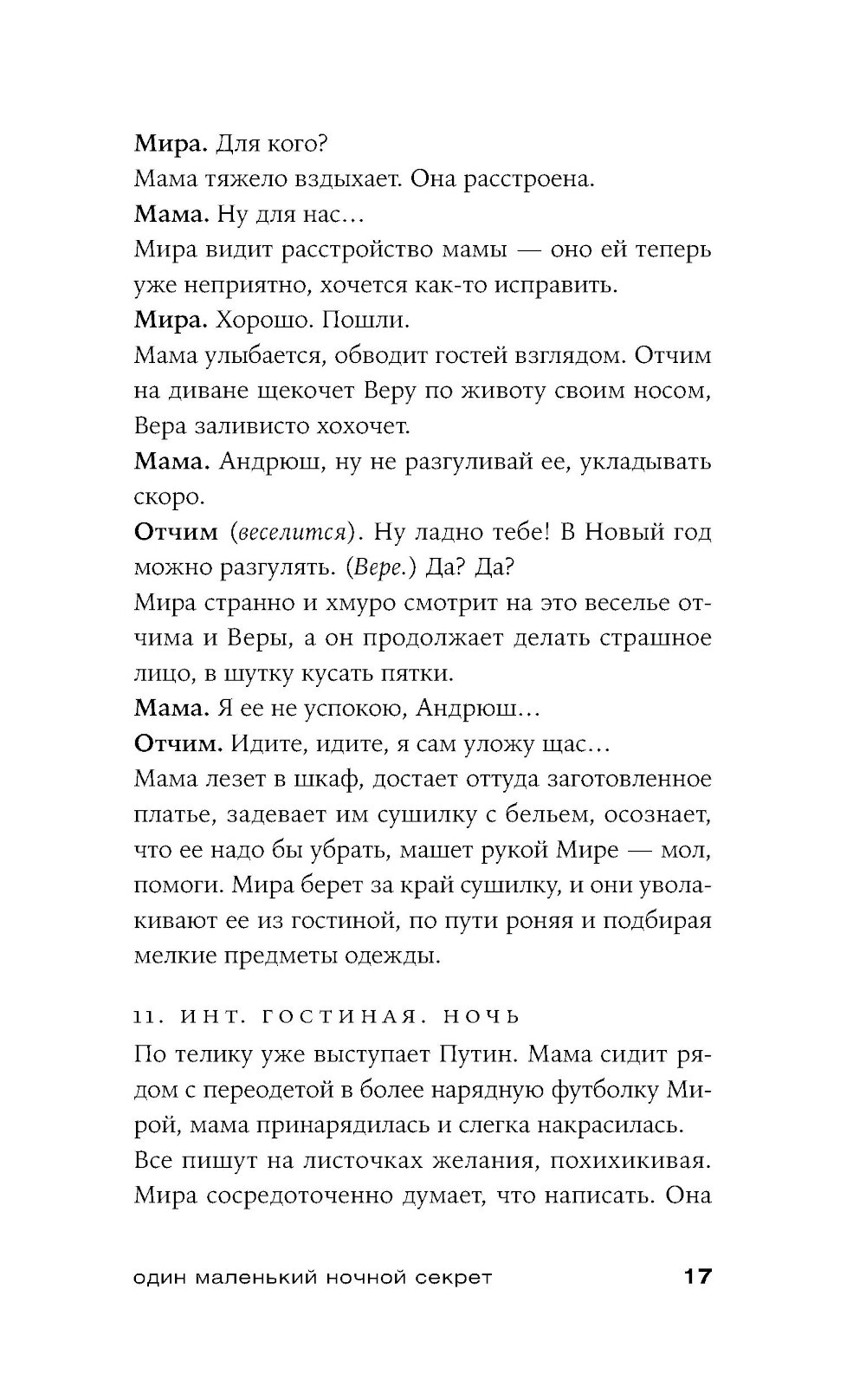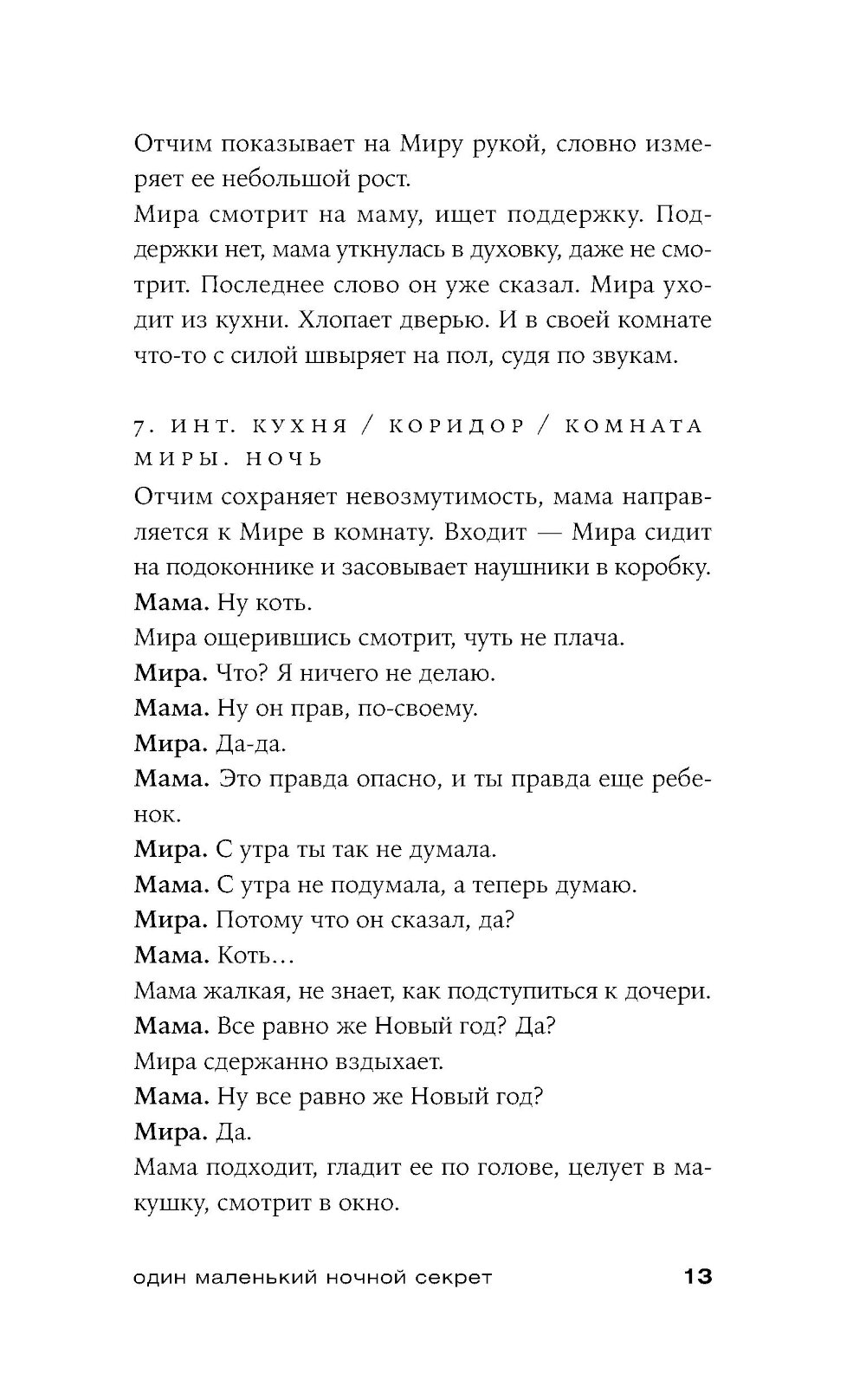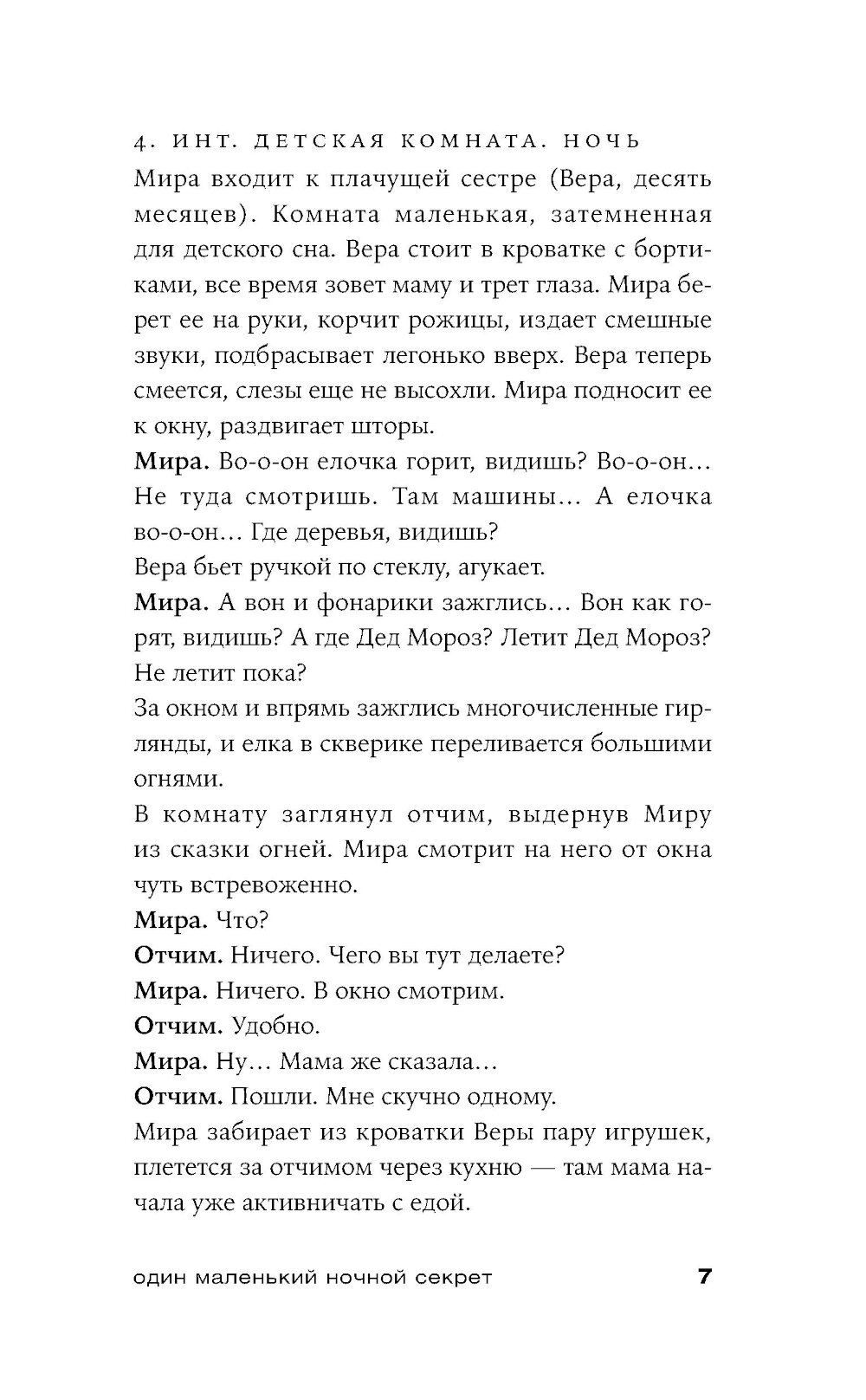 В сборник «Один маленький ночной секрет» вошли ранее не публиковавшийся сценарий к одноименному фильму и рассказы Наталии Мещаниновой. Это концентрированная проза, жесткая, бескомпромиссная и болезненно нежная одновременно. Мещанинова объединяет кинематографическую беспристрастность с литературной экспрессией, но делает это без спекуляций на читательских эмоциях.| Издательство | Альпина нон-фикшн |
