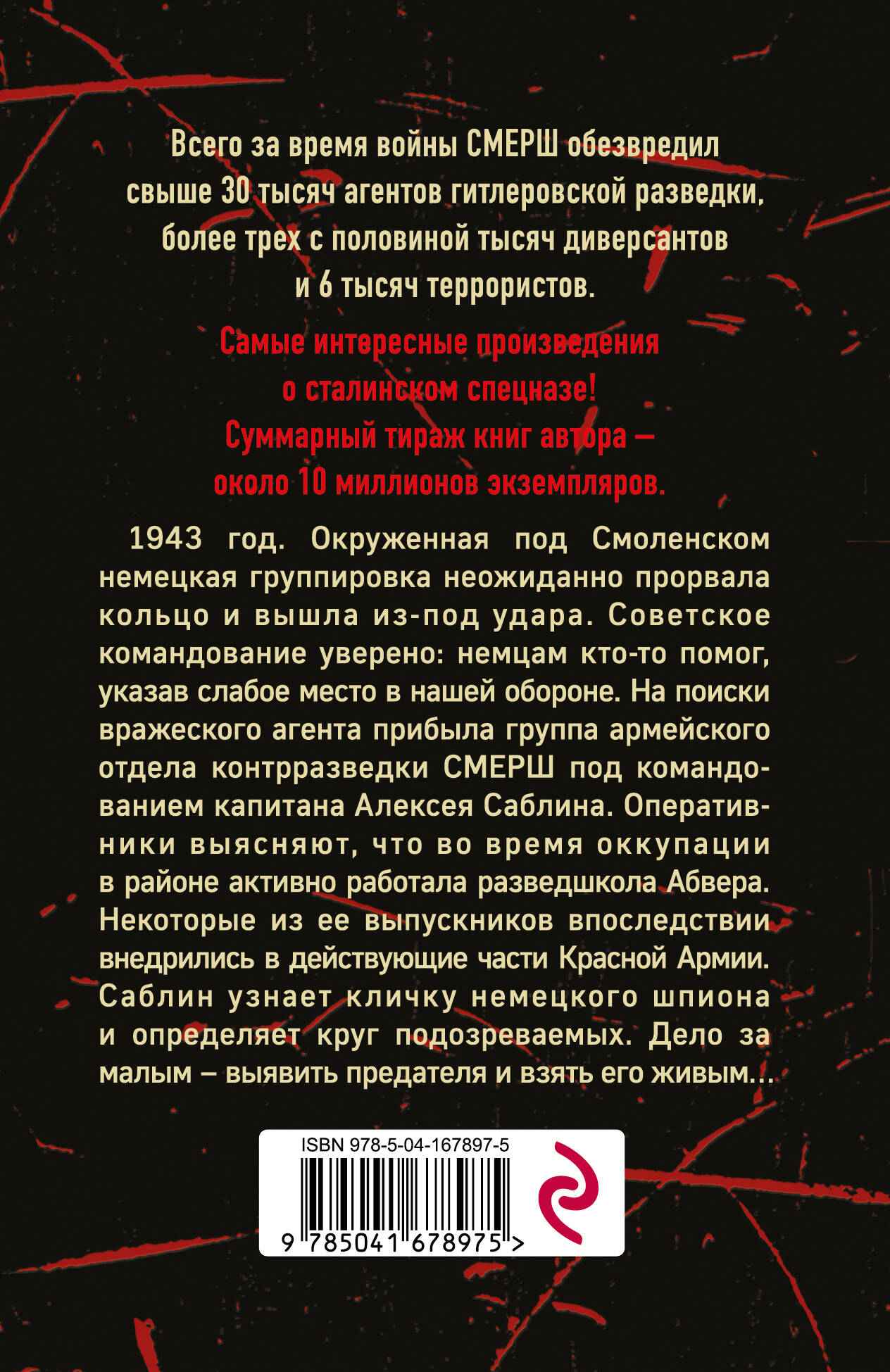 Самые интересные произведения о сталинском спецназе! Общий тираж книг А. Тамоникова - около 10 миллионов экземпляров! 1943 год. Окруженная под Смоленском немецкая группировка неожиданно прорвала кольцо и вышла из-под удара. Советское командование уверено: немцам кто-то помог, указав слабое место в нашей обороне. На поиски вражеского агента прибыла группа армейского отдела контрразведки СМЕРШ под командованием капитана Алексея Саблина. Оперативники выясняют, что во время оккупации в районе активно работала разведшкола Абвера. Некоторые из ее выпускников впоследствии внедрились в действующие части Красной Армии. Саблин узнает кличку немецкого шпиона и определяет круг подозреваемых. Дело за малым - выявить предателя и взять его живым…| Издательство | Эксмо |