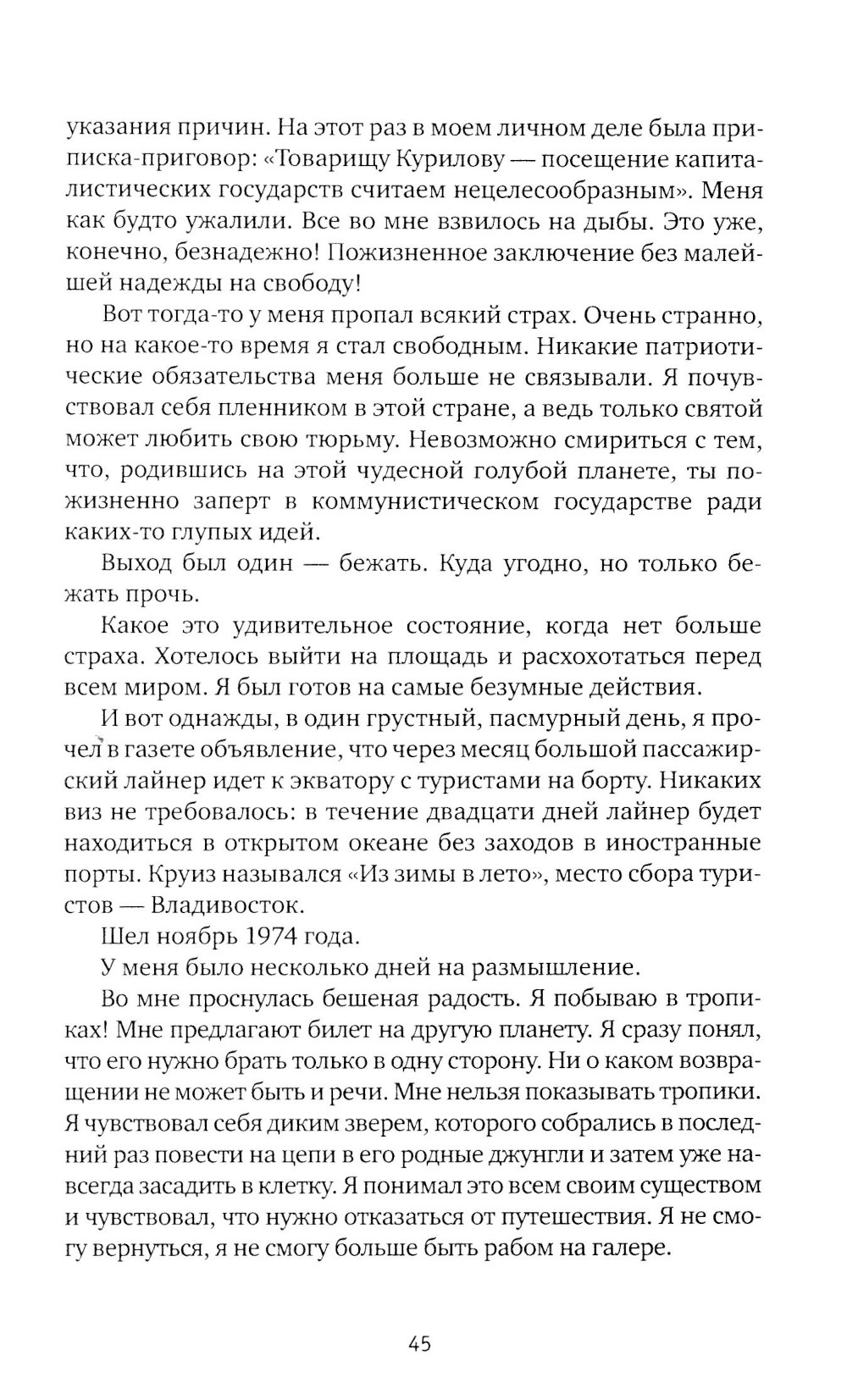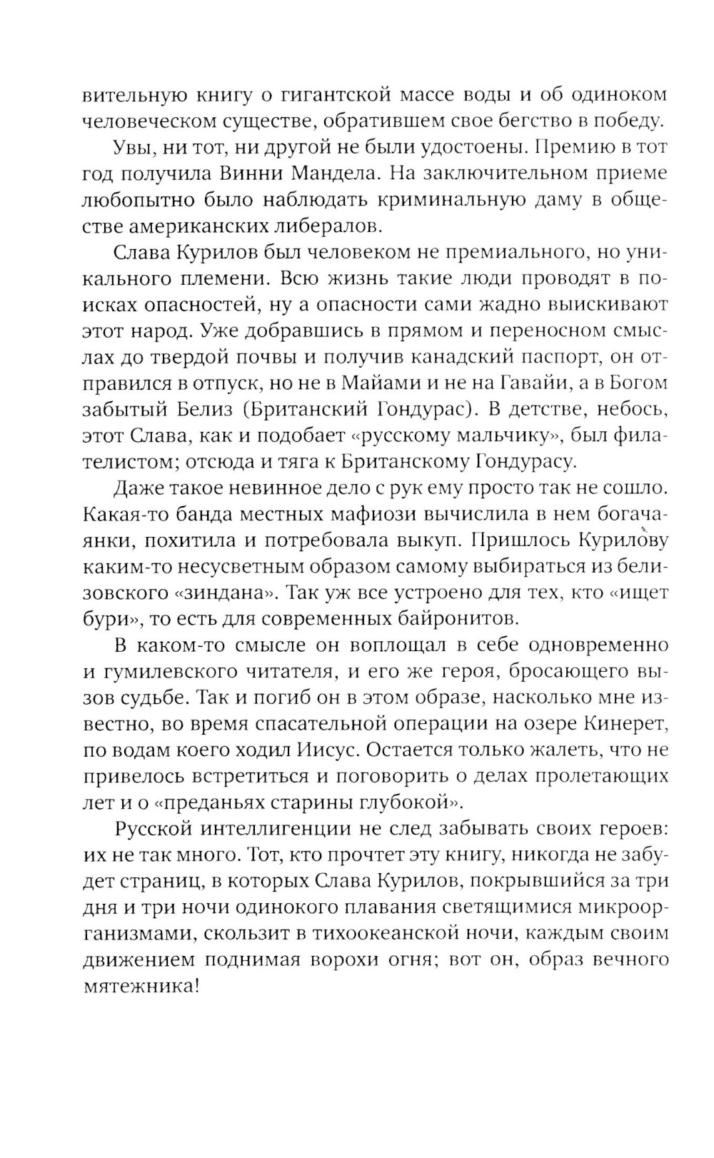 Эту историю часто называют одним из самых ярких и опасных приключений XX века. Слава Курилов, профессиональный океанограф, хотел увидеть весь мир, а родная страна не пускала его дальше своих границ. Тогда он посреди океана спрыгнул с борта круизного лайнера. Он выплыл. «В каком-то смысле он воплощал в себе одновременно и гумилевского читателя, и его же героя, бросающего вызов судьбе... Русской интеллигенции не след забывать своих героев: их не так много. Тот, кто прочтет эту книгу, никогда не забудет страниц, в которых Слава Курилов, покрывшийся за три дня и три ночи одинокого плавания светящимися микроорганизмами, скользит в тихоокеанской ночи, каждым своим движением поднимая ворохи огня; вот он, образ вечного мятежника» (Василий Аксенов).| Издательство | Время |