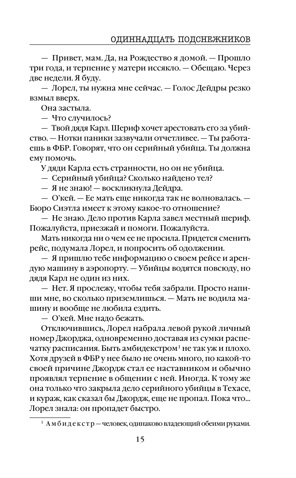 Лорел Сноу - профайлер с уникальным интеллектом и редким даже для профайлера объемом знаний. Она специалист не только по аномальной психике, но и по нейробиологии, теории игр, биоинформатике и обработке данных. ПОДОБНОЕ НЕВОЗМОЖНО ПРЕДСТАВИТЬ. НО ЭТО РЕАЛЬНОСТЬ… Увеселительная прогулка на горе закончилась для молодежной компании и для всего городка Дженезис-Вэлли диким кошмаром. Вызванная квадроциклами лавина снесла чье-то тайное захоронение. Одиннадцать задушенных молодых женщин - и это только те, чьи тела удалось найти посреди снежного обвала. Они убиты в разное время, последняя - всего неделю назад. И все жертвы - блондинки. НЕСОМНЕННО, ЭТО БЫЛО КЛАДБИЩЕ СЕРИЙНОГО УБИЙЦЫ… Для специального агента ФБР и опытного профайлера Лорел Сноу это дело с самого начала - личное. Не только потому, что Дженезис-Вэлли - ее родина. Но и потому, что подозреваемым оказался ее родной дядя Карл. Он работает могильщиком и старается избегать людей; многие боятся его из-за страшных шрамов на лице. Но племянница знает: Карл не способен на подобное. Используя свой уникальный ум и огромные знания, она старается создать максимально подробный профиль настоящего маньяка. В этом расследовании она столкнется с интеллектом… НИ В ЧЕМ НЕ УСТУПАЮЩИМ ЕЕ СОБСТВЕННОМУ.| Издательство | Эксмо |