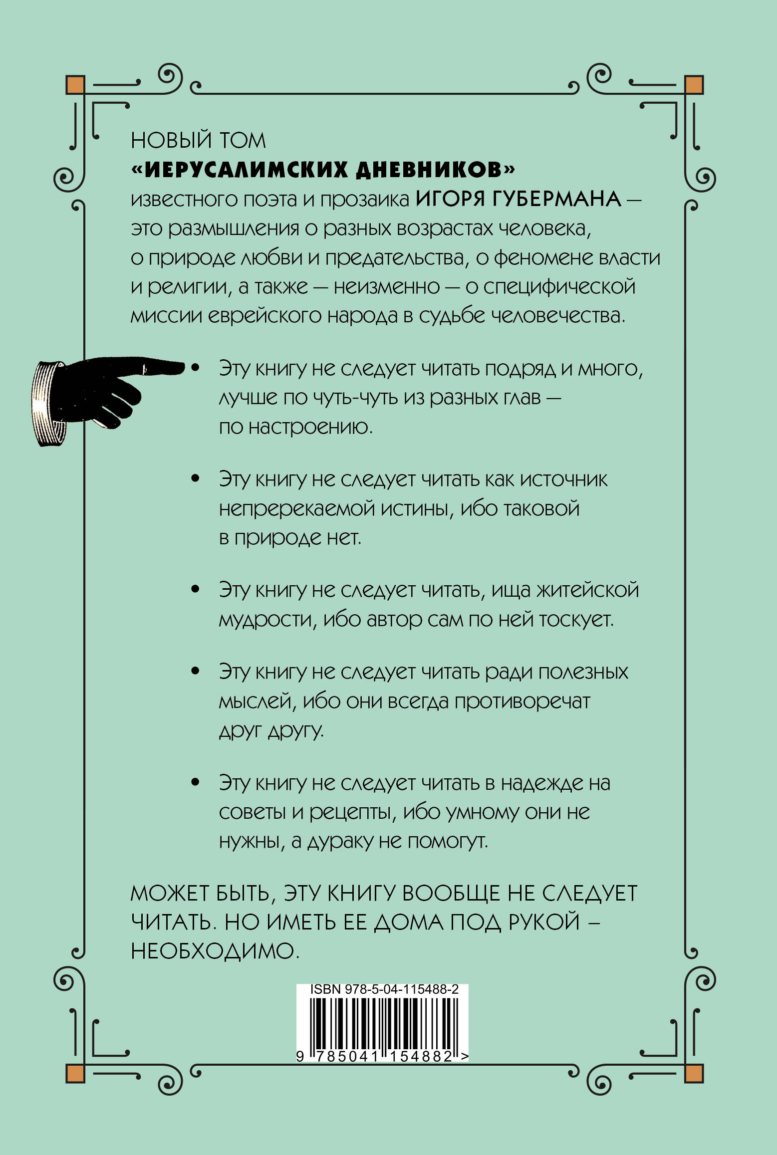 Новый том «Иерусалимских дневников» известного поэта и прозаика Игоря Губермана - это размышления о разных возрастах человека, о природе любви и предательства, о феномене власти и религии, а также - неизменно о специфической миссии еврейского народа в судьбе человечества. Губерман - один из самых читаемых авторов в современной России, а его выступления перед публикой собирают полные залы. Эту книгу не следует читать подряд и много, лучше по чуть-чуть из разных глав - по настроению. Эту книгу не следует читать как источник непререкаемой истины, ибо таковой в природе нет. Эту книгу не следует читать, ища житейской мудрости, ибо автор сам по ней тоскует. Эту книгу не следует читать ради полезных мыслей, ибо они всегда противоречат друг другу. Эту книгу не следует читать в надежде на советы и рецепты, ибо умному они не нужны, а дураку не помогут. Может быть, эту книгу вообще не следует читать. Но иметь ее дома под рукой - необходимо.| Издательство | ООО "Издательство "Эксмо" |