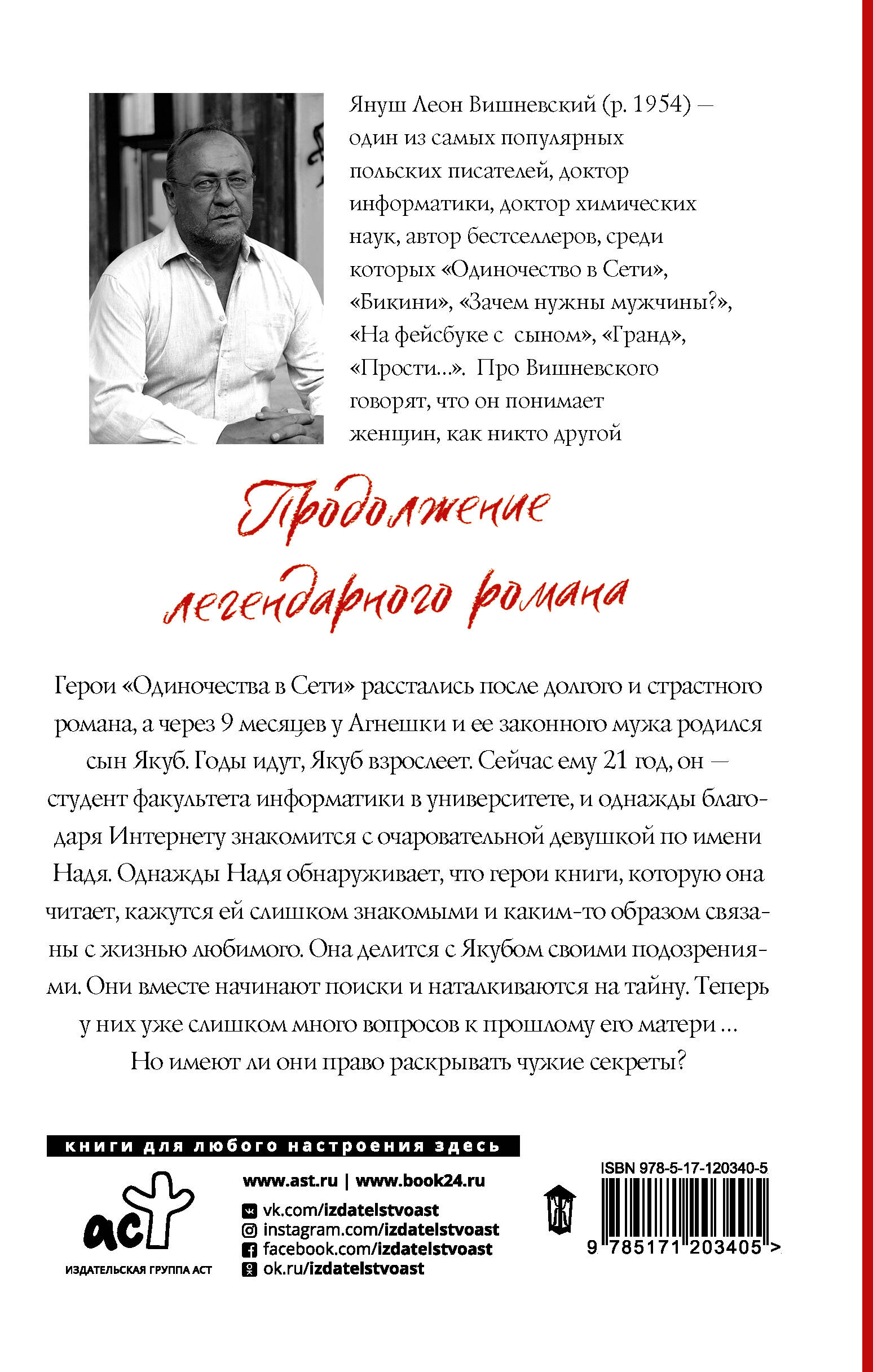 Герои "Одиночества в сети" расстались после долгого и страстного романа, а через 9 месяцев у Агнешки и ее законного мужа родился сын Якуб. Годы идут, Якуб взрослеет. Сейчас ему 21 год, он - студент факультета информатики в университете, и однажды благодаря Интернету знакомится с очаровательной Надей. Однажды Надя обнаруживает, что герои книги, которую она читает, кажутся ей слишком знакомыми и каким-то образом связаны с жизнью любимого. Она делится с Якубом своими подозрениями. Они вместе начинают поиски и наталкиваются на тайну. Теперь у них уже слишком много вопросов к прошлому его матери … Но имеют ли они право раскрывать чужие секреты?| Издательство | ИЗДАТЕЛЬСТВО "АСТ" |