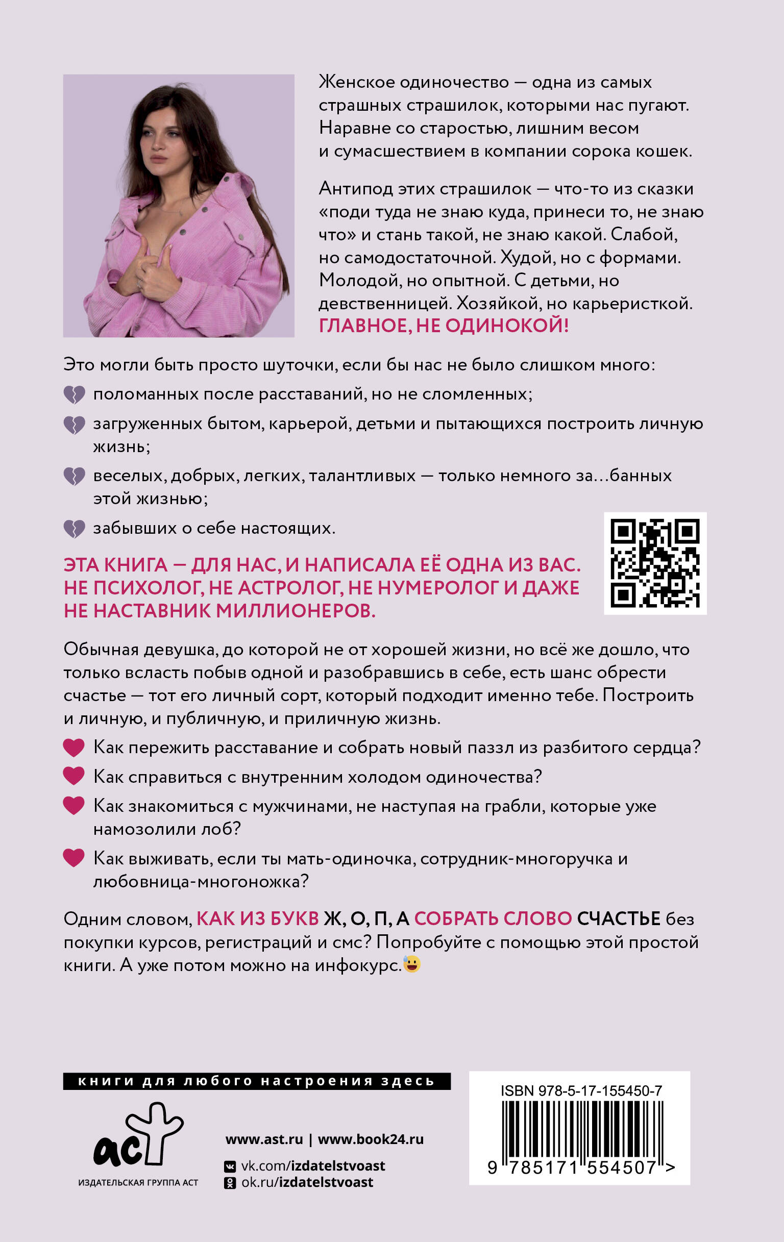 Женское одиночество - одна из самых страшных страшилок, которыми нас пугают. Наравне со старостью, лишним весом и сумасшествием в компании сорока кошек. Антипод этих страшилок - что-то из сказки "поди туда не знаю куда, принеси то, не знаю что" и стань такой, не знаю какой. Слабой, но самодостаточной. Худой, но с формами. Молодой, но опытной. С детьми, но девственницей. Хозяйкой, но карьеристкой. Главное, не одинокой! Это могли быть просто шуточки, если бы нас не было слишком много: Поломанных после расставаний, но не сломленных. Загруженных бытом, карьерой, детьми и пытающихся построить личную жизнь. Веселых, добрых, легких, талантливых - только немного за…банных этой жизнью. Забывших о себе настоящих. Эта книга - для нас, и написала её одна из вас. Не психолог, не астролог, не нумеролог и даже не наставник миллионеров. Обычная девушка, до которой не от хорошей жизни, но всё же дошло, что только всласть побыв одной и разобравшись в себе, есть шанс обрести счастье - тот его личный сорт, который подходит именно тебе. Построить и личную, и публичную, и приличную жизнь. ❤️ Как пережить расставание и собрать новый паззл из разбитого сердца? ❤️ Как справиться с внутренним холодом одиночества? ❤️ Как знакомиться с мужчинами, не наступая на грабли, которые уже намозолили лоб? ❤️ Как выживать, если ты мать-одиночка, сотрудник-многоручка и любовница-многоножка? Одним словом, как из букв Ж, О, П, А собрать слово СЧАСТЬЕ, без покупки курсов, регистраций и смс? Попробуйте с помощью этой простой книги. А уже потом можно на инфокурс ;)