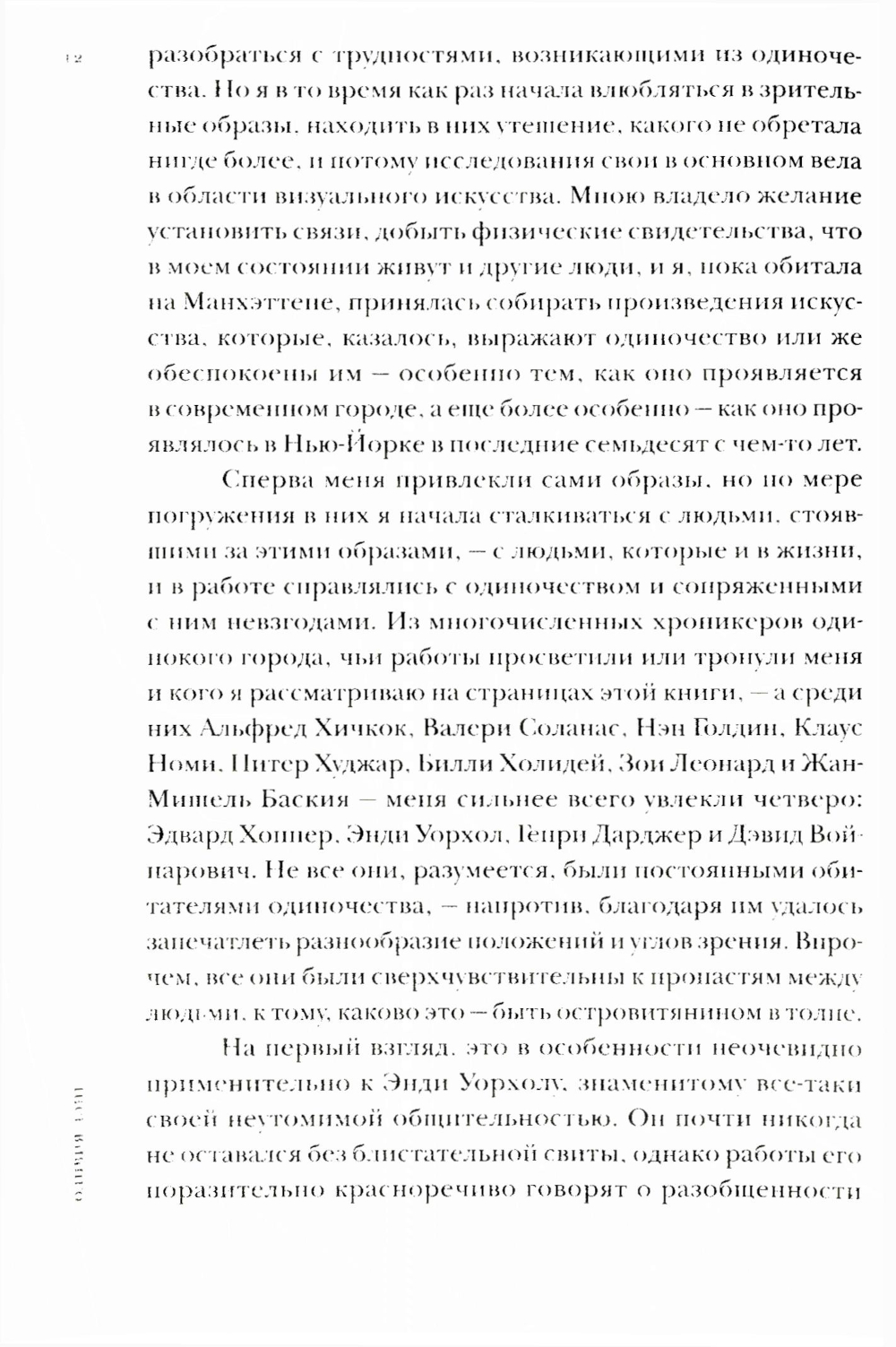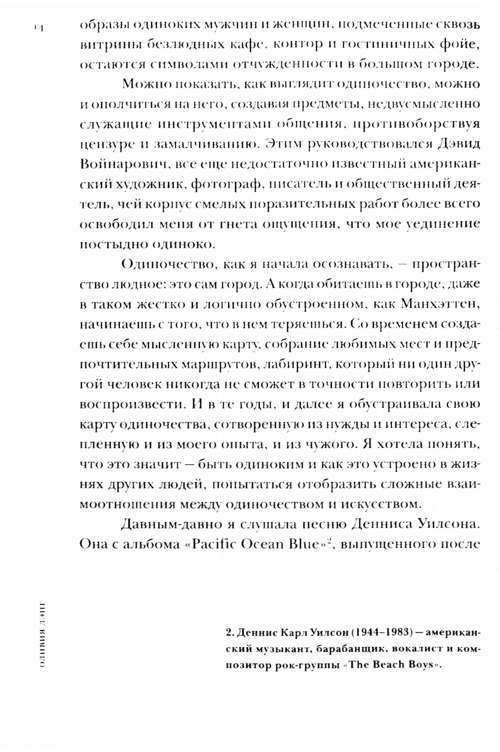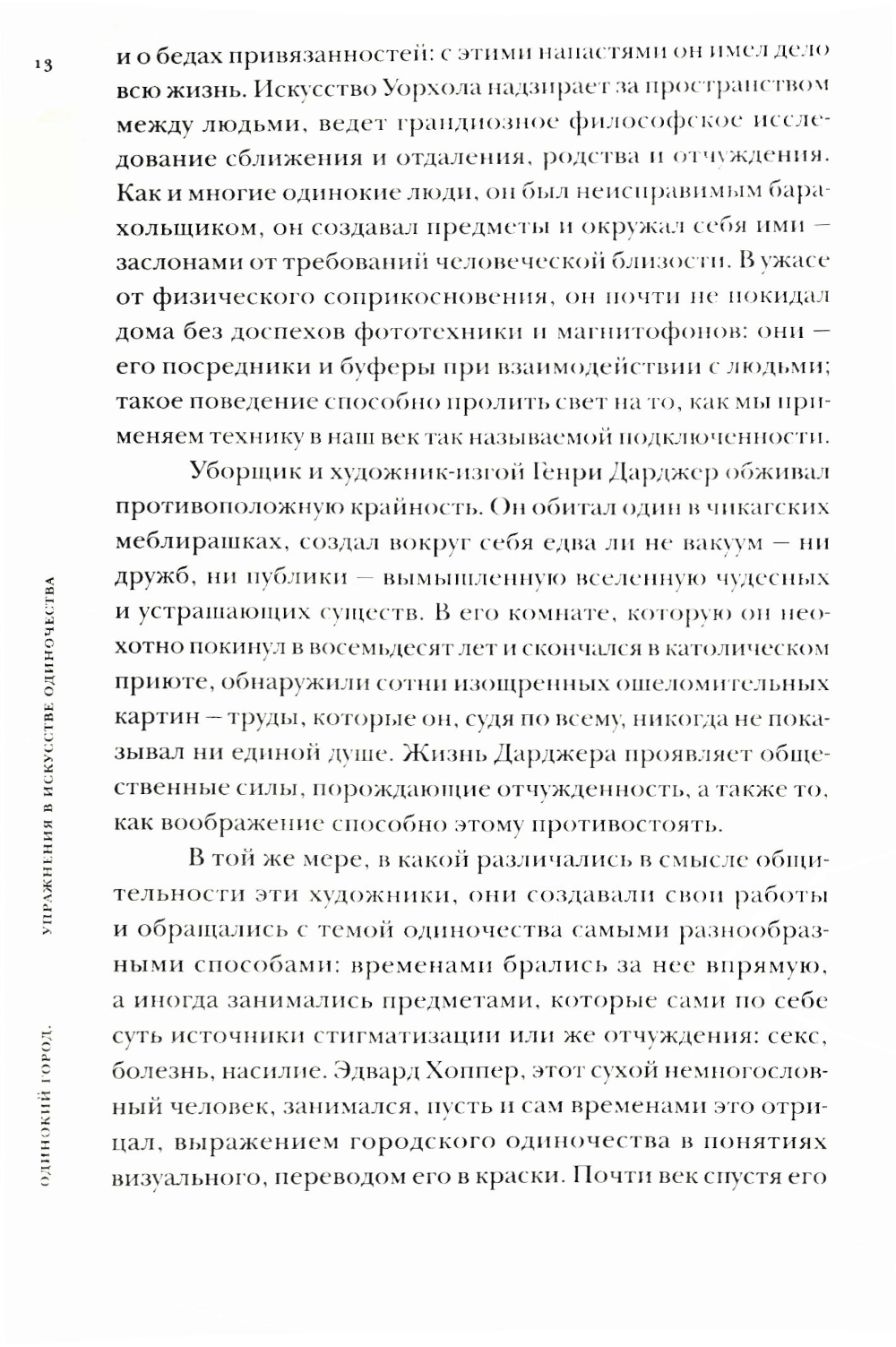 В тридцать с лишним лет переехав в Нью-Йорк по причине романтических отношений, Оливия Лэнг в итоге оказалась одна в огромном чужом городе. Этот наипостыднейший жизненный опыт завораживал ее все сильнее, и она принялась исследовать одинокий город через искусство. Разбирая случаи Эдварда Хоппера, Энди Уорхола, Клауса Номи, Генри Дарджера и Дэвида Войнаровича, прославленная эссеистка и критик изучает упражнения в искусстве одиночества, разбирает его образы и социально-психологическую природу отчуждения. Человечный, дерзкий и глубоко проникновенный «Одинокий город» - книга о пространствах между людьми, о вещах, которые соединяют людей, о сексуальности, нравственности и чудодейственных возможностях искусства. Это исследование неведомого и чарующего состояния, оторванного от обширного материка человеческого жизненного опыта, но глубинно присущего жизни как таковой.