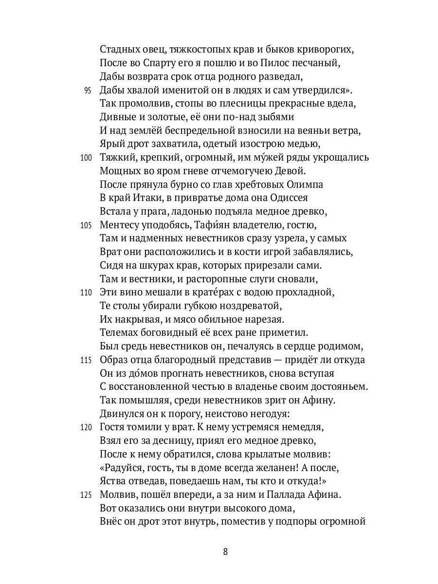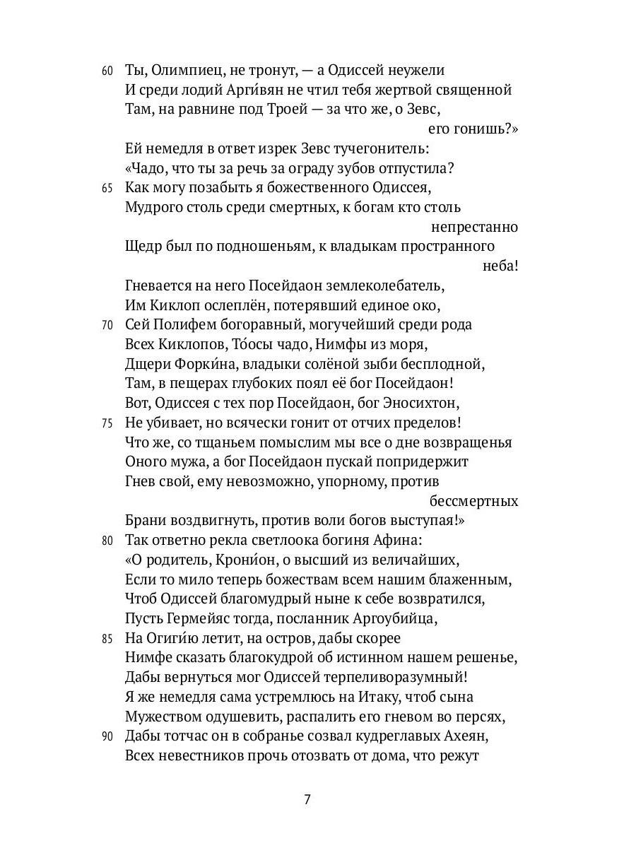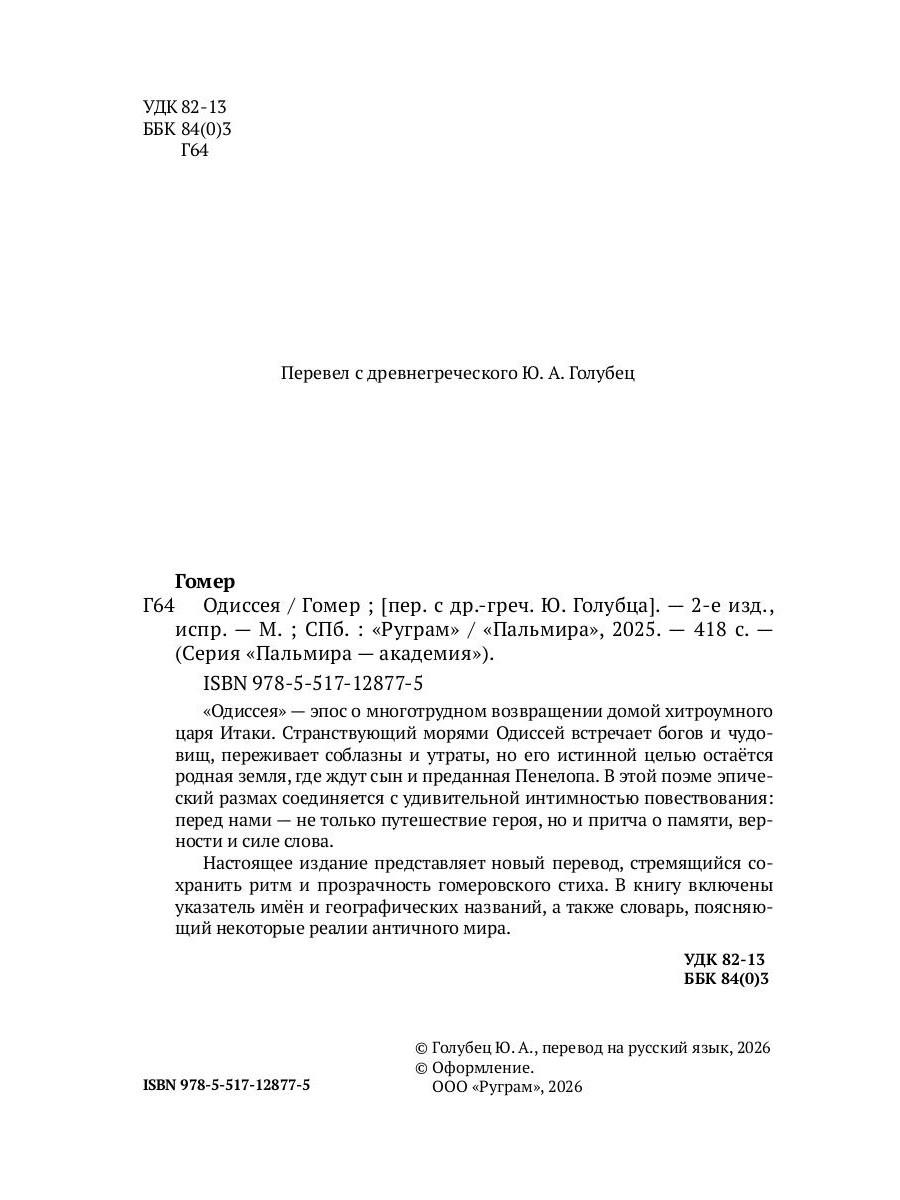 «Одиссея» - эпос о многотрудном возвращении домой хитроумного царя Итаки. Странствующий морями Одиссей встречает богов и чудовищ, переживает соблазны и утраты, но его истинной целью остаётся родная земля, где ждут сын и преданная Пенелопа. В этой поэме эпический размах соединяется с удивительной интимностью повествования: перед нами - не только путешествие героя, но и притча о памяти, верности и силе слова. Настоящее издание представляет новый перевод, стремящийся сохранить ритм и прозрачность гомеровского стиха. В книгу включены указатель имён и географических названий, а также словарь, поясняющий некоторые реалии античного мира.| Издательство | Т8 RUGRAM |