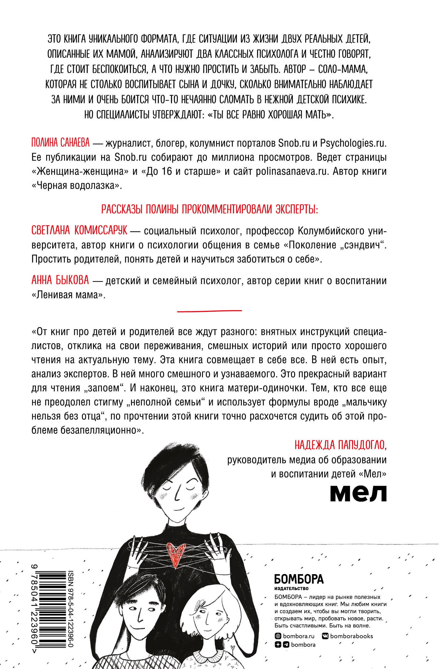 Это книга уникального формата, где ситуации из жизни двух реальных детей, описанные их мамой, анализируют два классных психолога и честно говорят, где стоит беспокоиться, а что нужно простить и забыть. Автор - соло-мама, которая не столько воспитывает сына и дочь, сколько внимательно наблюдает за ними и очень боится что-то нечаянно сломать в нежной детской психике. Но вот специалисты утверждают: «Ты все равно хорошая мать». Полина Санаева - журналист, блогер, колумнист порталов Snob.ru и Psychologies.ru. Ее публикации на Snob.ru собирают до миллиона просмотров. Управляет страницами на «Женщина-женщина» и «До 16 и старше» и сайтом polinasanaeva.ru Автор книги «Черная водолазка». Рассказы Полины прокомментировали эксперты: Светлана Комиссарук - социальный психолог, профессор Колумбийского университета, автор книги о психологии общения в семье «Поколение "сэндвич". Простить родителей, понять детей и научиться заботиться о себе» и Анна Быкова - детский и семейный психолог, автор серии книг о воспитании детей «Ленивая мама».