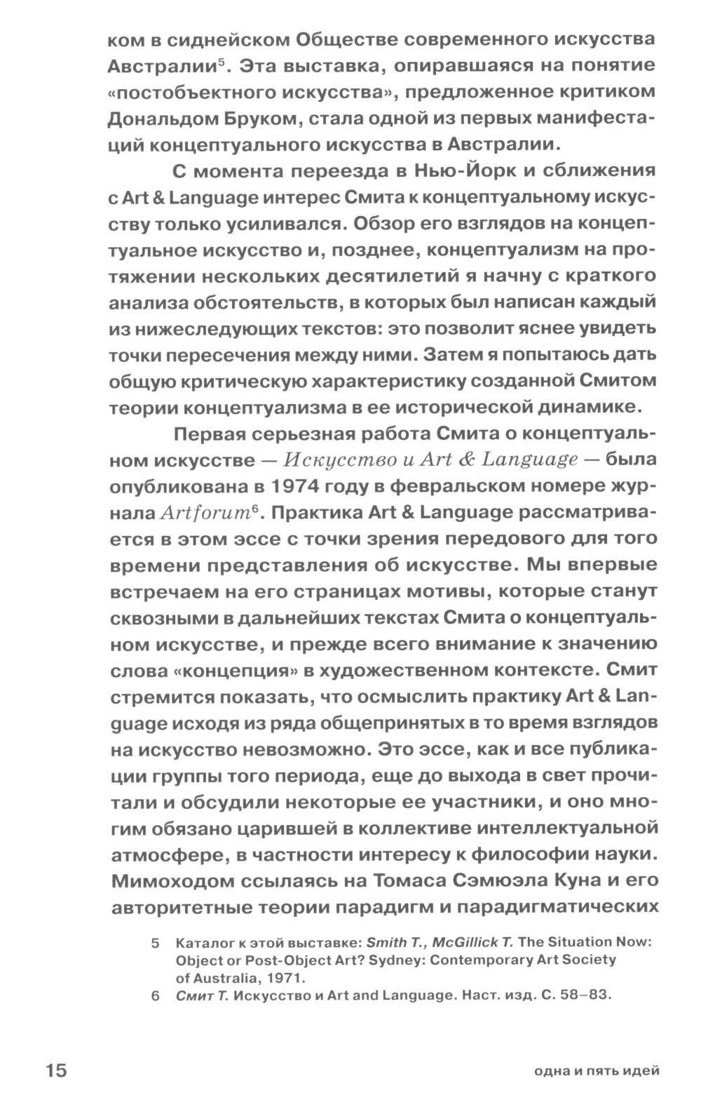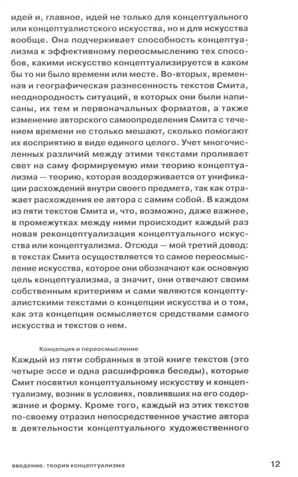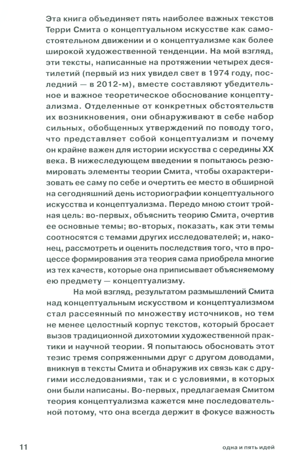 Терри Смит (род. 1944) - австралийский теоретик, критик и куратор современного искусства, бывший участник коллектива Art & Language, стоявшего у истоков западного концептуализма. Пять его эссе, собранные в этой книге и предваренные обстоятельным введением редактора, написаны в период с 1972 по 2012 год и посвящены природе концептуального искусства и концептуализма, рассматриваемой в теоретическом, философском, идеологическом, географическом и художественном аспектах. Смит представляет пять подходов и пять граней этого искусства в исторической динамике, глядя на него то изнутри (как участник группы концептуалистов), то извне (с позиции критики, философии, других вариантов концептуализма и т.д.) и обсуждая его роль посредника между поздним модернизмом и новейшим искусством.
