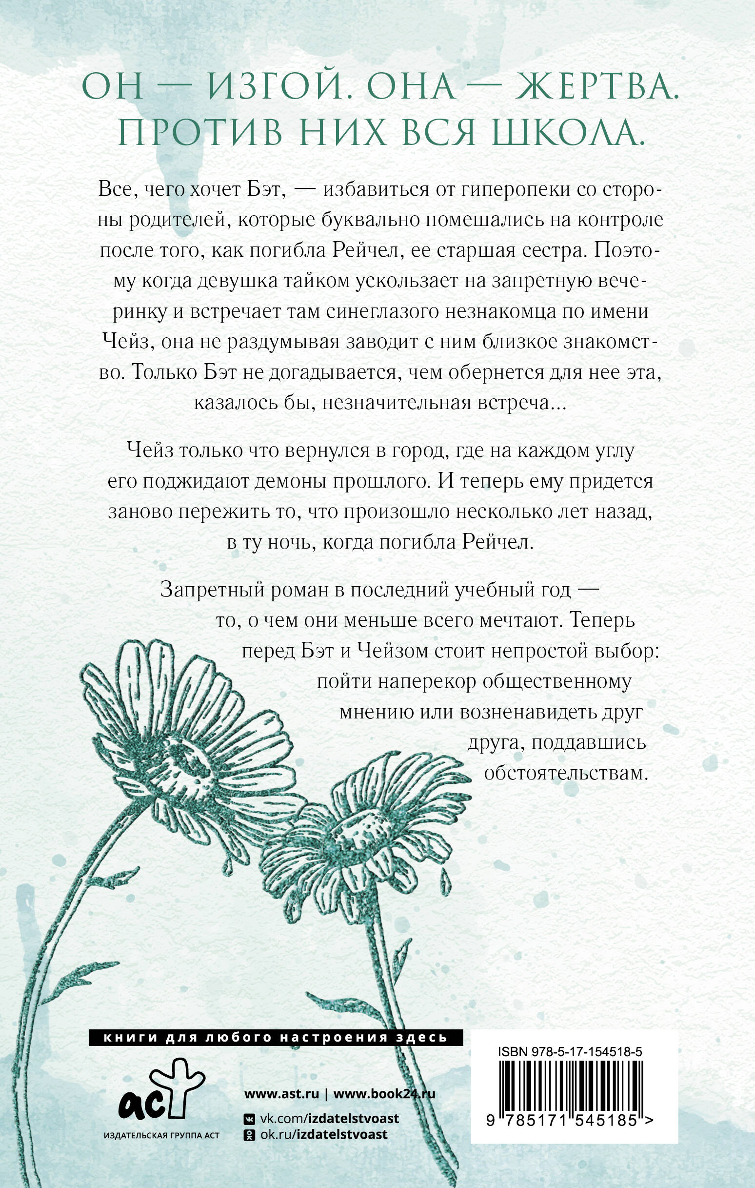 Все, чего хочет Бэт, - избавиться от гиперопеки со стороны родителей, которые буквально помешались на контроле после того, как погибла Рейчел, ее старшая сестра. Поэтому когда девушка тайком ускользает на запретную вечеринку и встречает там синеглазого парня по имени Чейз, она не раздумывая заводит с ним близкое знакомство. Только Бэт не догадывается, чем обернется для нее эта, казалось бы, незначительная встреча… Чейз только что вернулся в город, где на каждом углу его поджидают демоны прошлого. И теперь ему придется заново пережить то, что произошло несколько лет назад, в ту ночь, когда погибла Рейчел. Запретный роман в последний учебный год - то, о чем они меньше всего мечтают. Теперь перед Бэт и Чейзом стоит непростой выбор: пойти наперекор общественному мнению или возненавидеть друг друга, поддавшись обстоятельствам.| Издательство | ИЗДАТЕЛЬСТВО "АСТ" |