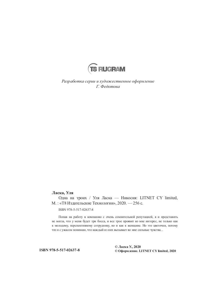 Попав на работу в компанию с очень сомнительной репутацией, я и представить не могла, что у меня будет три босса, и все трое проявят ко мне интерес, не только как к молодому, перспективному сотруднику, но и как к женщине. Но это цветочки, потому что я с ужасом понимаю, что каждый из них вызывает во мне сильные чувства...| Издательство | Т8 RUGRAM |