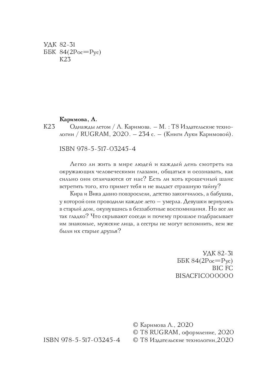 Легко ли жить в мире людей и каждый день смотреть на окружающих человеческими глазами, общаться и осознавать, как сильно они отличаются от нас? Есть ли хоть крошечный шанс встретить того, кто примет тебя и не выдаст страшную тайну? Кира и Вика давно повзрослели, детство закончилось, а бабушка, у которой они проводили каждое лето - умерла. Девушки вернулись в старый дом, окунувшись в беззаботные воспоминания. Но все ли так гладко? Что скрывают соседи и почему прошлое подбрасывает им знакомые, мужские лица, а сестры не могут вспомнить, кем же были их старые друзья?| Издательство | Т8 RUGRAM |