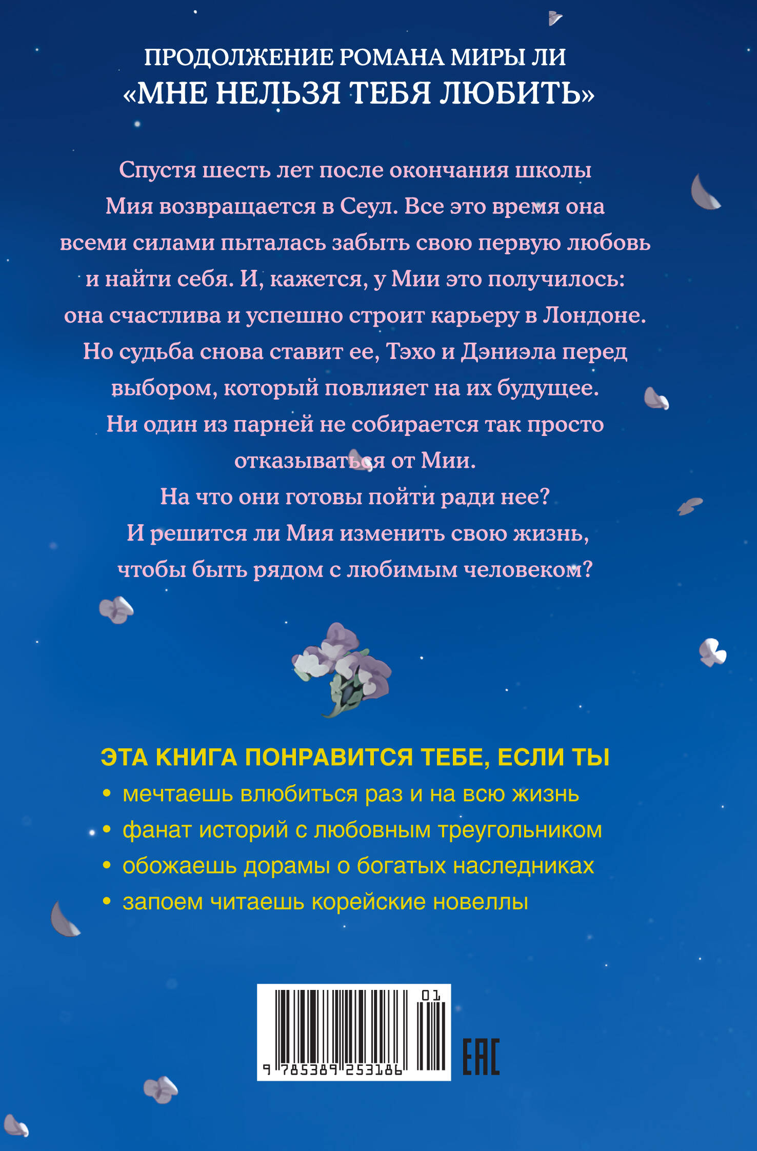 Продолжение романа Миры Ли "Мне нельзя тебя любить"! Спустя шесть лет после окончания школы, Мия возвращается в Сеул. Все это время она всеми силами пыталась забыть свою первую любовь и найти себя. И, кажется, у Мии это получилось: она счастлива и успешно строит карьеру в Лондоне. Но судьба снова ставит ее, Тэхо и Дэниэла перед выбором, который повлияет на их будущее. Ни один из парней не собирается так просто отказываться от Мии. На что они готовы пойти ради нее? И решиться ли Мия изменить свою жизнь, чтобы быть рядом с любимым человеком? Эта книга понравится тебе, если ты • мечтаешь влюбиться раз и на всю жизнь • фанат историй с любовным треугольником • обожаешь дорамы о богатых наследниках • запоем читаешь корейские новеллы| Издательство | Азбука-Аттикус Издат.группа ООО |
