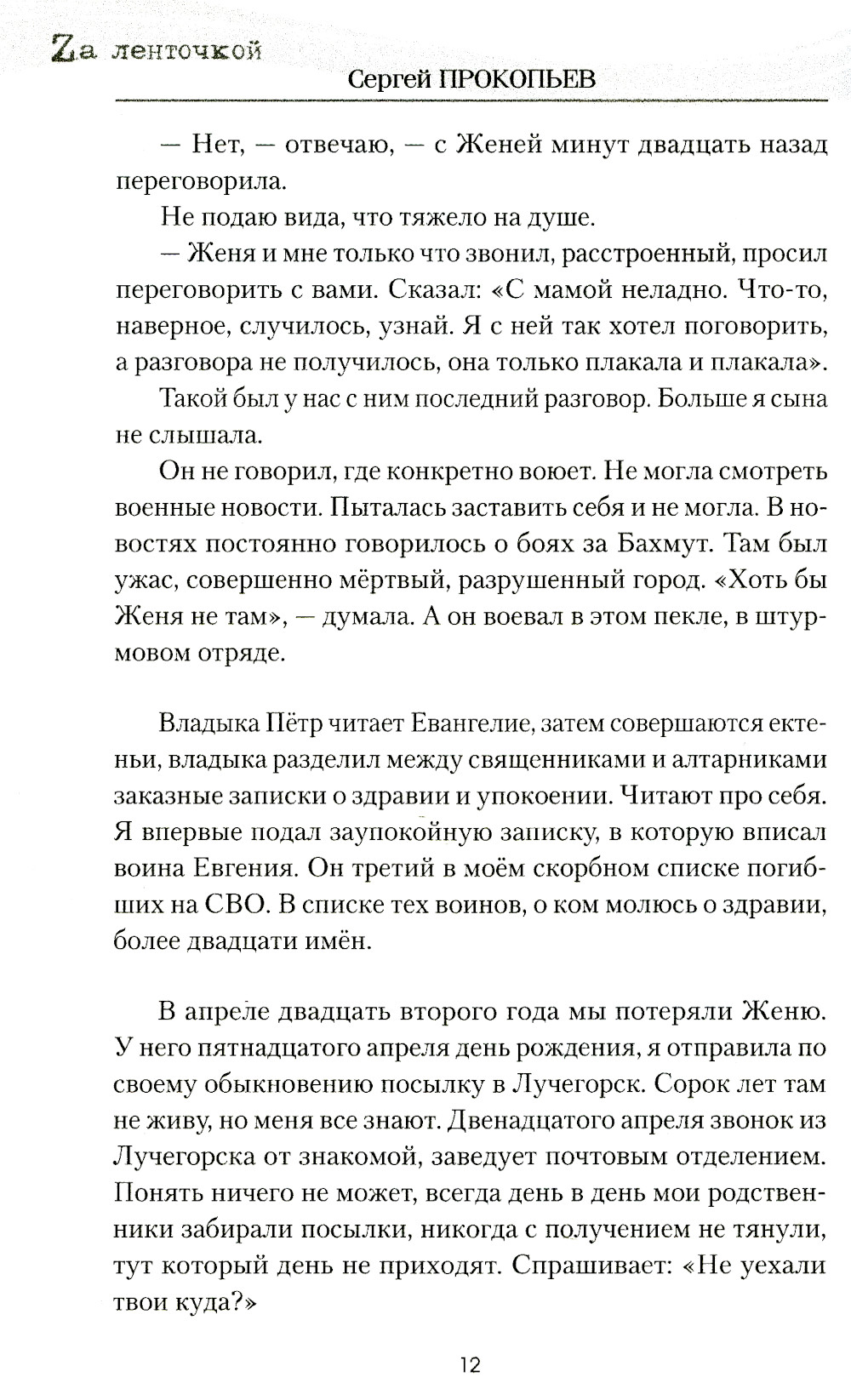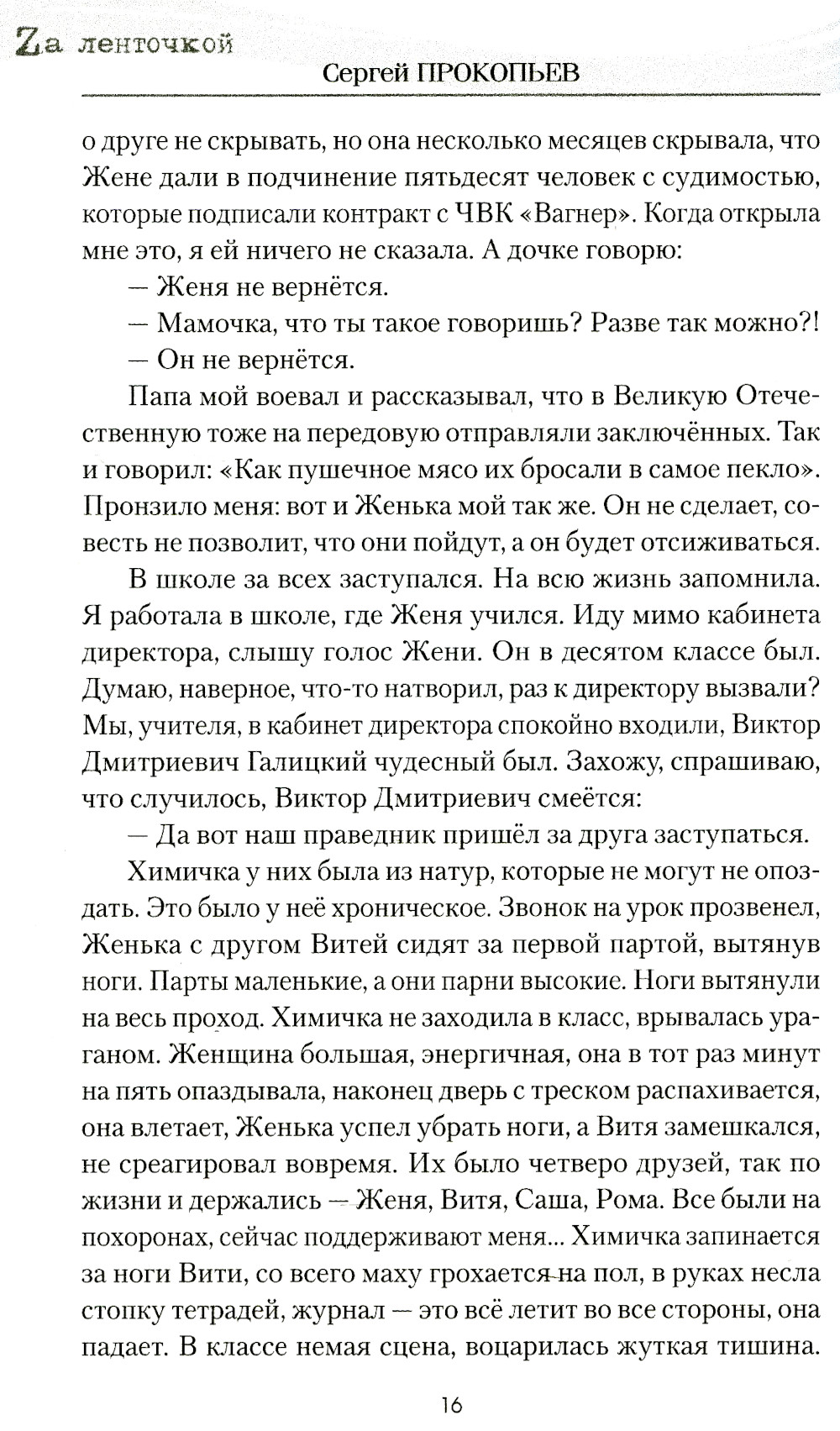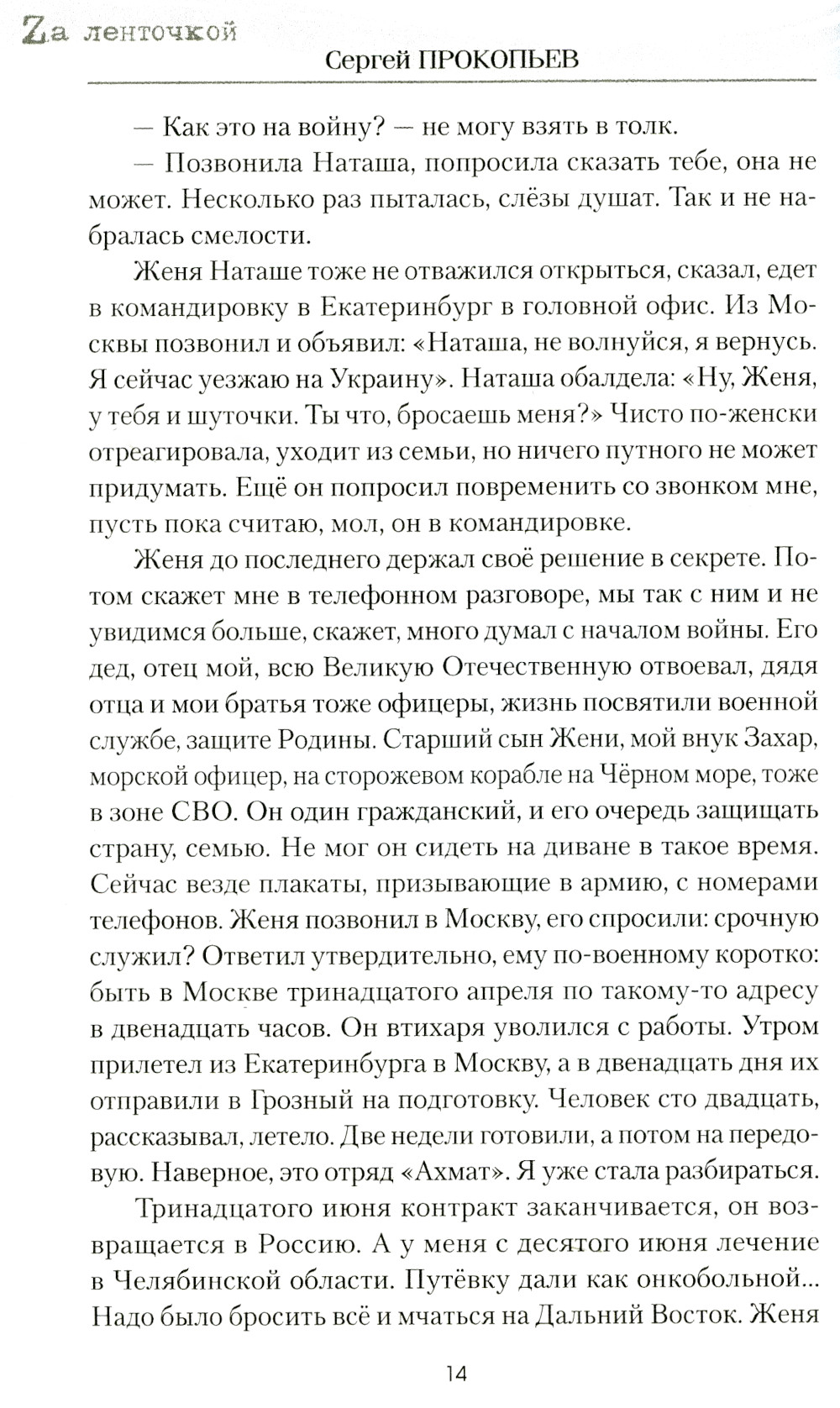 В новую книгу известного омского писателя Сергея Прокопьева вошли рассказы, объединённые темой Специальной военной операции. Герои книги, будь они на передовой или в тылу, опалены войной. Это добровольцы и бойцы ЧВК «Вагнер», штурмовики и артиллеристы, полковые священники, окормляющие воинов на передовой, волонтёры, работающие изо дня в день на нужды фронта в глубоком тылу, и те, кто возит гуманитарную помощь «за ленточку», вдовы погибших воинов, матери солдат, отдавших жизнь за Отчизну. Война вошла в их жизнь победами над собой, невосполнимыми утратами, новыми смыслами и духовными открытиями.| Издательство | Вече |