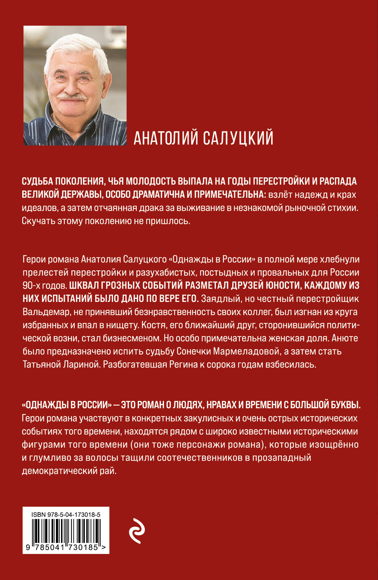 Роман «Однажды в России» будет интересен читателям разных возрастов - как старшему поколению, так и сорокалетним, и совсем юным. Автор описывает события, происходящие в драматическую, переломную эпоху в истории нашей страны. Не столь далекую и современникам хорошо известную, но уже слегка присыпанную пылью времени и пока не до конца осознанную. Книга повествует о судьбах двадцатилетних, угодивших в штормовые перестроечные и лихие 90-е годы. Это современная история об «унесенных ветром», любимых и любящих, обстоятельствами времени и жизни разбросанных по городам и весям. Главные герои, Вальдемар и Анна, вынуждены принимать непростые решения: с кем они? Что для них высшее благо? Что допустимо, а через что переступить невозможно? Где заканчивается самопожертвование и начинается предательство своих идеалов? Но в самые тяжелые минуты Анна вспоминает слова своего деда: мечта выше рангом, чем надежда, и всегда должна быть с тобой. Мечта, которая спасала на самом краю. А к Вальдемару приходит откровение: любовь без счастья бывает, а счастье без любви - никогда! Книга написана на основе реальных событий, происходивших в те годы в России и, в частности, в Москве.| Издательство | ООО "Издательство "Эксмо" |