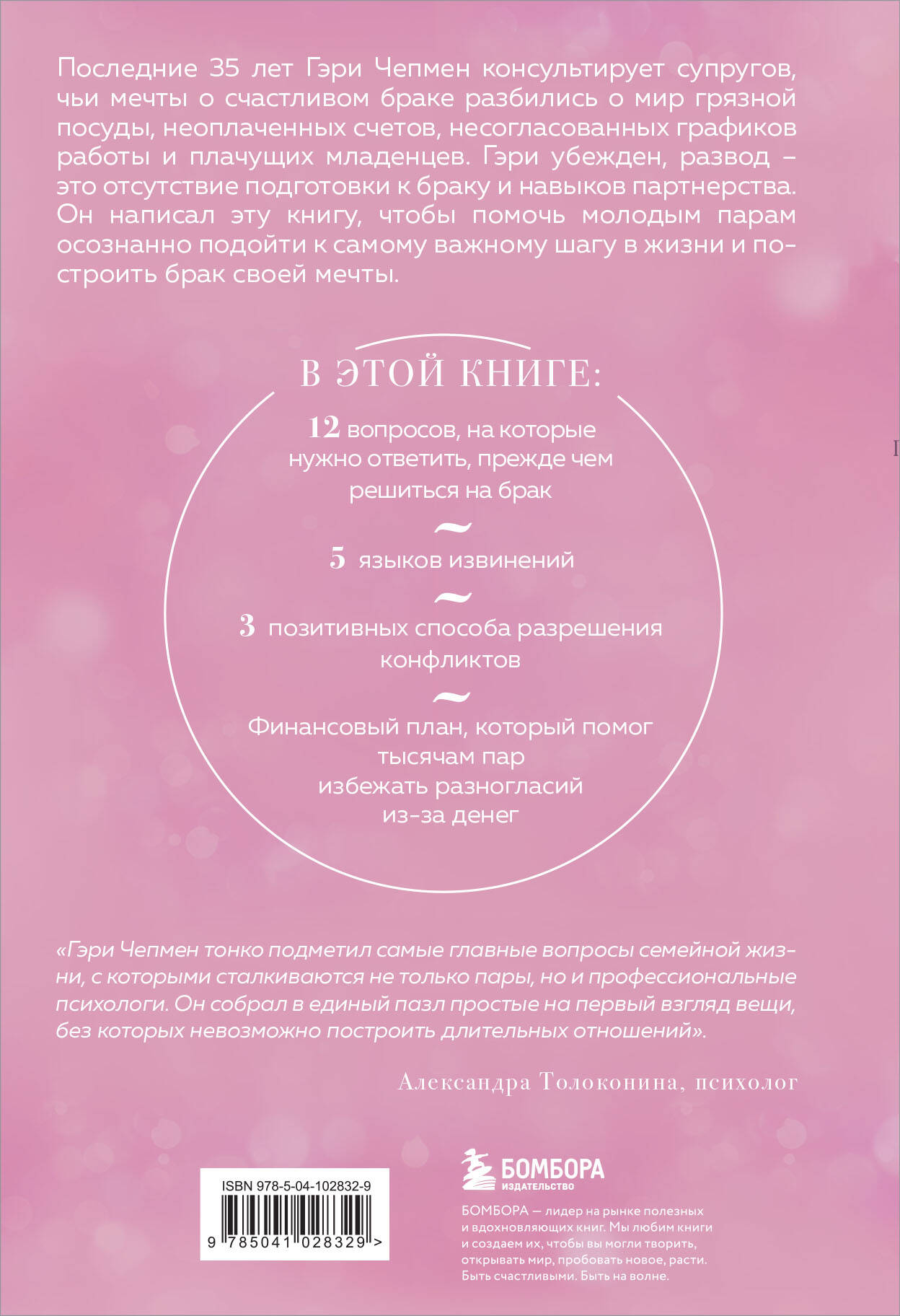 ОДНОЙ ВЛЮБЛЕННОСТИ НЕДОСТАТОЧНО, ЧТОБЫ ПОСТРОИТЬ СЧАСТЛИВЫЙ БРАК. Он неряха, а она терпеть не может бардака. Она обожает шумные вечеринки, а он не выносит толпы. Он записывает каждую покупку, а она тратит деньги, не проверяя баланс по карте. Их брак обречен? Зачастую мы женимся, ослепленные влюбленностью, считая партнера идеальным. Но спустя пару лет после свадьбы начинаем подмечать все недостатки друг друга. Последние 35 лет Гэри Чепмен консультирует супругов, чьи мечты о счастливом браке разбились о мир грязной посуды, неоплаченных счетов, несогласованных графиков работы и плачущих младенцев. Гэри убежден, развод - это отсутствие подготовки к браку и навыков партнерства. Он написал эту книгу, чтобы помочь молодым парам осознанно подойти к самому важному шагу в жизни. Ответив на 12 вопросов из книги, вы сможете построить брак своей мечты. В ЭТОЙ КНИГЕ: • 12 вопросов, на которые нужно ответить, прежде чем идти в ЗАГС. • 5 языков извинений. • 3 позитивных способа решения конфликтов. • Финансовый план, который помог тысячам пар избежать войны за деньги. ОБ АВТОРЕ Гэри Чепмен - всемирно известный специалист по вопросам семьи и межличностных отношений. Его книги изданы в 37 странах и помогли миллионам людей наполнить жизнь теплом и любовью. «Гэри Чепмен тонко подметил самые главные вопросы семейной жизни, с которыми сталкиваются не только пары, но и профессиональные психологи. Он собрал в единый пазл простые, на первый взгляд, вещи, без которых невозможно построить длительных отношений». - Александра Толоконина, психолог| Издательство | ООО "Издательство "Эксмо" |