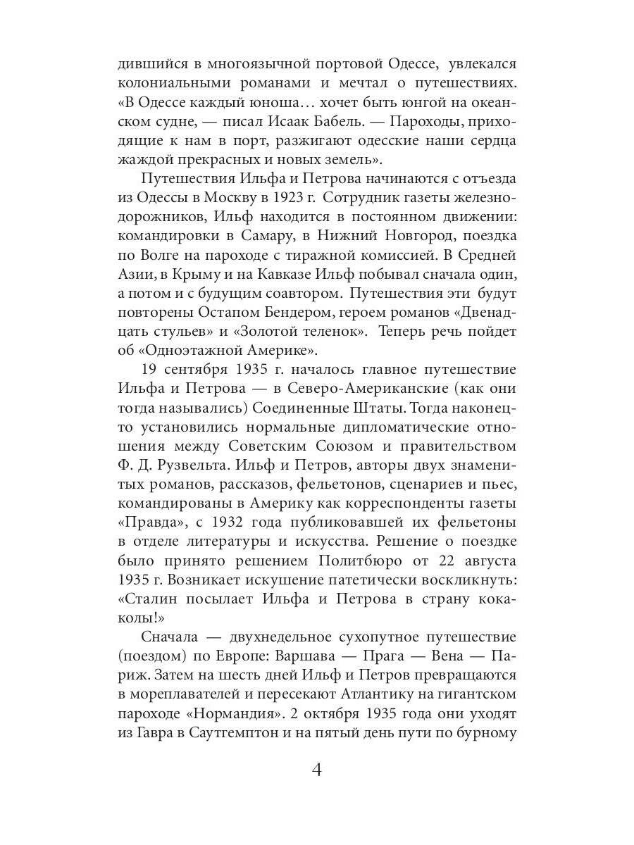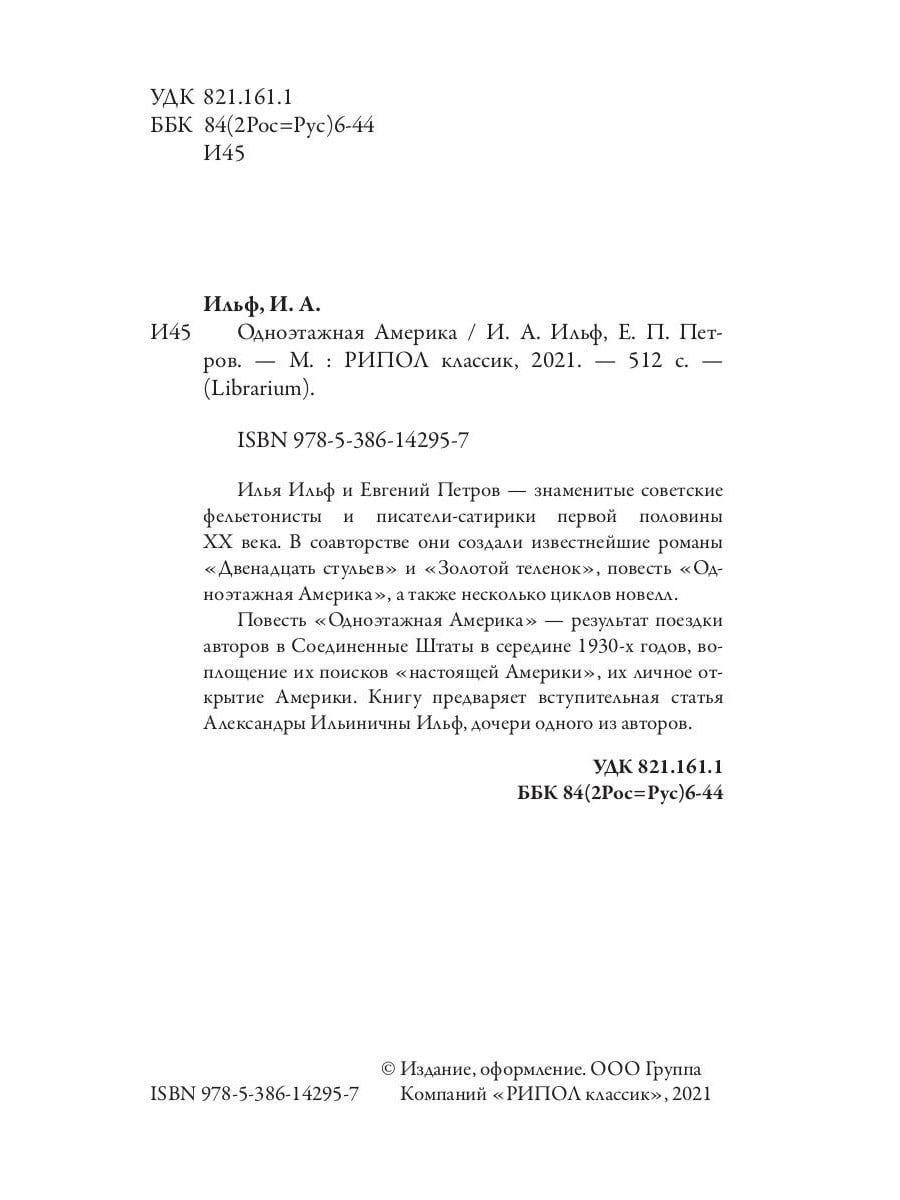 Повесть «Одноэтажная Америка» - результат поездки авторов в Соединенные Штаты в середине 1930-х годов, воплощение их поисков «настоящей Америки», их личное открытие Америки. Книгу предваряет вступительная статья Александры Ильиничны Ильф, дочери одного из авторов.