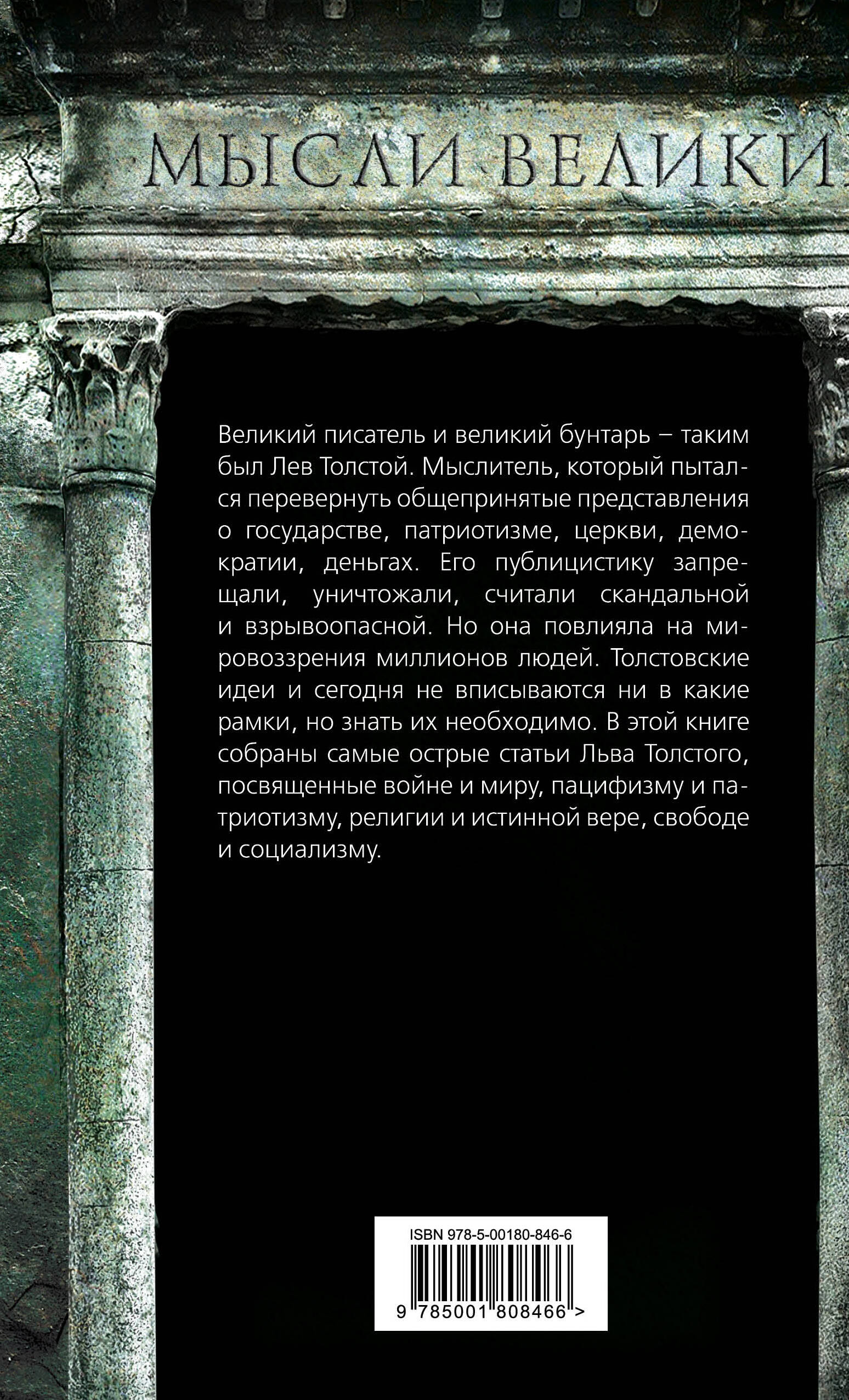 Великий писатель и великий бунтарь - таким был Лев Толстой. Мыслитель, который пытался перевернуть общепринятые представления о государстве, патриотизме, церкви, демократии, деньгах. Его публицистику запрещали, уничтожали, считали скандальной и взрывоопасной. Но она повлияла на мировоззрения миллионов людей. Толстовские идеи и сегодня не вписываются ни в какие рамки, но знать их необходимо. В этой книге собраны самые острые статьи Льва Толстого, посвященные войне и миру, пацифизму и патриотизму, религии и истинной вере, свободе и социализму.| Издательство | Родина Издательство ООО |