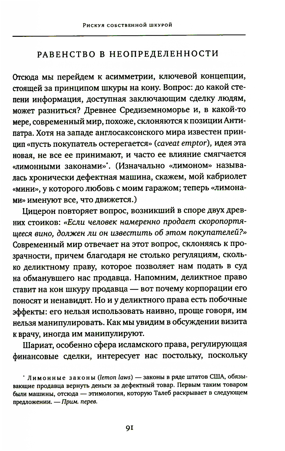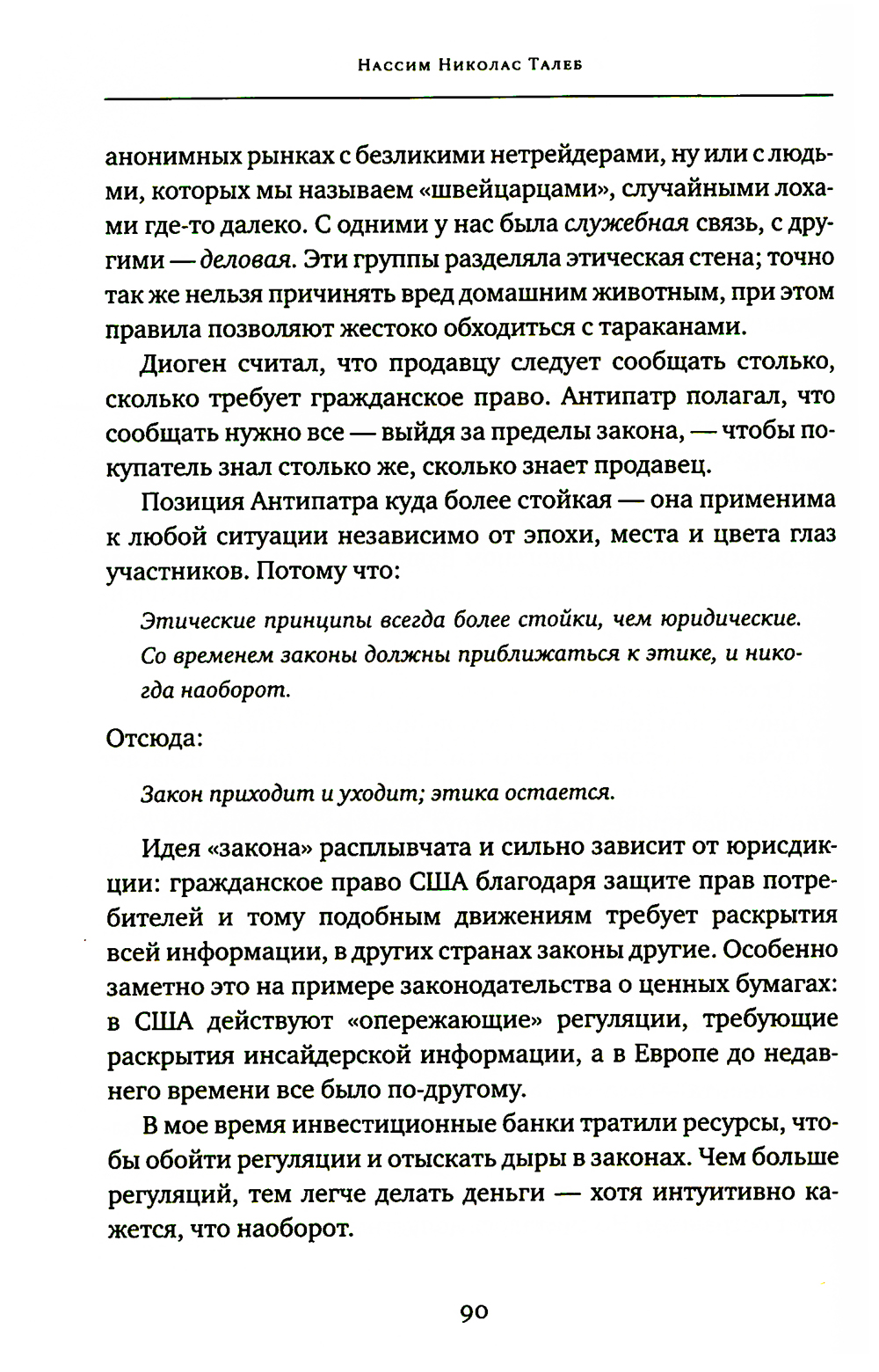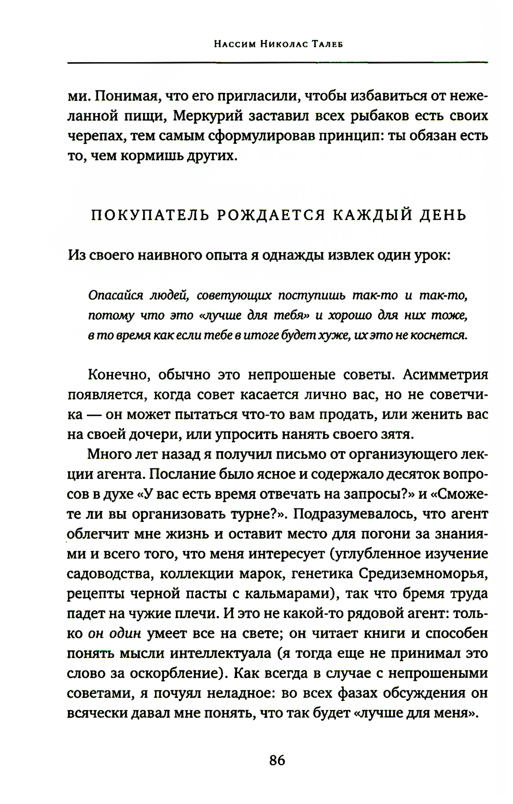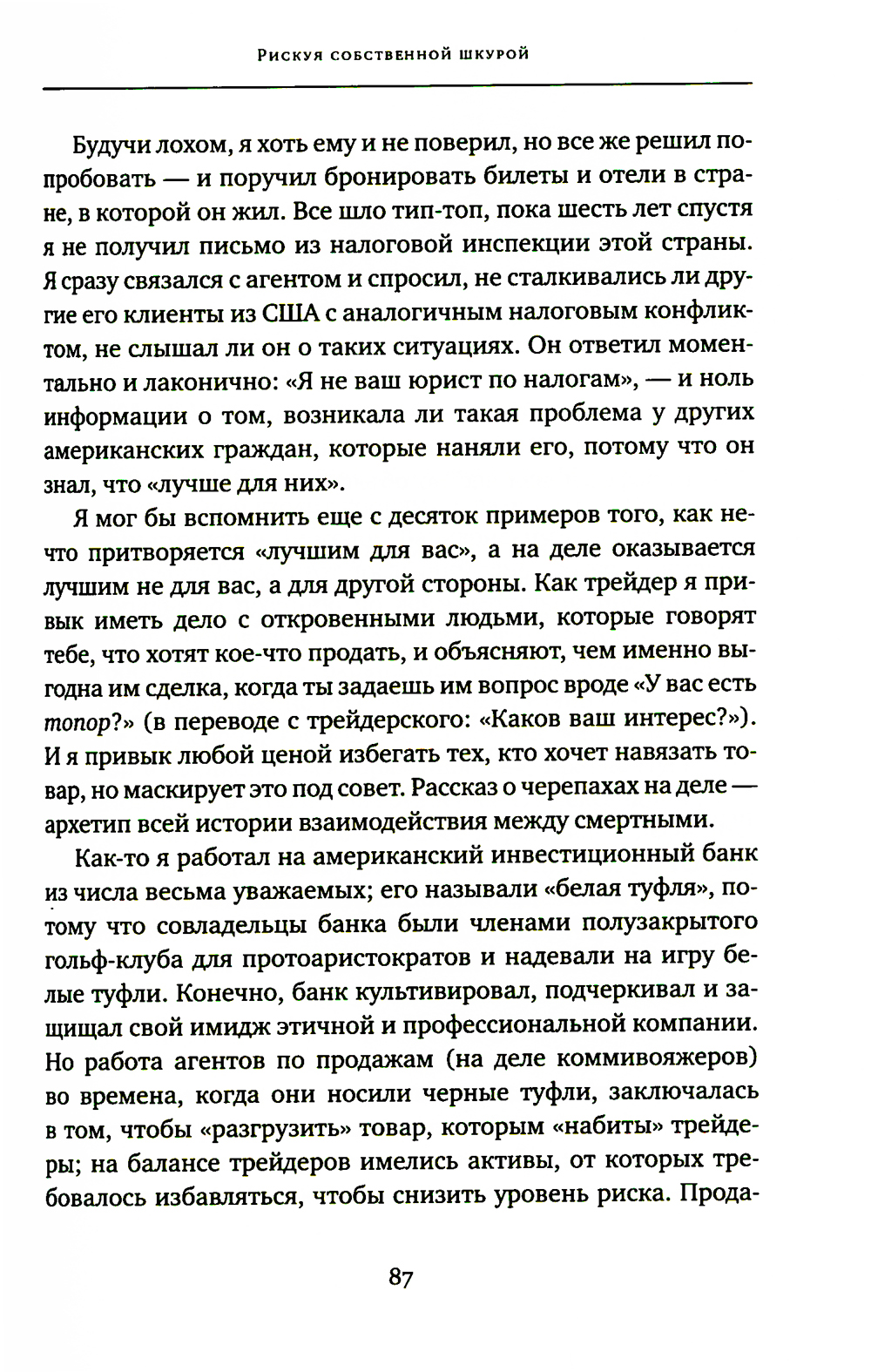 Комплект содержит книги Нассима Николаса Талеба: «Одураченные случайностью» Случайность, удача, шанс, неопределенность, вероятность, человеческие ошибки, риск и принятие решений в мире, который мы не понимаем, - неисчерпаемые в своей многогранности темы, которые исследует успешный трейдер, математик и философ Нассим Талеб, подготавливая нас к достойной встрече лицом к лицу с вызовами и непредвиденными событиями любого рода. «Вероятность - это не столько вычисление шансов при бросании костей, сколько признание недостатка определенности в наших знаниях и развитие методов обращения с нашим неведением. За пределами учебников и казино вероятность почти никогда не предстает в виде математической задачи или загадки для ума. Мать-природа не скажет вам, сколько лунок есть на столе для игры в рулетку, да и задачи она формулирует не в том стиле, который принят в учебниках (в реальном мире приходится искать проблему, а не решение). Вероятностное мышление, лежащее в основе этой книги, предполагает, что, если бы осуществились альтернативные исходы, мир был бы другим». «Рискуя собственной шкурой» В своей новой, резко провокационной и одновременно предельно прагматичной книге неподражаемый Николас Нассим Талеб рассказывает, как важно идентифицировать и фильтровать чушь, отличать теорию от практики, поверхностную компетентность от настоящей. Вы узнаете, что такое рациональность в сложных системах и реальном мире, симметрия и асимметрия и в чем состоит логика принятия рисков. Наполняя новым смыслом привычные понятия, такие как «справедливое общество», «профессиональный успех», «личная ответственность», и не боясь задеть эго признанных кумиров, Талеб развенчивает лицемерные идеи и действия апологетов военного вмешательства, инвесторов рынка ценных бумаг и религиозных проповедников. На примерах Хаммурапи и Иисуса Христа, римских и византийских императоров, Сенеки и Дональда Трампа Талеб показывает, что самое важное качество, объединяющее прославленных героев, беззаветных святых и гениальных бизнесменов, - не переносить риск на других. «Я люблю, когда меня удивляют. В соответствии с принципом взаимной выгоды я зову читателя в путешествие, которое понравилось бы мне самому».| Издательство | КоЛибри |