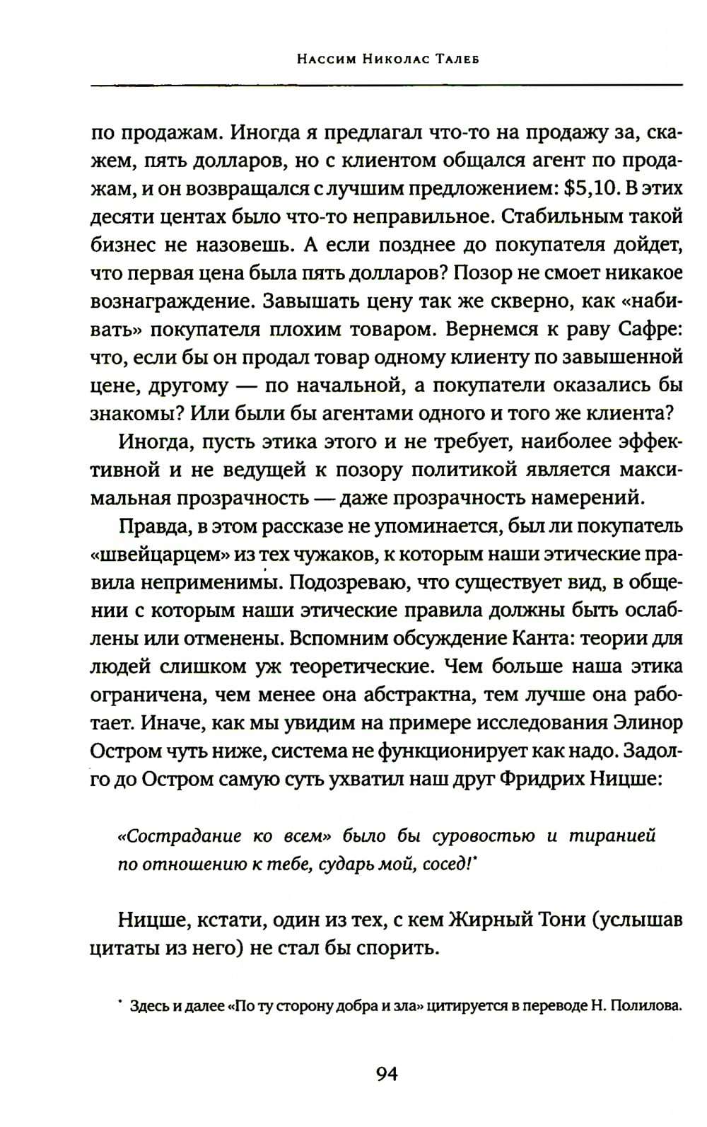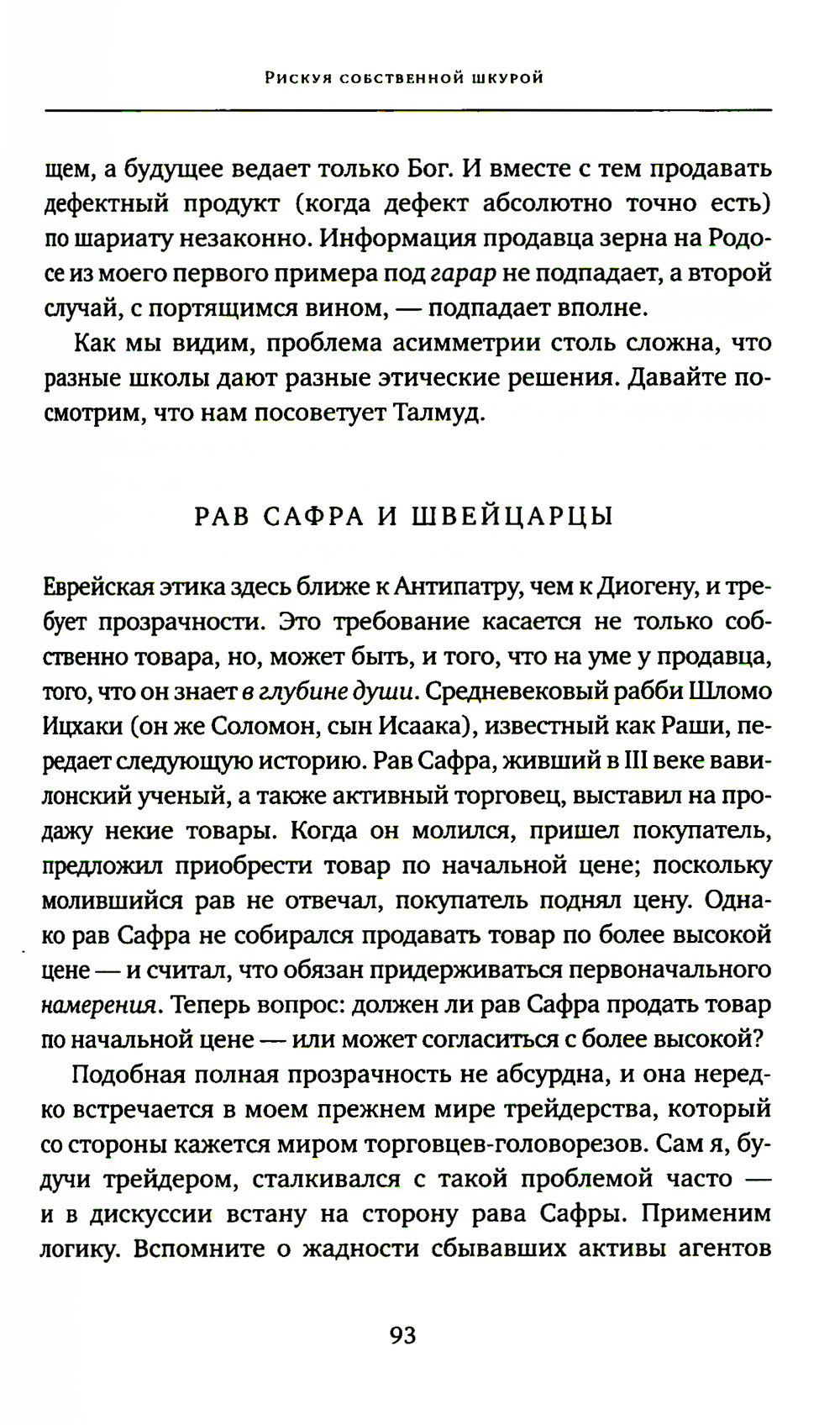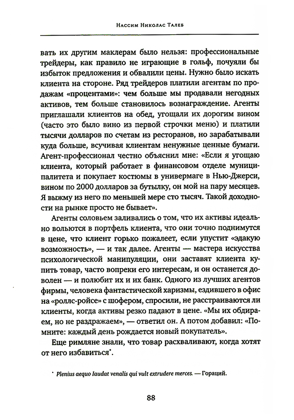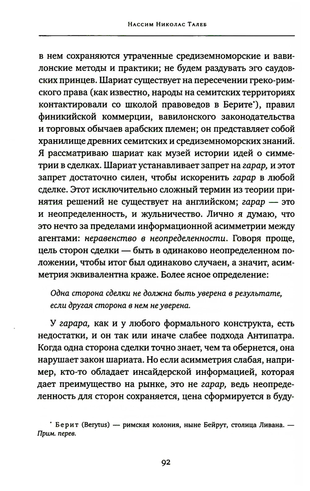 Комплект содержит книги Нассима Николаса Талеба: «Одураченные случайностью» Случайность, удача, шанс, неопределенность, вероятность, человеческие ошибки, риск и принятие решений в мире, который мы не понимаем, - неисчерпаемые в своей многогранности темы, которые исследует успешный трейдер, математик и философ Нассим Талеб, подготавливая нас к достойной встрече лицом к лицу с вызовами и непредвиденными событиями любого рода. «Вероятность - это не столько вычисление шансов при бросании костей, сколько признание недостатка определенности в наших знаниях и развитие методов обращения с нашим неведением. За пределами учебников и казино вероятность почти никогда не предстает в виде математической задачи или загадки для ума. Мать-природа не скажет вам, сколько лунок есть на столе для игры в рулетку, да и задачи она формулирует не в том стиле, который принят в учебниках (в реальном мире приходится искать проблему, а не решение). Вероятностное мышление, лежащее в основе этой книги, предполагает, что, если бы осуществились альтернативные исходы, мир был бы другим». «Рискуя собственной шкурой» В своей новой, резко провокационной и одновременно предельно прагматичной книге неподражаемый Николас Нассим Талеб рассказывает, как важно идентифицировать и фильтровать чушь, отличать теорию от практики, поверхностную компетентность от настоящей. Вы узнаете, что такое рациональность в сложных системах и реальном мире, симметрия и асимметрия и в чем состоит логика принятия рисков. Наполняя новым смыслом привычные понятия, такие как «справедливое общество», «профессиональный успех», «личная ответственность», и не боясь задеть эго признанных кумиров, Талеб развенчивает лицемерные идеи и действия апологетов военного вмешательства, инвесторов рынка ценных бумаг и религиозных проповедников. На примерах Хаммурапи и Иисуса Христа, римских и византийских императоров, Сенеки и Дональда Трампа Талеб показывает, что самое важное качество, объединяющее прославленных героев, беззаветных святых и гениальных бизнесменов, - не переносить риск на других. «Я люблю, когда меня удивляют. В соответствии с принципом взаимной выгоды я зову читателя в путешествие, которое понравилось бы мне самому».| Издательство | КоЛибри |
