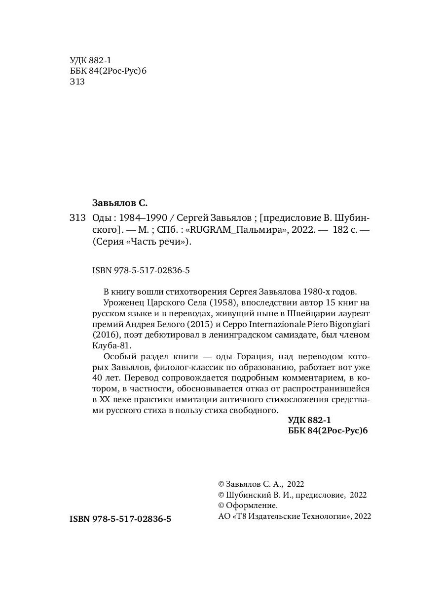В книгу вошли стихотворения Сергея Завьялова 1980-х годов. Уроженец Царского Села (1958), впоследствии автор 15 книг на русском языке и в переводах, живущий ныне в Швейцарии лауреат премий Андрея Белого (2015) и Серро Internazionale Piero Bigongiari (2016), поэт дебютировал в ленинградском самиздате, был членом Клуба-81. Особый раздел книги - оды Горация, над переводом которых Завьялов, филолог-классик по образованию, работает вот уже 40 лет. Перевод сопровождается подробным комментарием, в котором, в частности, обосновывается отказ от распространившейся в XX веке практики имитации античного стихосложения средствами русского стиха в пользу стиха свободного.| Издательство | Т8 RUGRAM |
