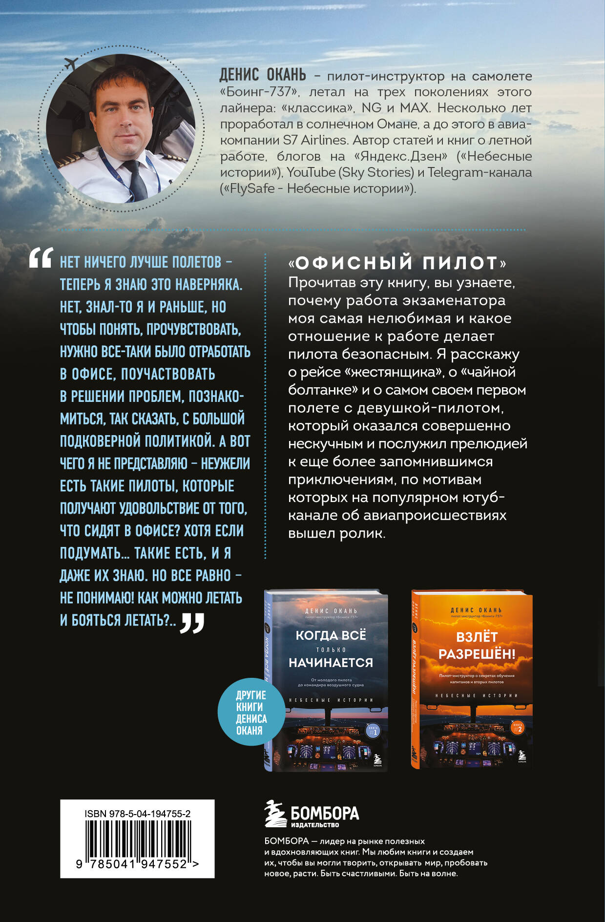 Каждый день по всему миру самолеты гражданской авиации совершают пару сотен тысяч взлетов и посадок. Двадцать четыре часа в сутки, семь дней в неделю и триста шестьдесят пять дней в году тысячи лайнеров покидают твердую земную поверхность, чтобы через некоторое время вернуться обратно, соединив при этом города, страны и судьбы. ДЕНИС ОКАНЬ, пилот-инструктор гражданской авиации, написал третью книгу о главном деле своей жизни. Его первая книга «КОГДА ВСЕ ТОЛЬКО НАЧИНАЕТСЯ» - это история о самых первых шагах в профессии пилота. В книге Денис вспоминает учебу в Бугурусланском летном училище, Академии гражданской авиации г. Санкт-Петербурга и учебном центре United Airlines в США, свои первые шаги в освоении самолетов Ан-2, Ту-154, Боинга 737 и, конечно, памятные рейсы, случившиеся в начале его летной карьеры. Делится тонкостями летного дела и вспоминает путь, который он проделал от неопытного пилота до командира воздушного судна. Вы узнаете, чему учатся пилоты и как готовятся к выполнению поставленных задач, как выполняются полеты по реальным маршрутам в различных погодных условиях, как справляются с нестандартными ситуациями, и многое другое о буднях гражданской авиации. Во второй книге «ВЗЛЕТ РАЗРЕШЕН» Денис Окань вместе с читателями совершает захватывающие рейсы. Он рассказывает об устройстве самолета, вспоминает курьезные случаи из практики и делится своей любовью к этой профессии. Как проходят полеты в туман, дождь или грозу? Что кроме непростых погодных условий может усложнить рейс? Почему так важна роль капитана в полете и какие правила существуют в экипаже? Что такое предполетная подготовка и что в нее входит? Как инструктируют будущих пилотов? Вы побываете в сложных рейсах, в разных городах и аэропортах, увидите, как работает экипаж самолета, как совершаются сложные посадки, управление самолетом в непогоду и многое другое. Рассказы Дениса Оканя перенесут вас высоко в небо и даже позволят почувствовать себя помощником пилота.| Издательство | ООО "Издательство "Эксмо" |