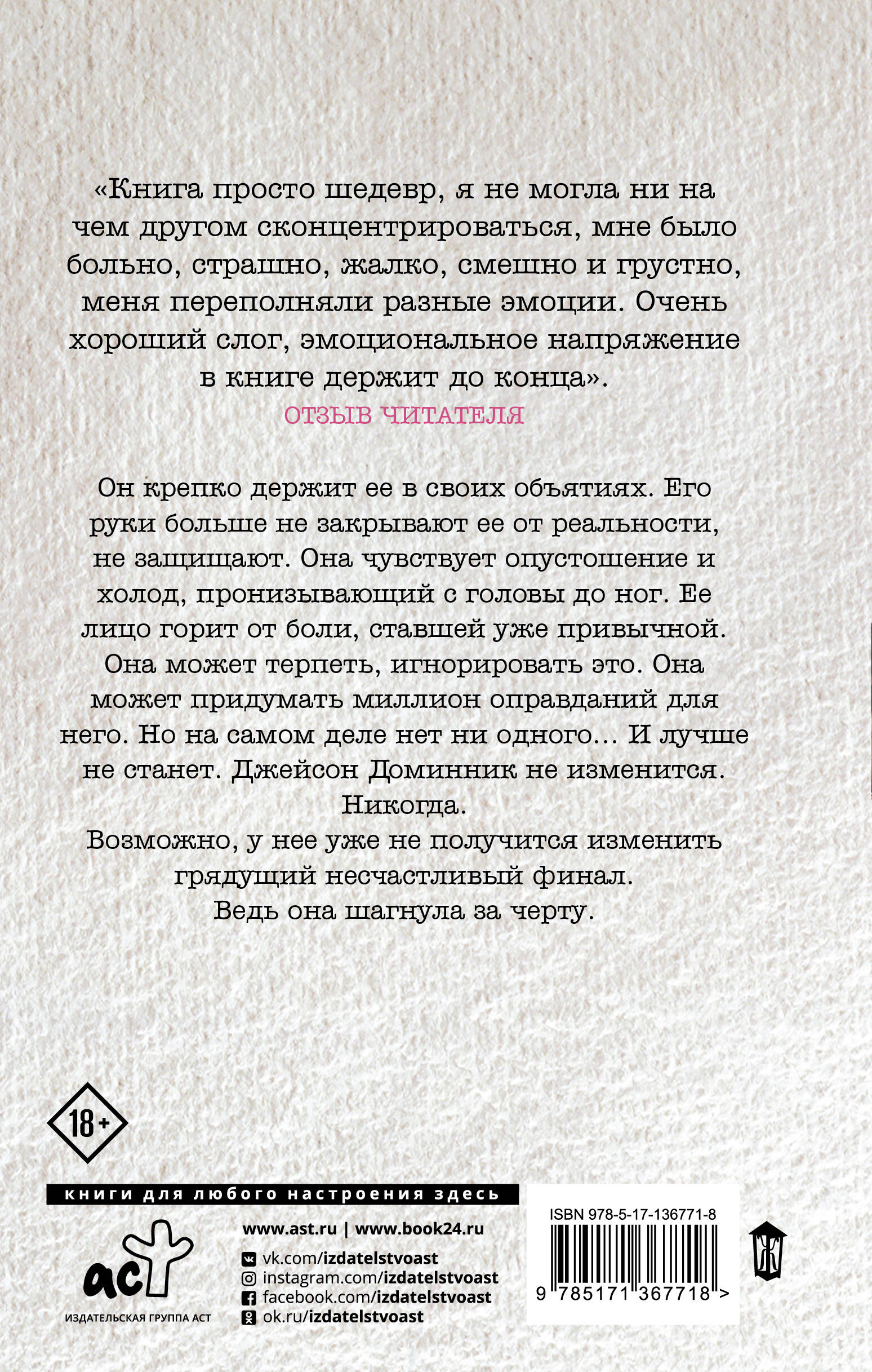 Он крепко держит ее в своих объятиях. Его руки больше не закрывают ее от реальности, не защищают. Она чувствует опустошение и холод, пронизывающий с головы до ног. Ее лицо горит от боли, ставшей уже привычной. Она может терпеть, игнорировать это. Она может придумать миллион оправданий для него. Но на самом деле нет ни одного… И лучше не станет. Джейсон Доминник не изменится. Никогда. Возможно, у нее уже не получится изменить грядущий несчастливый финал. Ведь она шагнула за черту. Вторая книга трилогии "Офсайд"| Издательство | ИЗДАТЕЛЬСТВО "АСТ" |