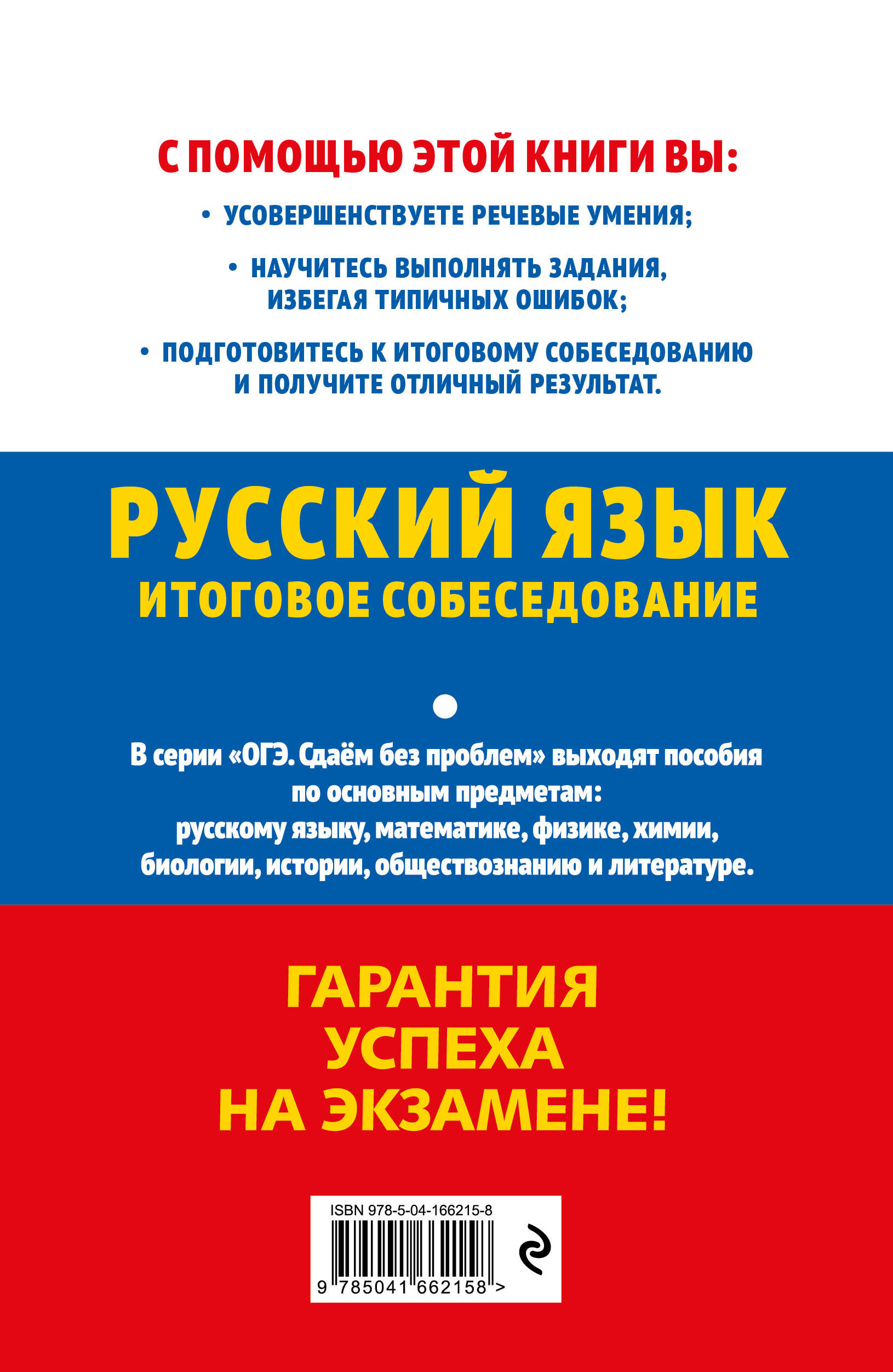 Пособие содержит все необходимые материалы для комплексной подготовки к итоговому собеседованию в 9 классе, являющемуся допуском к сдаче ОГЭ. Издание даст исчерпывающее представление о проведении и содержании итогового собеседования, практические материалы пособия помогут учителям организовать эффективные уроки развития речи. Издание содержит обширный обучающий материал по каждому экзаменационному заданию: необходимые теоретические сведения, советы и рекомендации, инструкции, разнообразные практические упражнения, а также тренировочные варианты, соответствующие демо-версии. Кроме того, приводятся правила описания фотографий, темы для беседы с примерными вопросами экзаменатора, образцы монологических высказываний, перечень речевых и грамматических ошибок и другая полезная информация. Книга предназначена для подготовки учащихся к итоговому собеседованию по русскому языку, а также учителям для организации уроков развития речи.| Издательство | Эксмо |