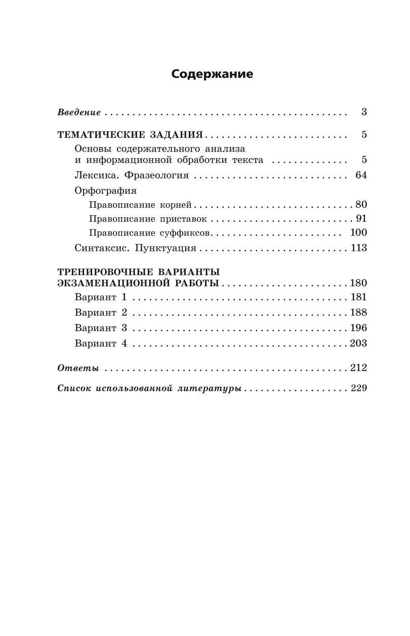 Книга предназначена для подготовки учащихся к ОГЭ по русскому языку. Пособие содержит тематические задания с ответами, составленные на основе анализа ошибок, возникающих у учеников при выполнении экзаменационной работы. Для итогового контроля приводятся тренировочные варианты ОГЭ. Издание адресовано учащимся 9-х классов, будет полезно учителям русского языка, так как дает возможность эффективно организовать учебный процесс и подготовку к экзамену. Тематические задания разных типов и уровней сложности помогут школьникам закрепить знания, а тренировочные варианты с ответами - эффективно попрактиковаться в выполнении экзаменационных заданий.| Издательство | ООО "Издательство "Эксмо" |