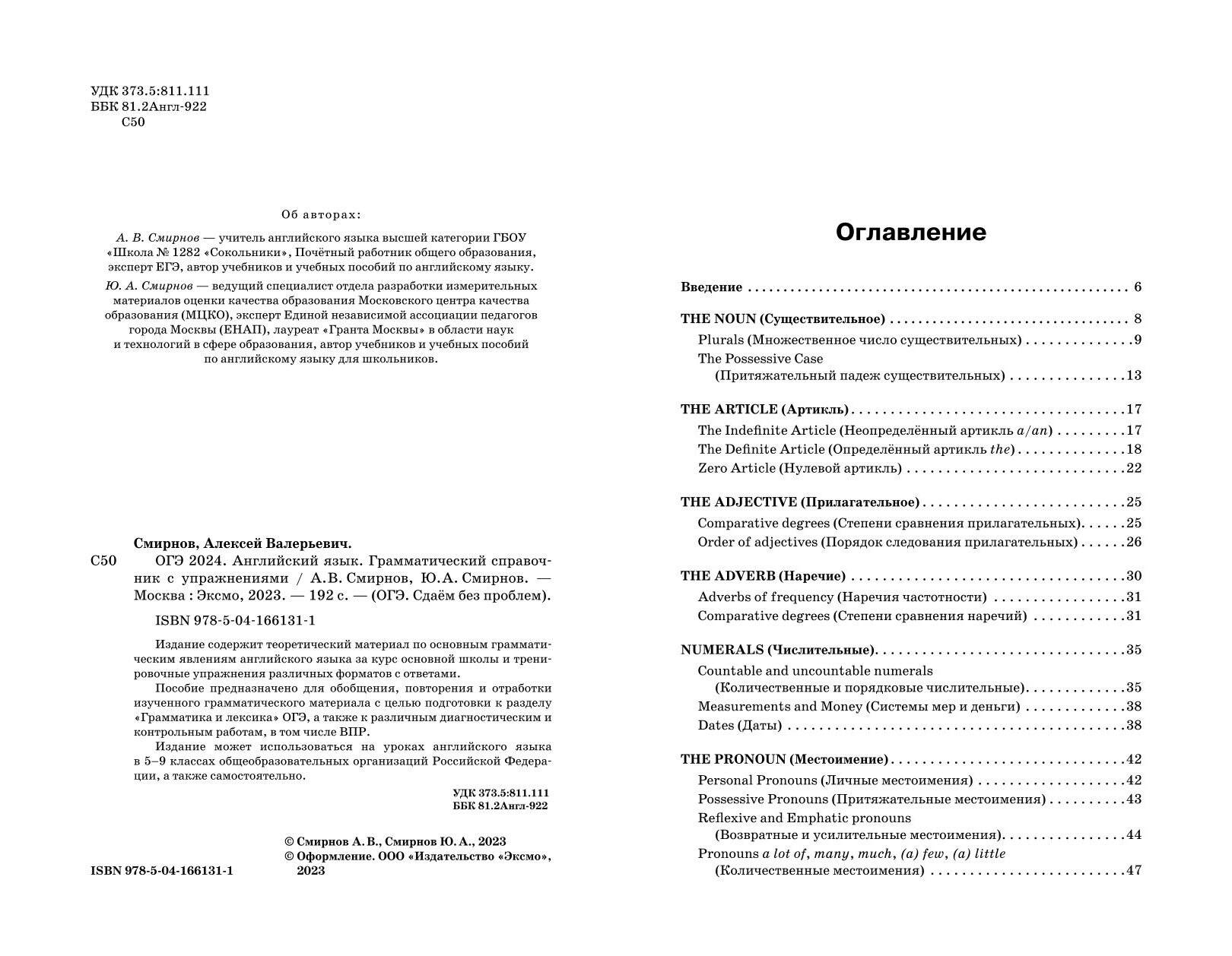 Издание содержит теоретический материал по основным грамматическим явлениям английского языка за курс основной школы и тренировочные упражнения различных форматов с ответами. Пособие предназначено для обобщения, повторения и отработки изученного грамматического материала с целью подготовки к разделу «Грамматика и лексика» ОГЭ 2025 года, а также к различным диагностическим и контрольным работам, в том числе ВПР. Справочник может использоваться на уроках английского языка в 5-9 классах общеобразовательных школ, а также самостоятельно. Авторы пособия: А.В. Смирнов - учитель английского языка высшей категории, Почётный работник общего образования, эксперт ЕГЭ, автор учебников и учебных пособий и Ю.А. Смирнов - специалист отдела разработки измерительных материалов оценки качества образования МЦКО, лауреат «Гранта Москвы» в области наук и технологий в сфере образования, автор учебников и учебных пособий. Справочник поможет обобщить грамматический материал за курс основной школы, сформировать навыки выполнения заданий разных типов, подготовиться к урокам, ВПР и ОГЭ.| Издательство | ООО "Издательство "Эксмо" |