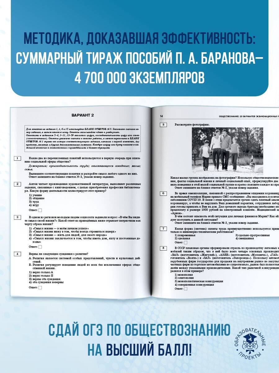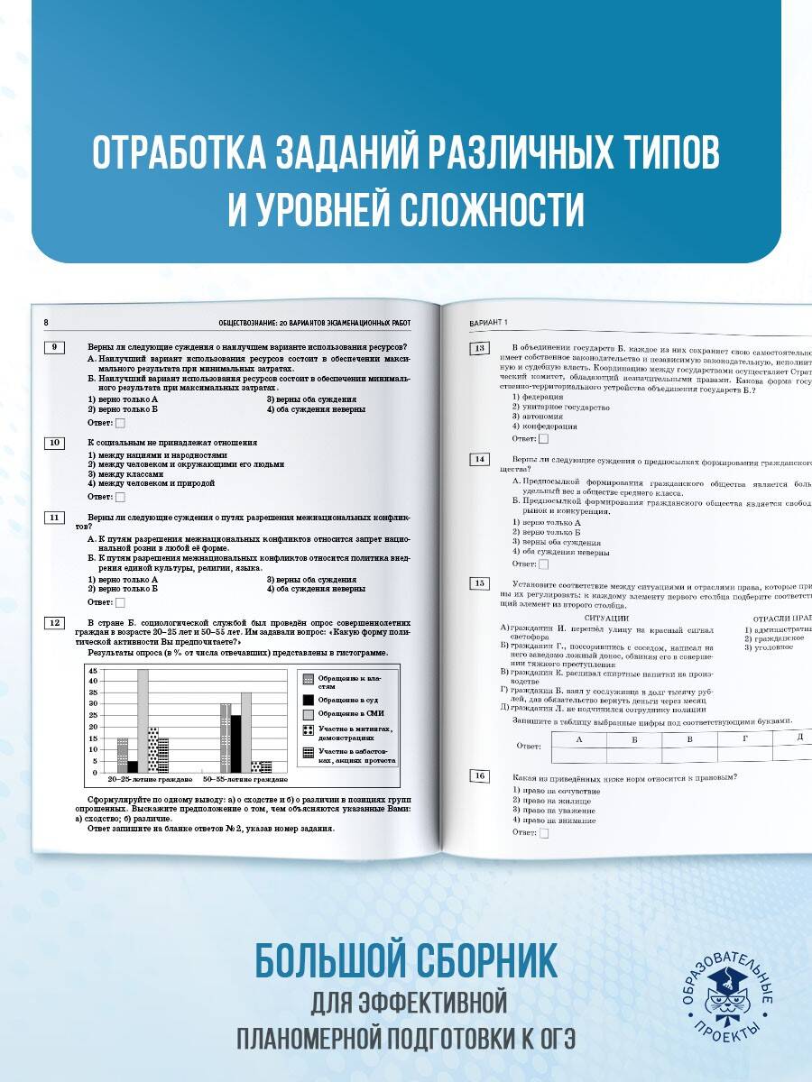 Вниманию выпускников 9 классов общеобразовательных организаций предлагается учебное пособие для подготовки к основному государственному экзамену (ОГЭ), которое содержит 20 типовых вариантов экзаменационных работ. Каждый вариант включает задания разных типов и уровня сложности по всем содержательным блокам-модулям курса обществознания: "Человек и его социальное окружение", "Общкство, в котором мы живём, Человек в современном изменяющемся мире", "Человек в мире культуры", "Человек в экономических отношенияхКо всем заданиям даны ответы или их основное содержание., "Человек в системе социальных отношений. "Социальные ценности и нормы", "Человек в политическом измерении", "Гражданин и государство", Человек как участник правовых отношений".
