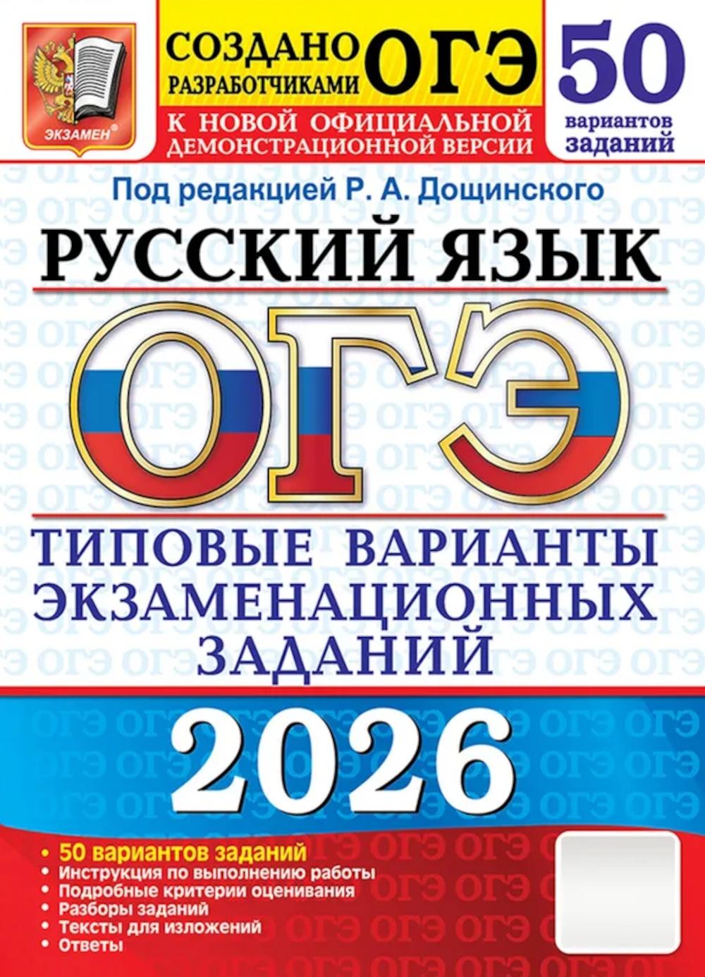 Авторы заданий - ведущие учёные, преподаватели и методисты, принимающие непосредственное участие в разработке контрольных измерительных материалов ОГЭ. Пособие содержит 50 типовых вариантов экзаменационных заданий по русскому языку. Все задания составлены с учётом особенностей и требований Основного государственного экзамена, полностью соответствуют демонстрационному варианту, спецификации и кодификатору ОГЭ 2026 года по русскому языку, опубликованным на сайте ФИПИ. Назначение пособия - предоставить возможность обучающимся отработать навыки выполнения экзаменационных заданий, аналогичных заданиям, представленным в демонстрационной версии ОГЭ по русскому языку. Пособие адресовано учителям для подготовки учащихся к ОГЭ, а учащимся-девятиклассникам для самоподготовки и самоконтроля.| Издательство | Экзамен |
