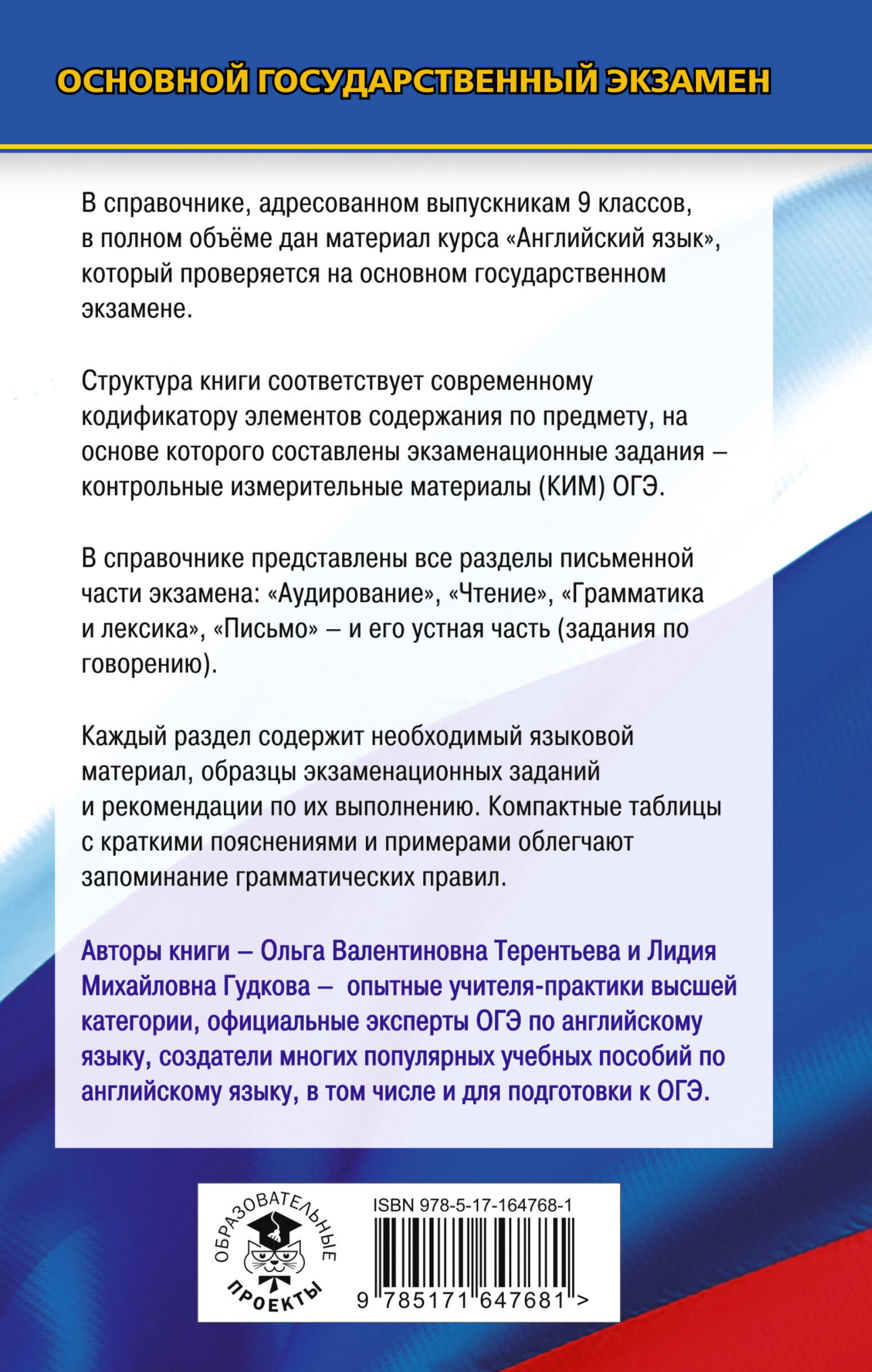 В справочнике, адресованном выпускникам 9 классов, в полном объеме дан материал курса "Английский язык", который проверяется на основном государственном экзамене. Структура книги соответствует современному кодификатору элементов содержания по предмету, на основе которого составлены экзаменационные задания - контрольные измерительные материалы (КИМ) ОГЭ. В справочнике представлены все разделы письменной части экзамена: "Аудирование", "Чтение", "Грамматика и лексика", "Письмо" - и его устная часть (задания по говорению в новом формате). Каждый раздел содержит необходимый языковой материал, образцы экзаменационных заданий и рекомендации по их выполнению. Компактные таблицы с краткими пояснениями и примерами облегчают запоминание грамматических правил.| Издательство | Издательство "АСТ" |