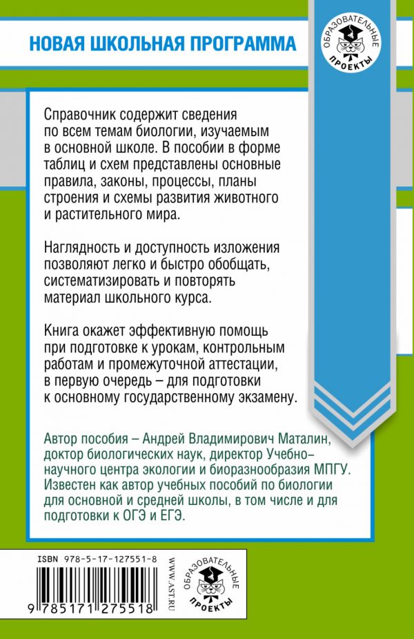 Справочник включает все основные темы школьного курса биологии для 6-9 классов и соответствует Федеральному государственному образовательному стандарту (ФГОС) основного образования.
