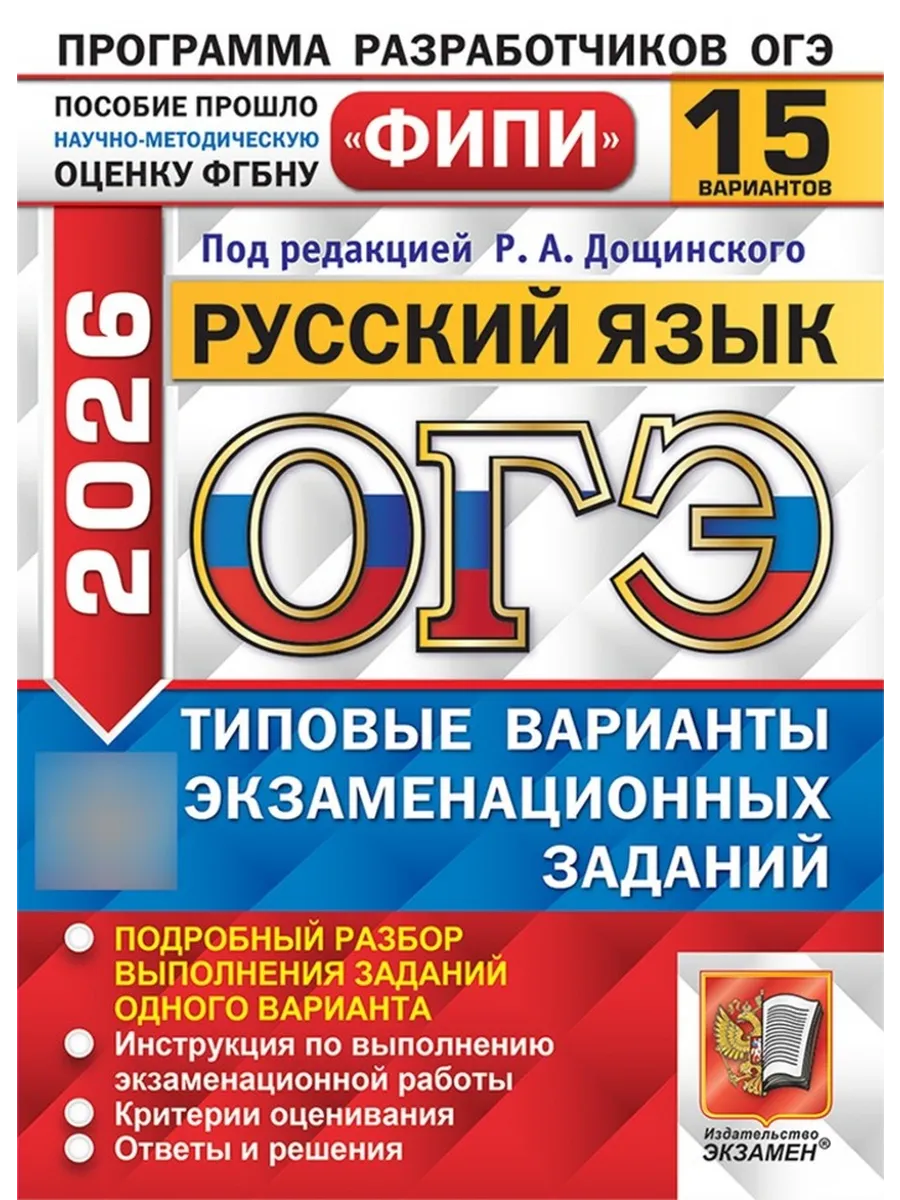ОГЭ 2026. РУССКИЙ ЯЗЫК. 15 ВАРИАНТОВ. ТИПОВЫЕ ВАРИАНТЫ ЭКЗАМЕНАЦИОННЫХ ЗАДАНИЙ. 15 вариантов заданий. Подробный разбор выполнения заданий одного варианта. Инструкция по выполнению экзаменационной работы. Критерии оценивания. Ответы и решения.| Издательство | Издательство «Экзамен» |